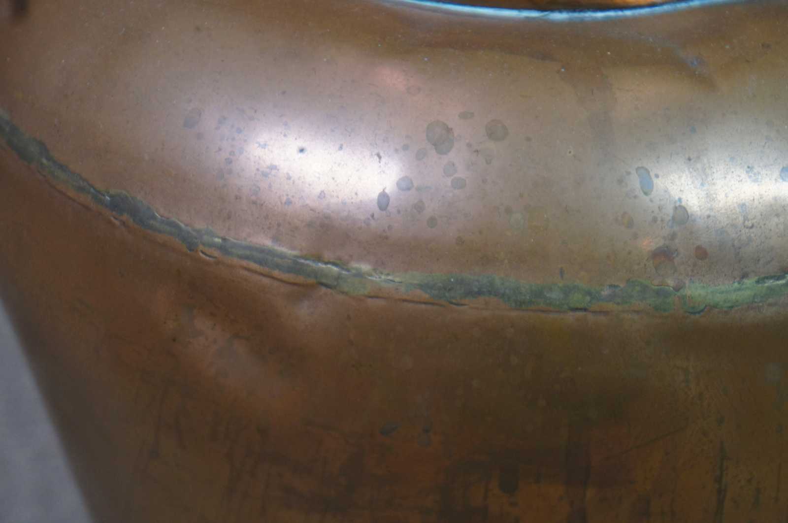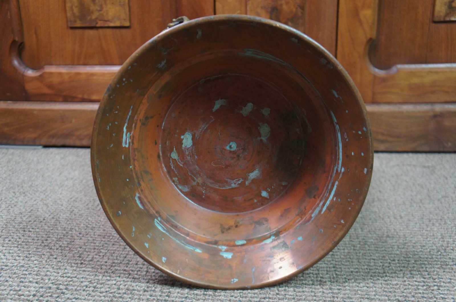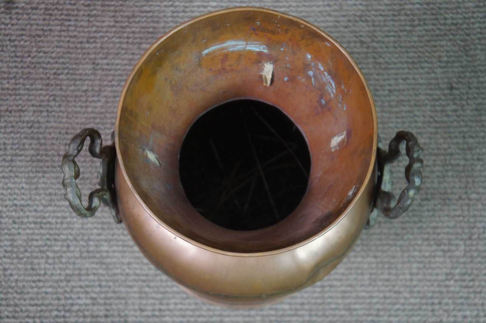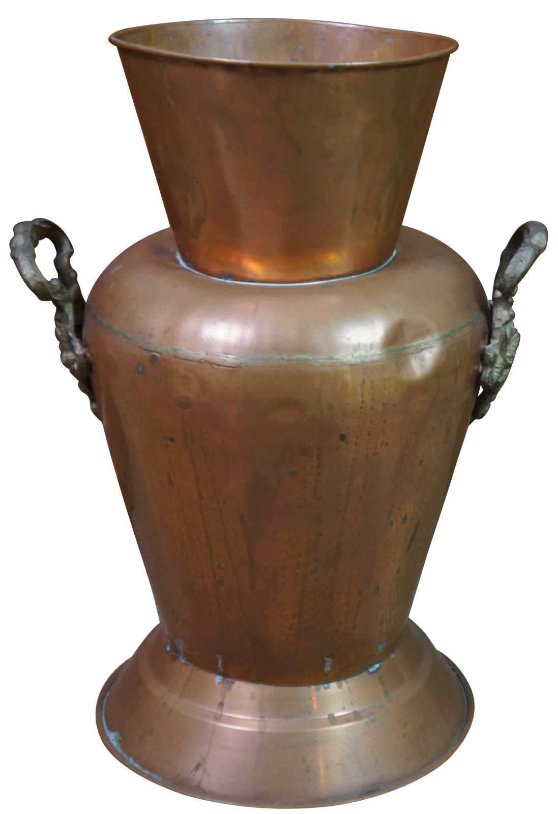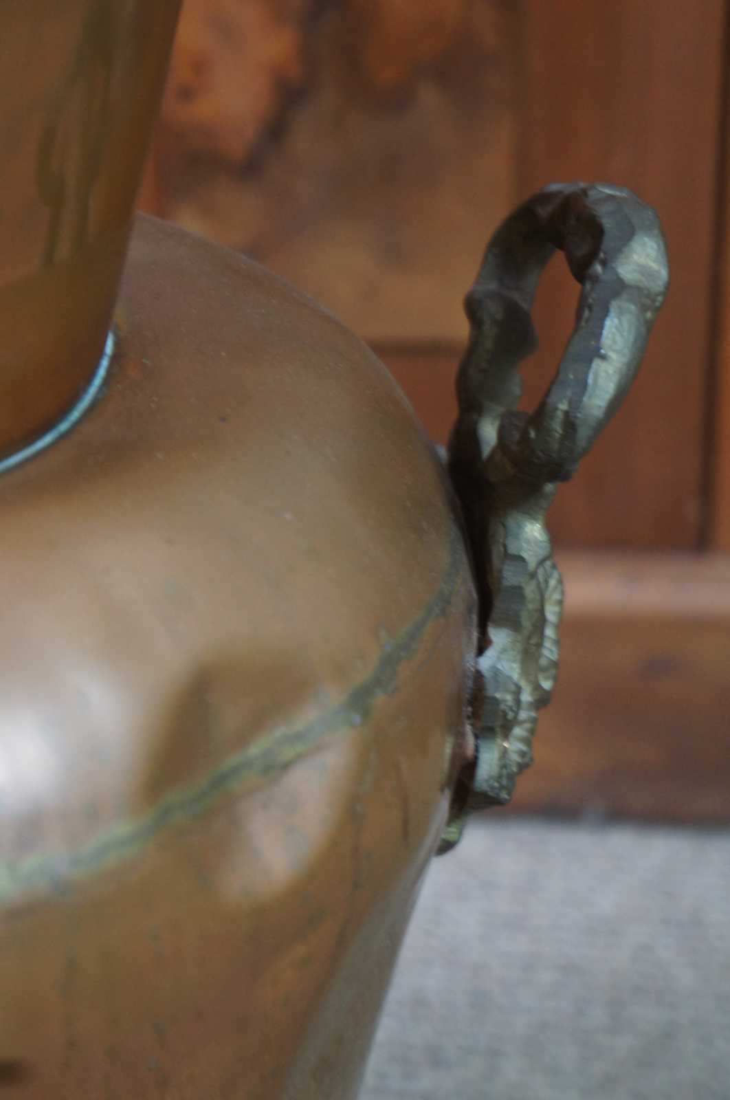 Antique Victorian dovetailed copper floor vase, urn or planter with molded brass handles.