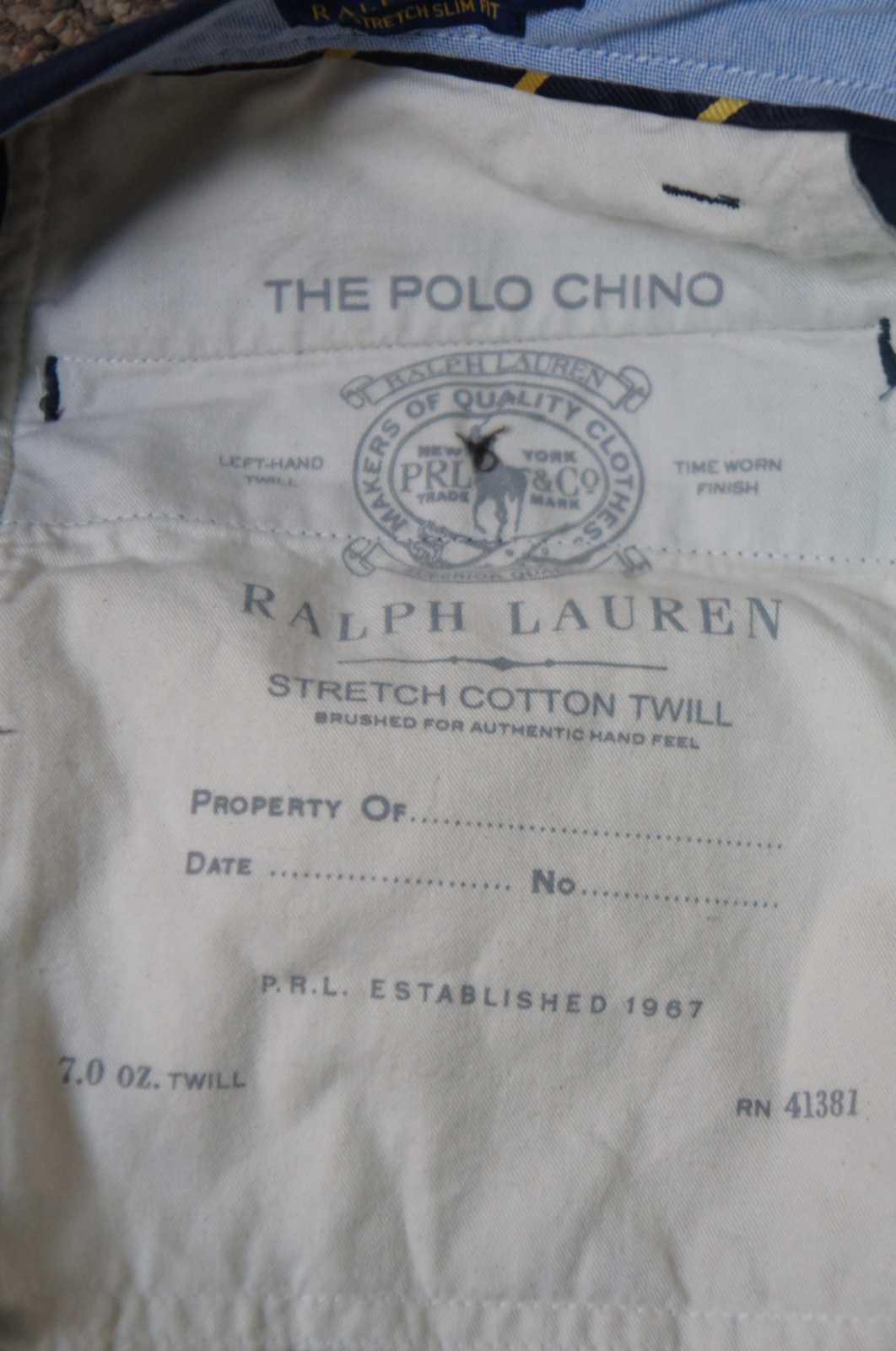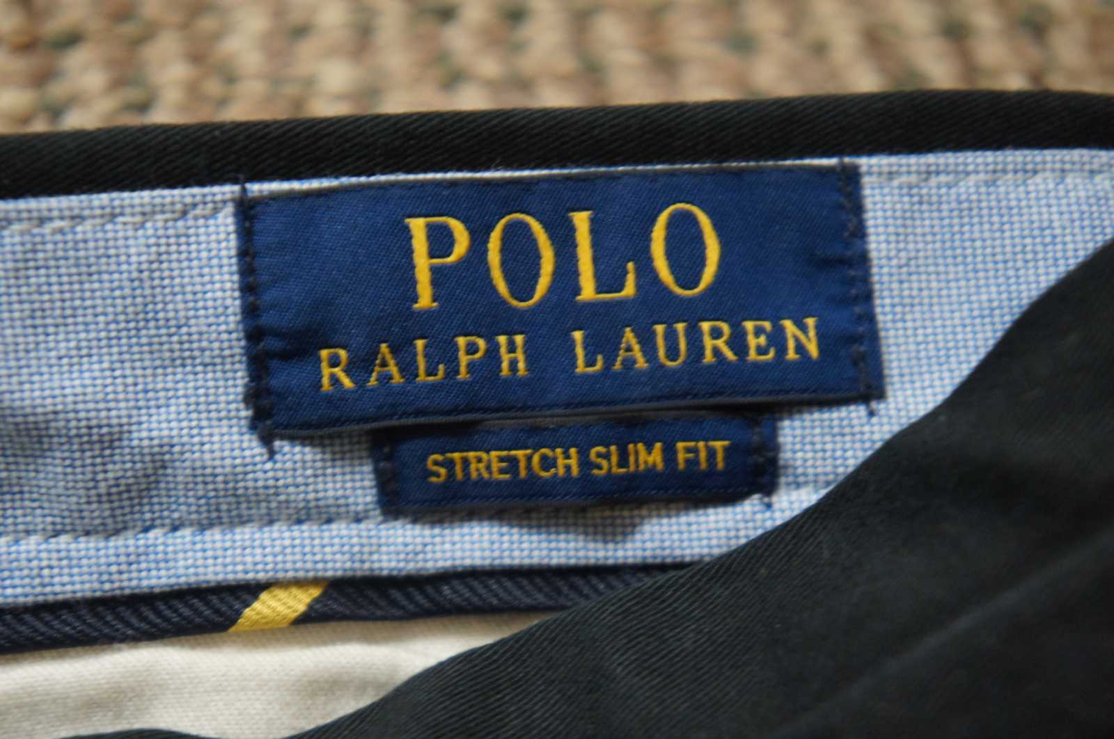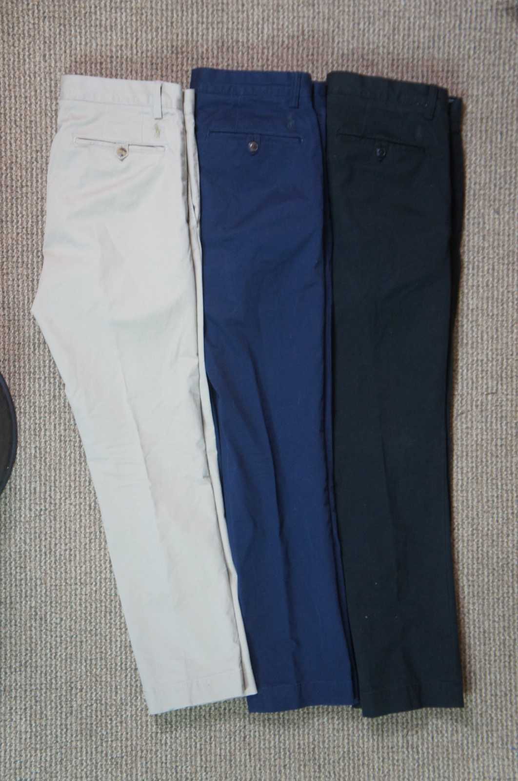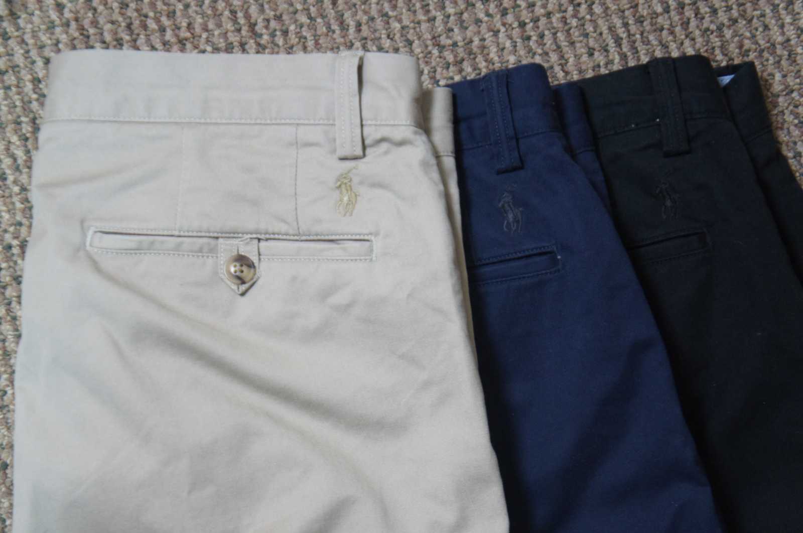 Set of three Polo Ralph Lauren Stretch Cotton Twill, Slim Fit men’s chino pants in black, navy, and beige.