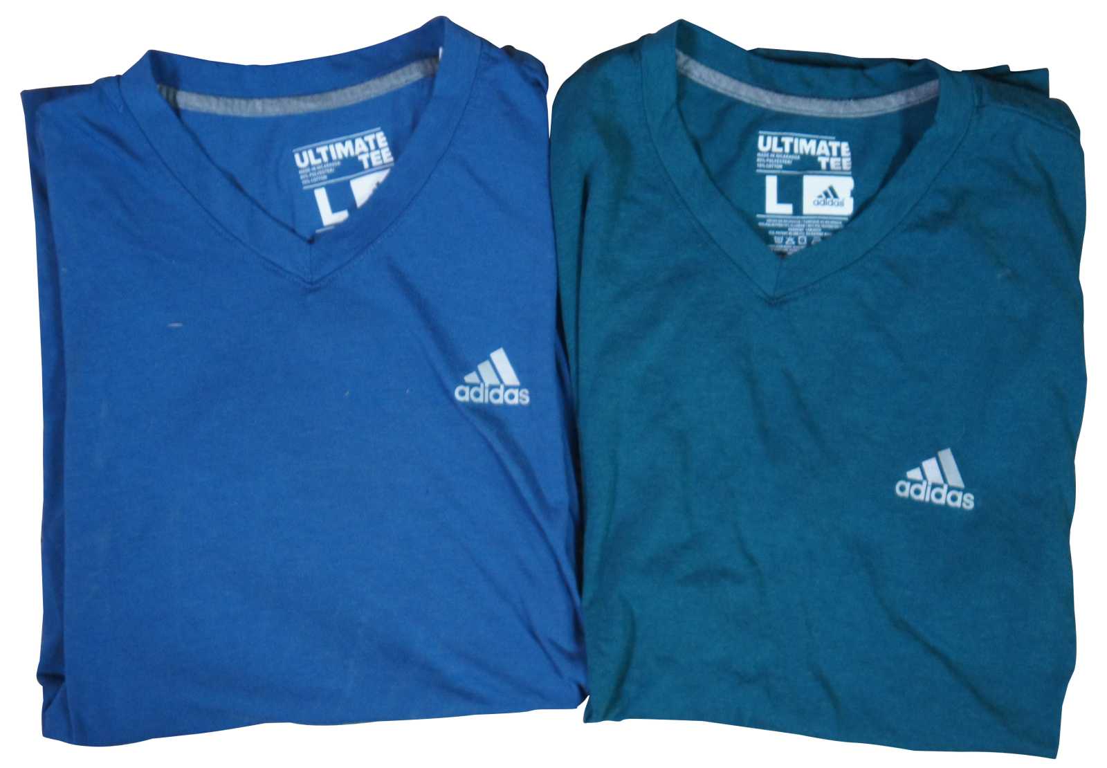 Set of 2 Adidas Climalite Ultimate Tee men’s short sleeve t-shirts in blue and teal.