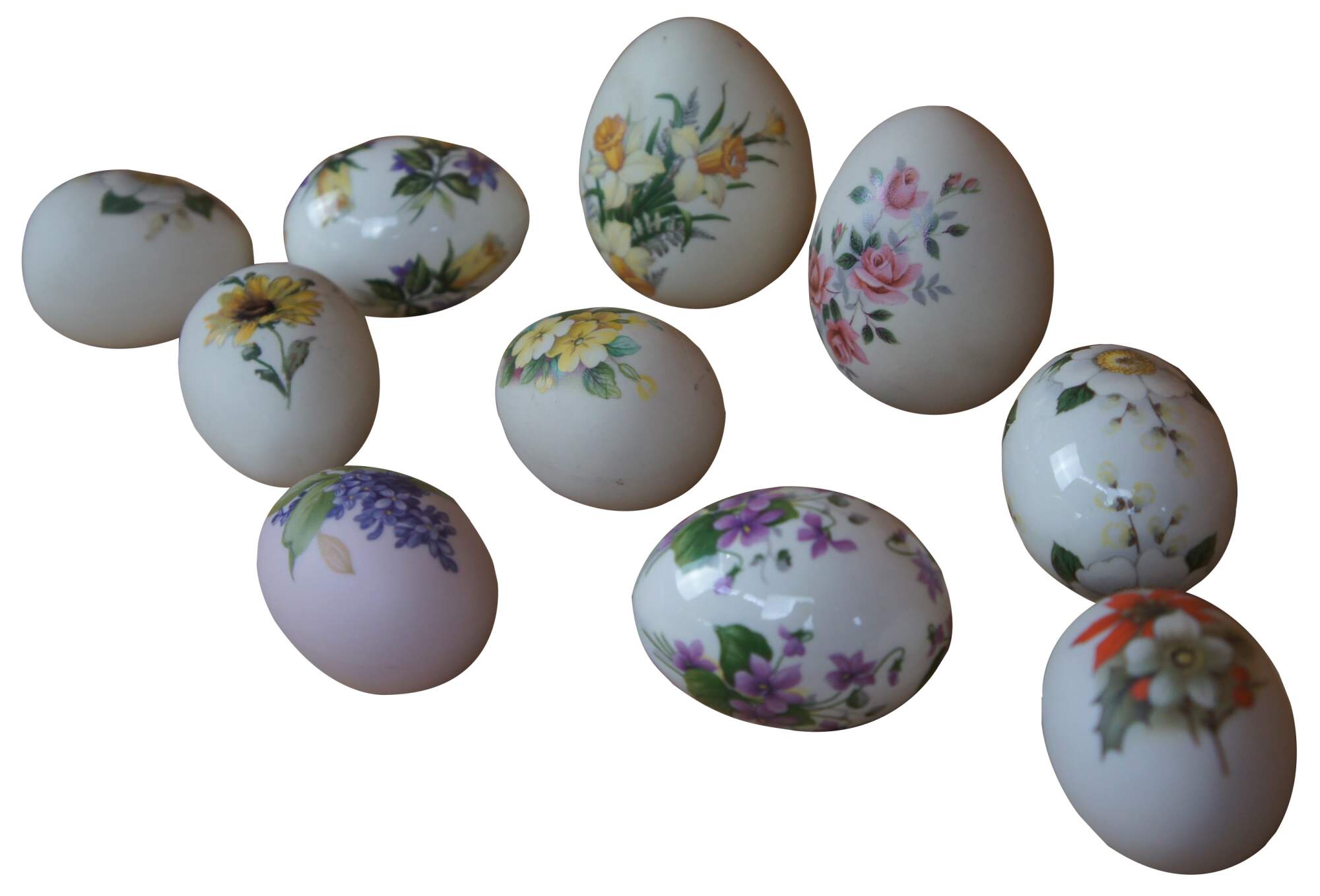 This lot of 10 decorative ceramic eggs feature a variety of floral designs, including buttercups, daisies, hyacinths and roses.