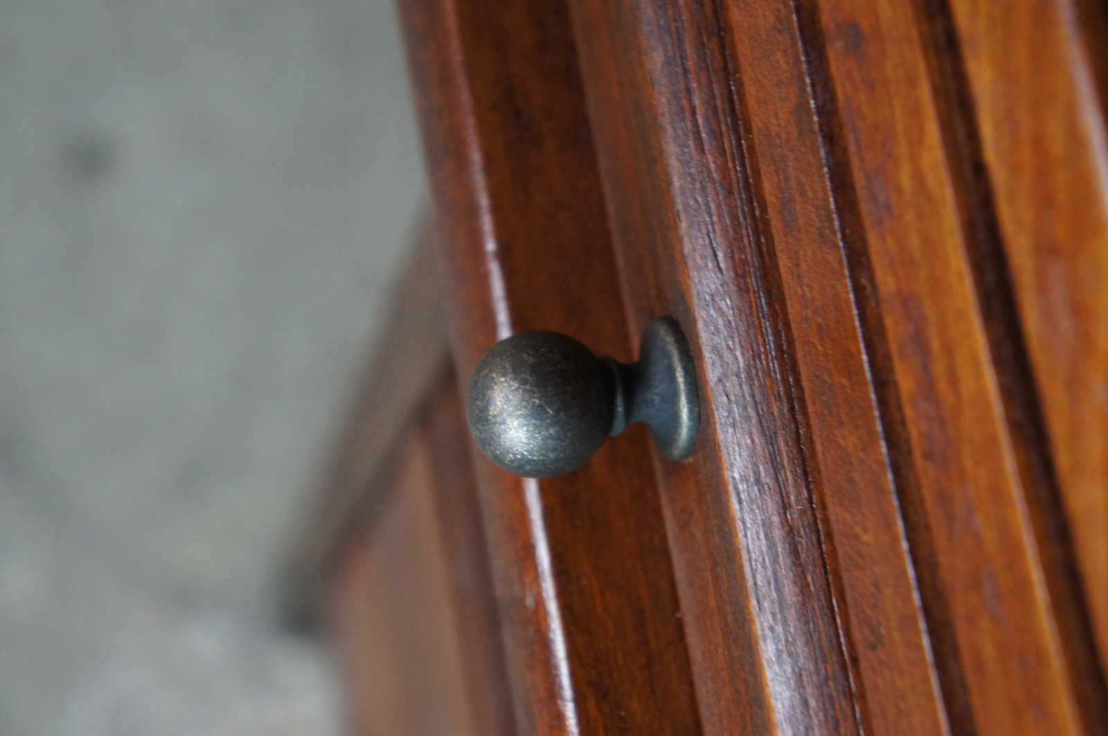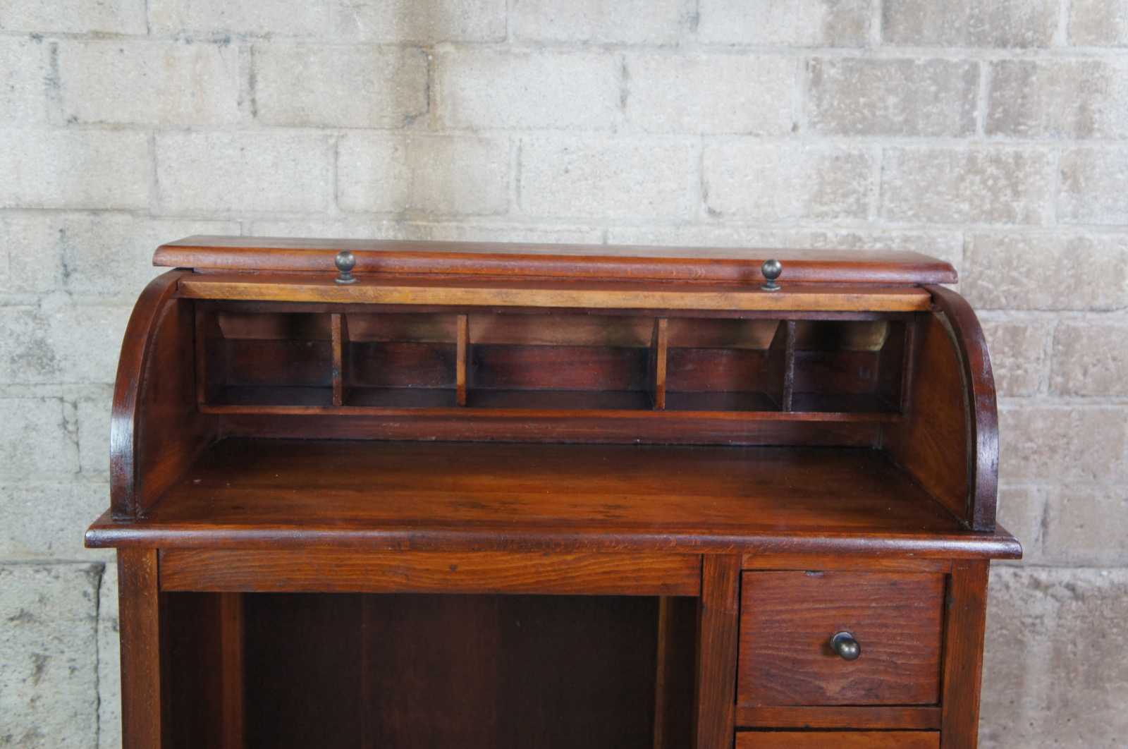 Antique Victorian childs roll top writing desk featuring three drawers, a half cylinder roll top and interior cubbies.