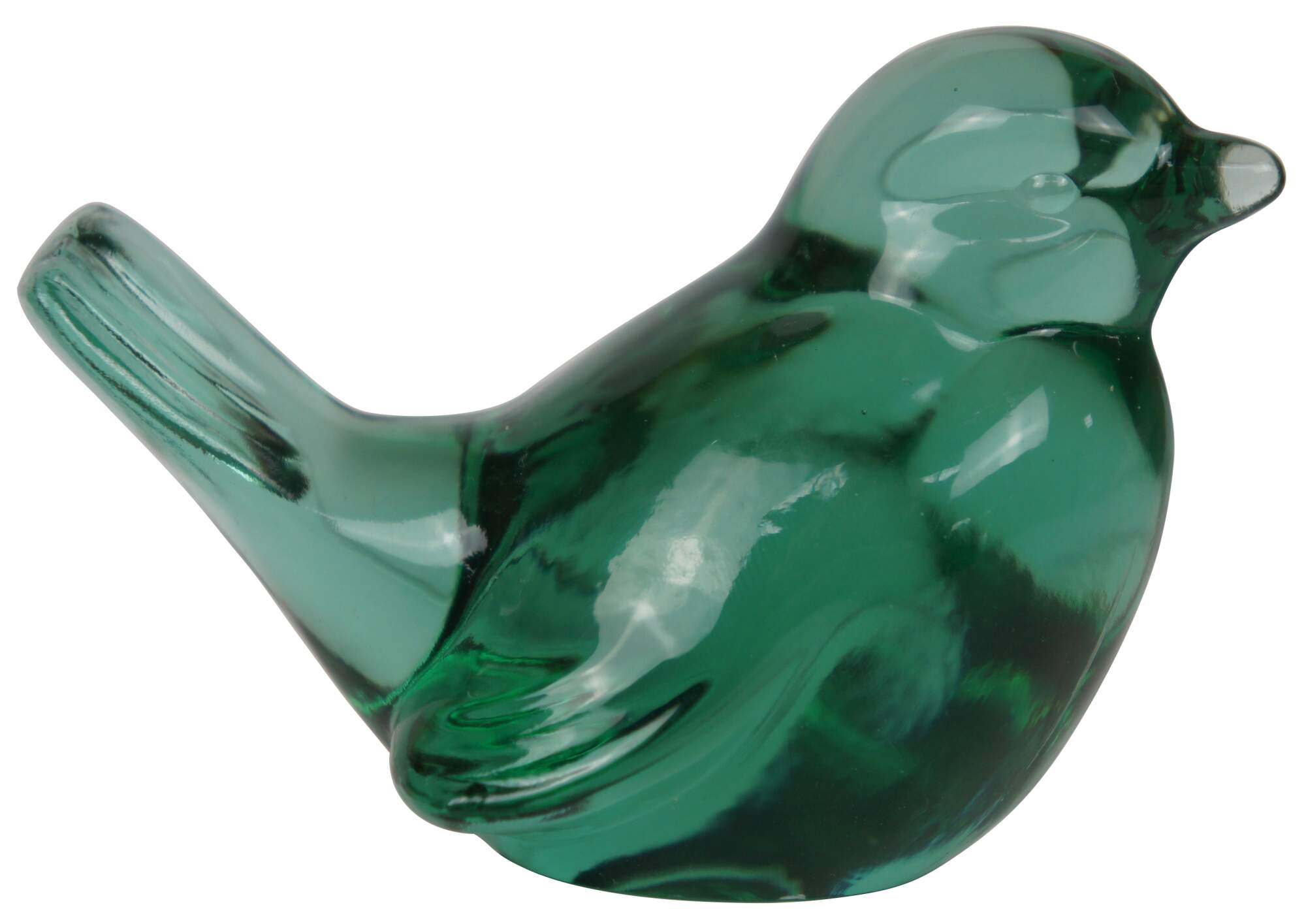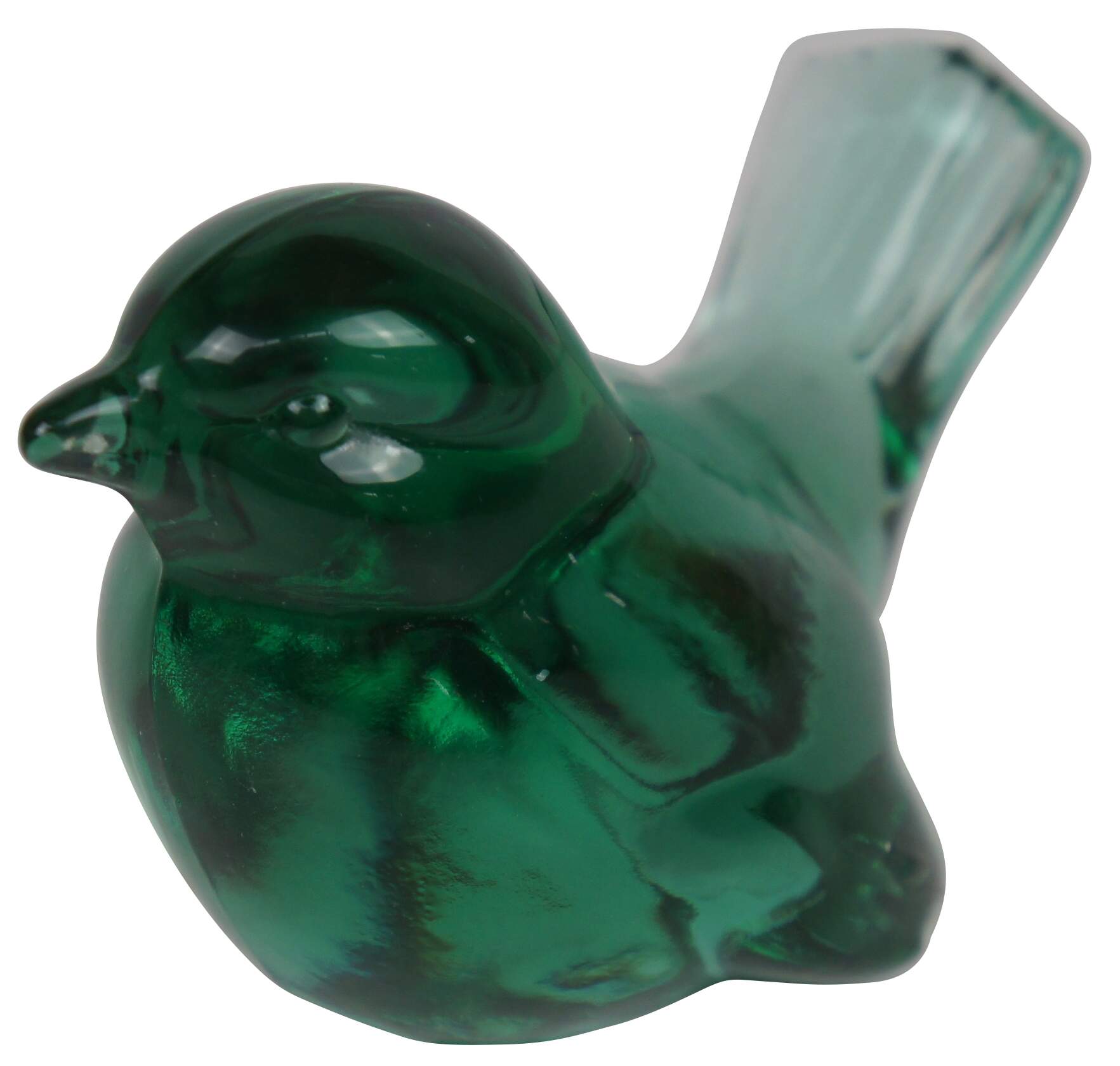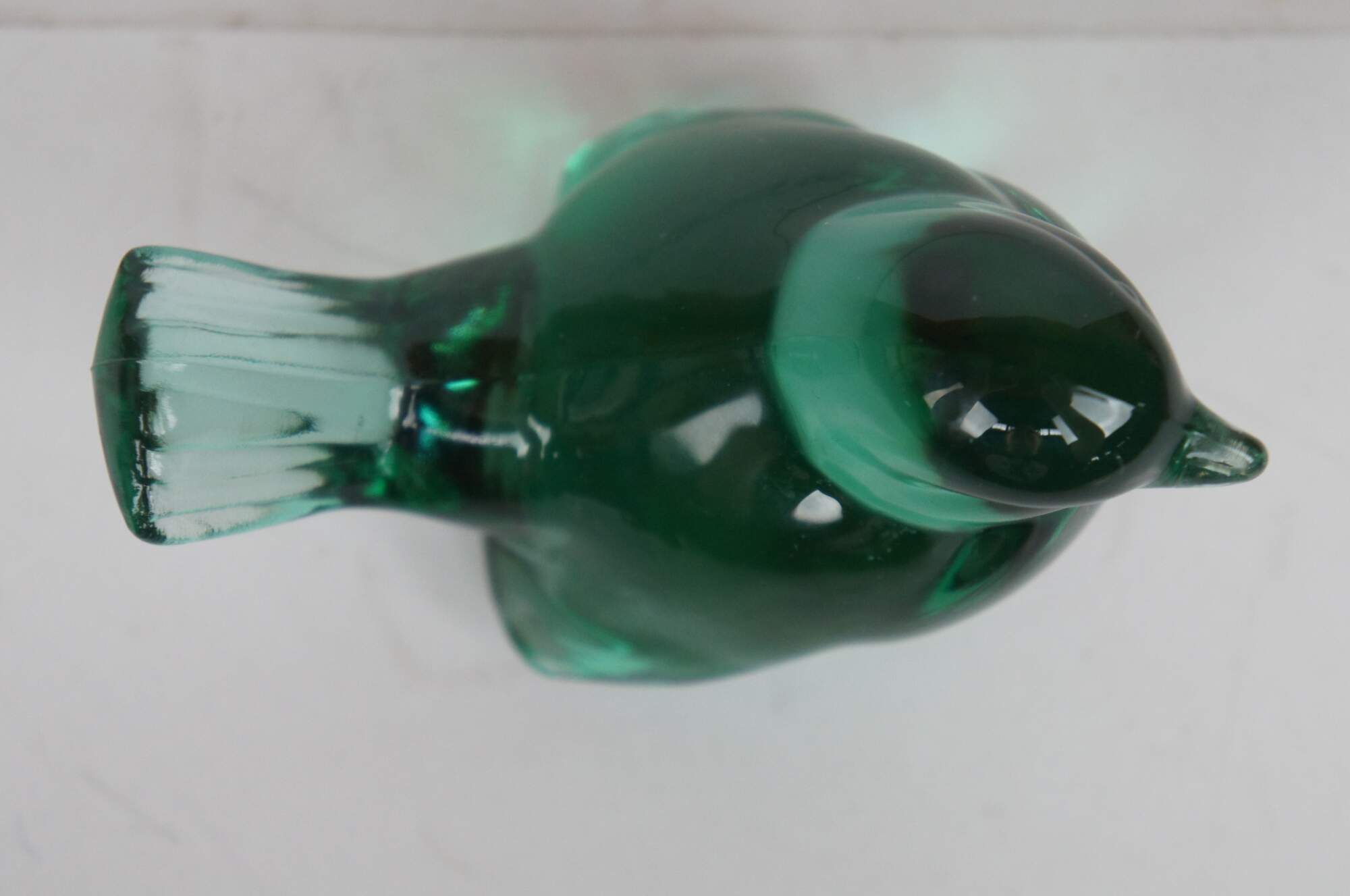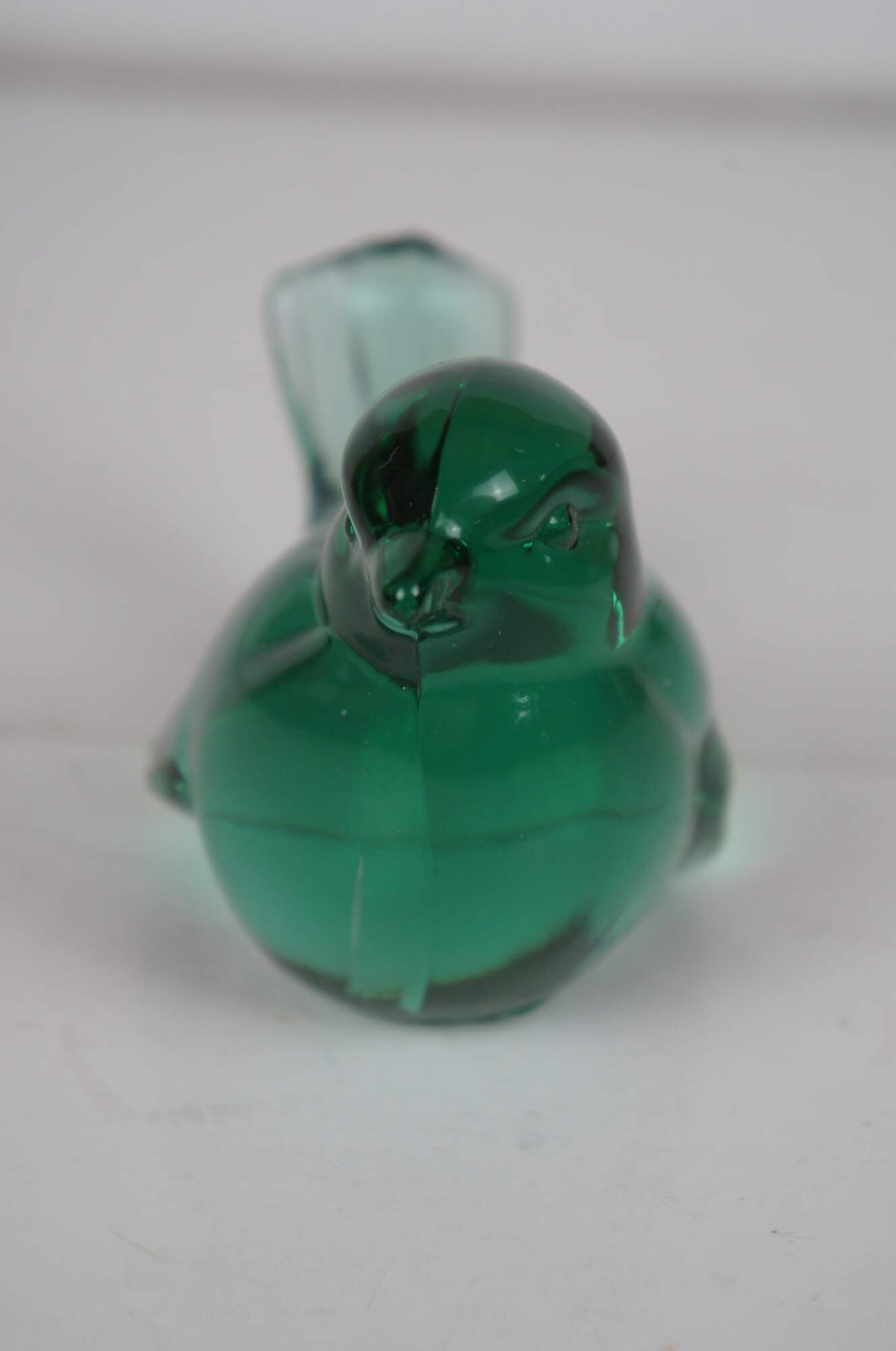 Delicate songbird made of green glass by Fenton Art Glass Company.