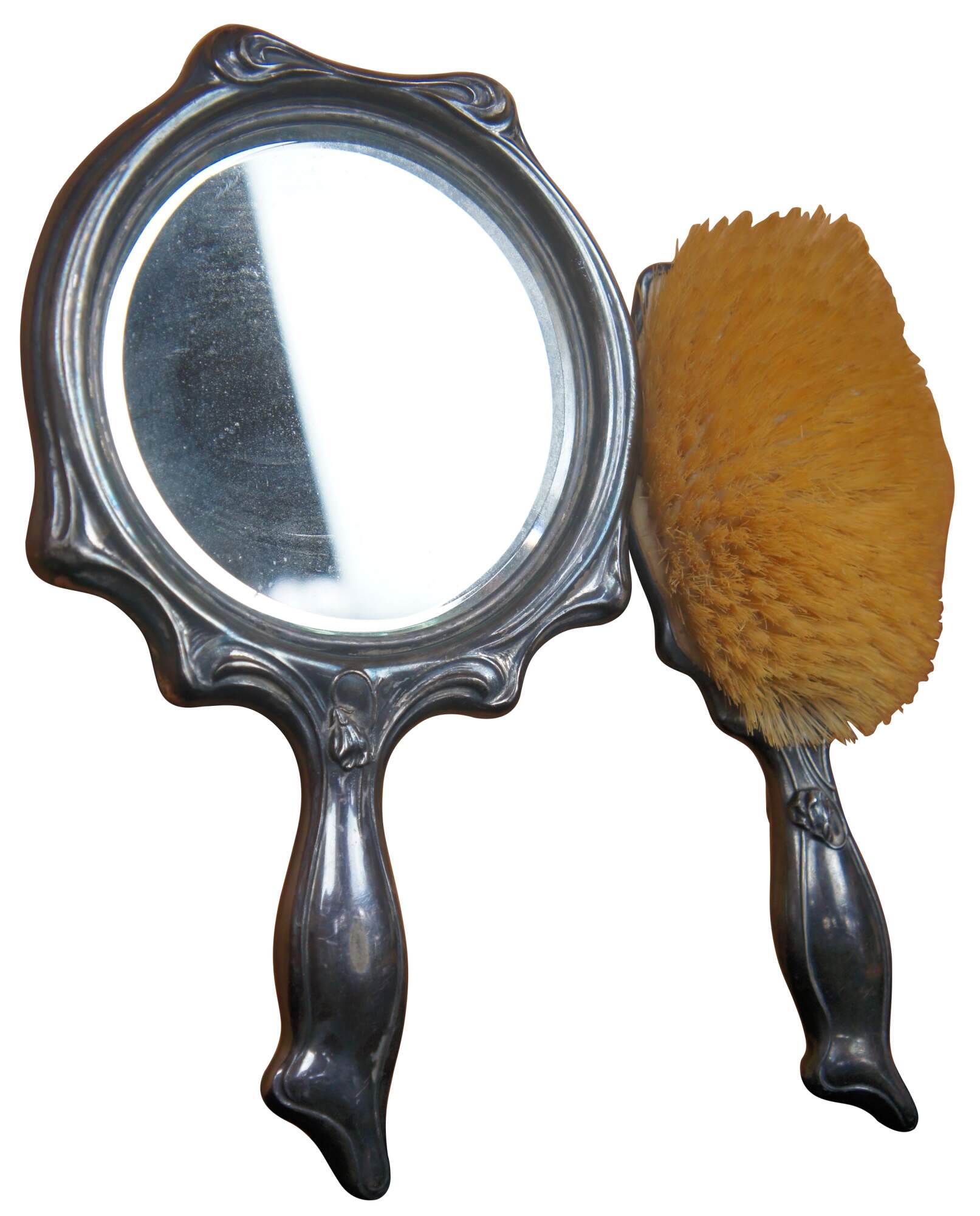 Vintage Art Nouveau ornate silver plate hand mirror and brush monogrammed with ESR. Beautiful repousse with low relief design.
