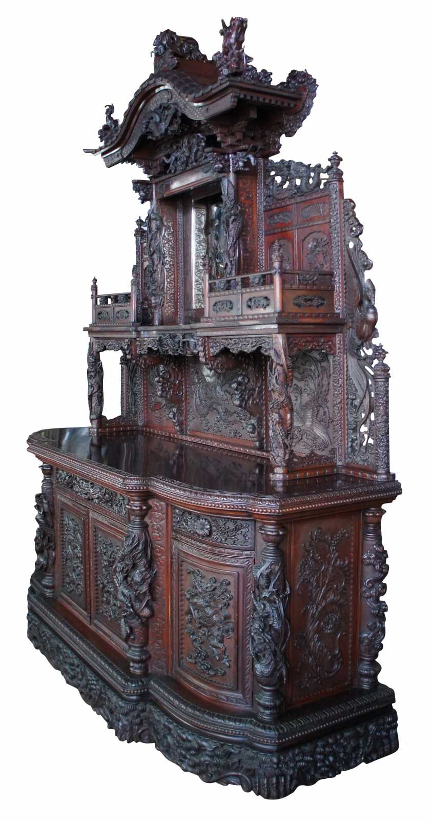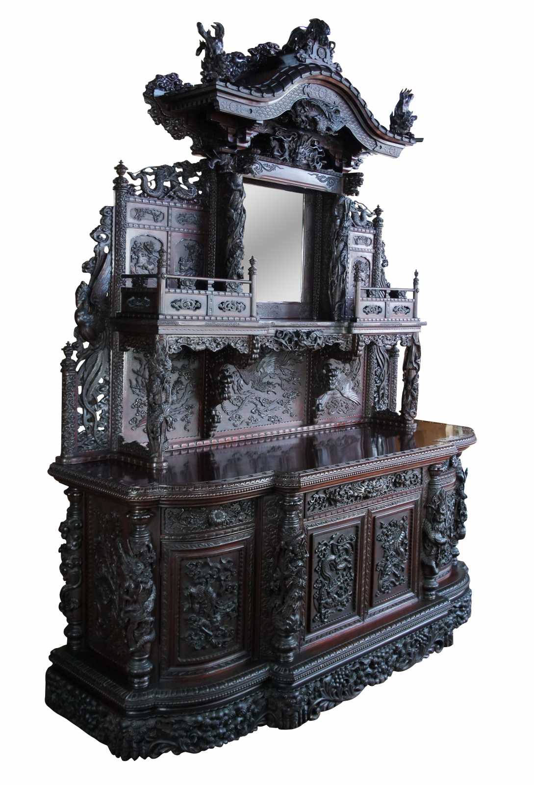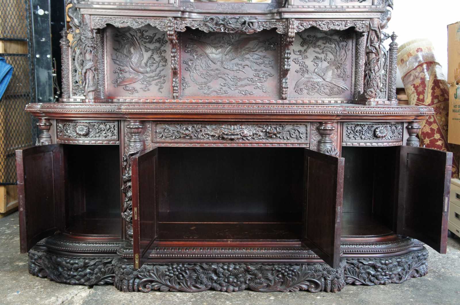 Important 19th C. Japanese Meiji Period ornately carved extreme high relief, credenza or bar back. Meticulously designed with one of a kind tooling. A breakfront form with three drawers over lower cabinets, topped by a hutch with shelves and central mirror. Features a dragon or serpent theme, phoenix's, elephants, foo dogs and pierced foliate placed throughout. Amongst the animals is the Imperial (Mons) seal of Japan or Chrysanthemum, emblazoned along drawer handles and within scenes, Charismatic 3-D carvings ordain all surfaces with robust columns at the forefront. Aprons are accented by beading, gadrooning and Japanese Greek key. The pagoda form crown is topped by an intriguing dragon looking down over a chrysanthemum medallion while holding the crown of the cabinet in its mouth. Flanked by two spectacular guardian lions. A masterpiece that would have been made for and limited to a member of the Royal Family/ Imperial House of Japan.