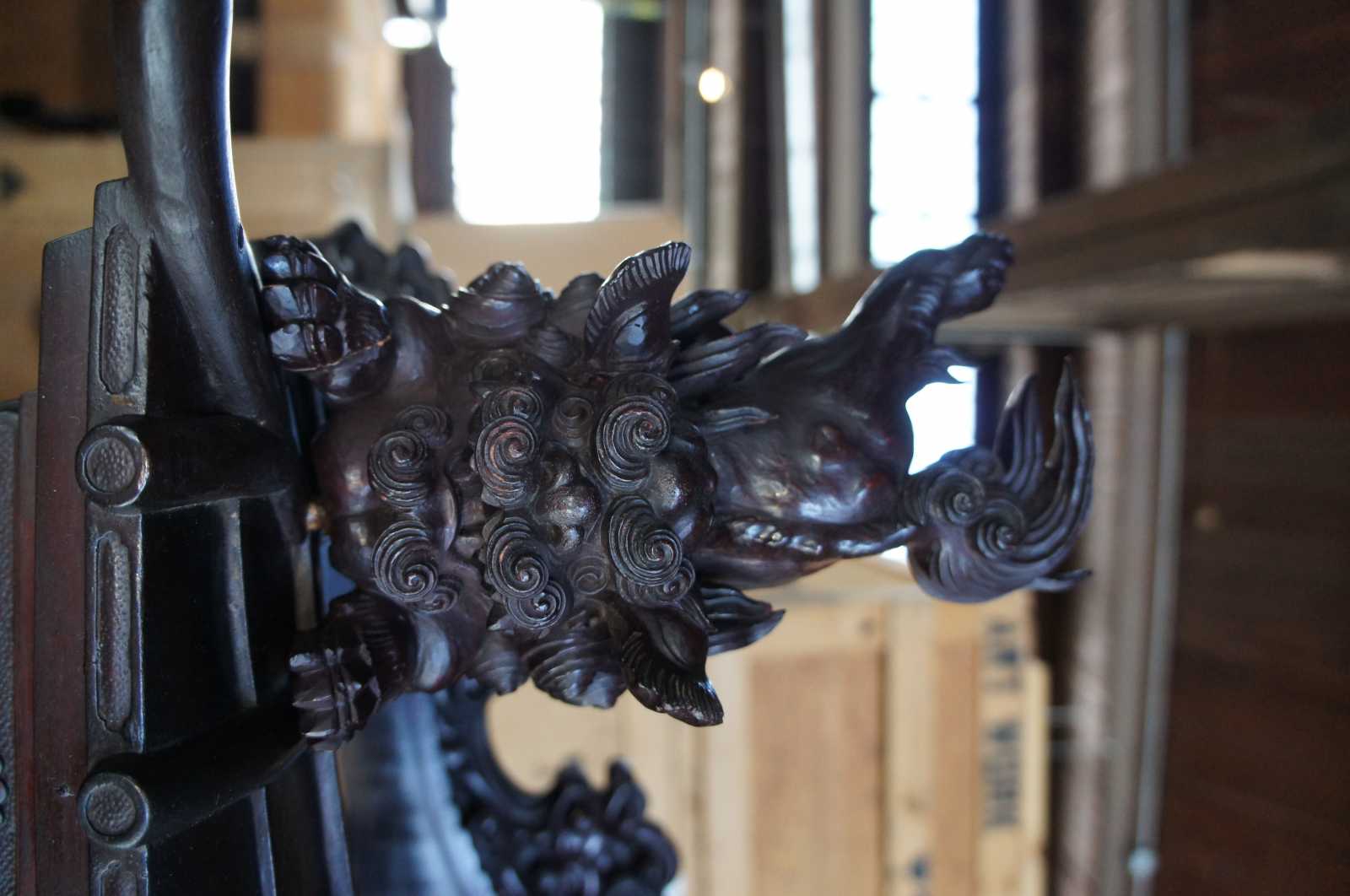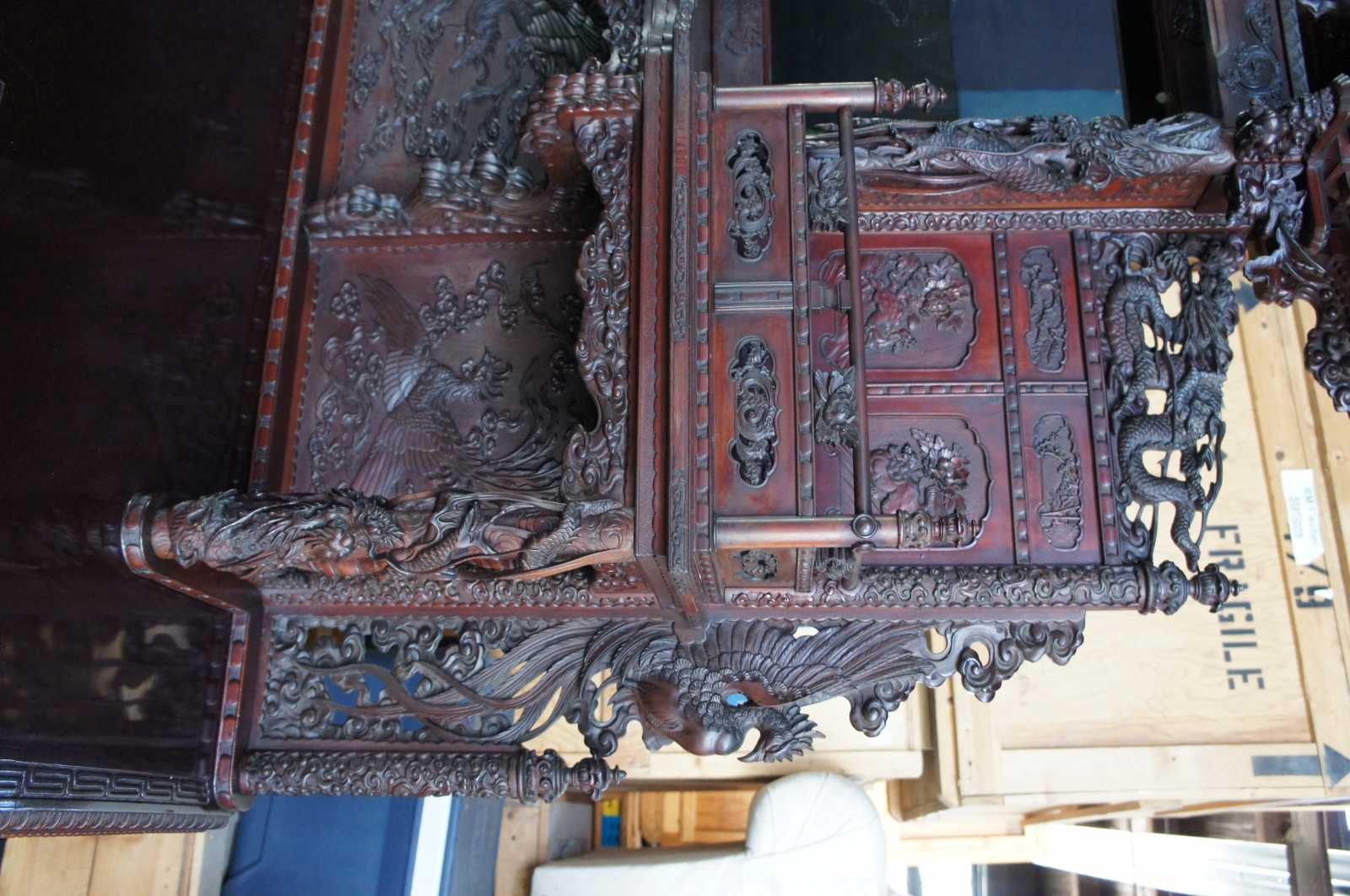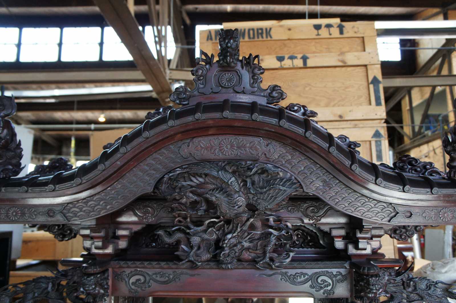 Important 19th C. Japanese Meiji Period ornately carved extreme high relief, credenza or bar back. Meticulously designed with one of a kind tooling. A breakfront form with three drawers over lower cabinets, topped by a hutch with shelves and central mirror. Features a dragon or serpent theme, phoenix's, elephants, foo dogs and pierced foliate placed throughout. Amongst the animals is the Imperial (Mons) seal of Japan or Chrysanthemum, emblazoned along drawer handles and within scenes, Charismatic 3-D carvings ordain all surfaces with robust columns at the forefront. Aprons are accented by beading, gadrooning and Japanese Greek key. The pagoda form crown is topped by an intriguing dragon looking down over a chrysanthemum medallion while holding the crown of the cabinet in its mouth. Flanked by two spectacular guardian lions. A masterpiece that would have been made for and limited to a member of the Royal Family/ Imperial House of Japan.