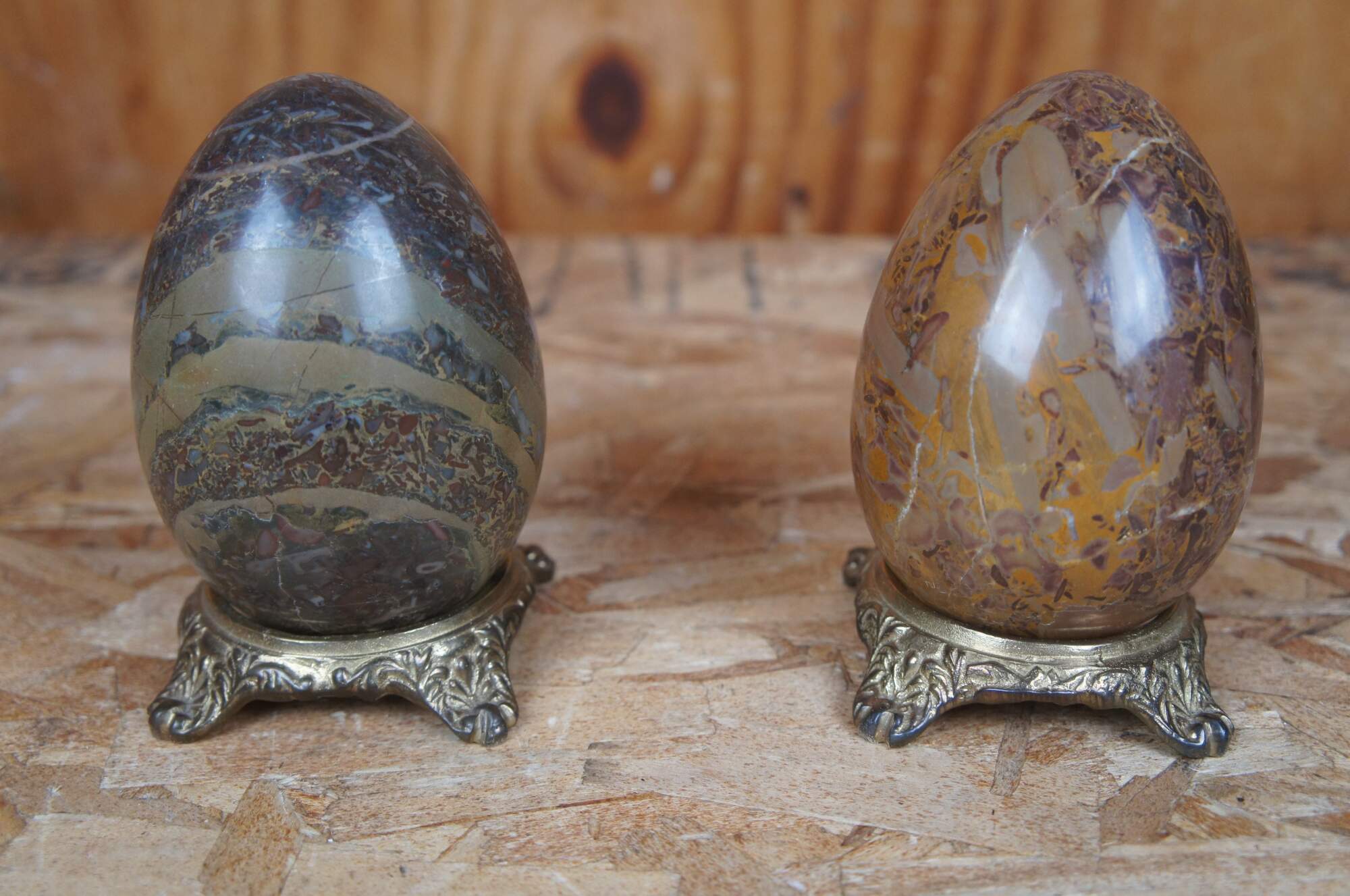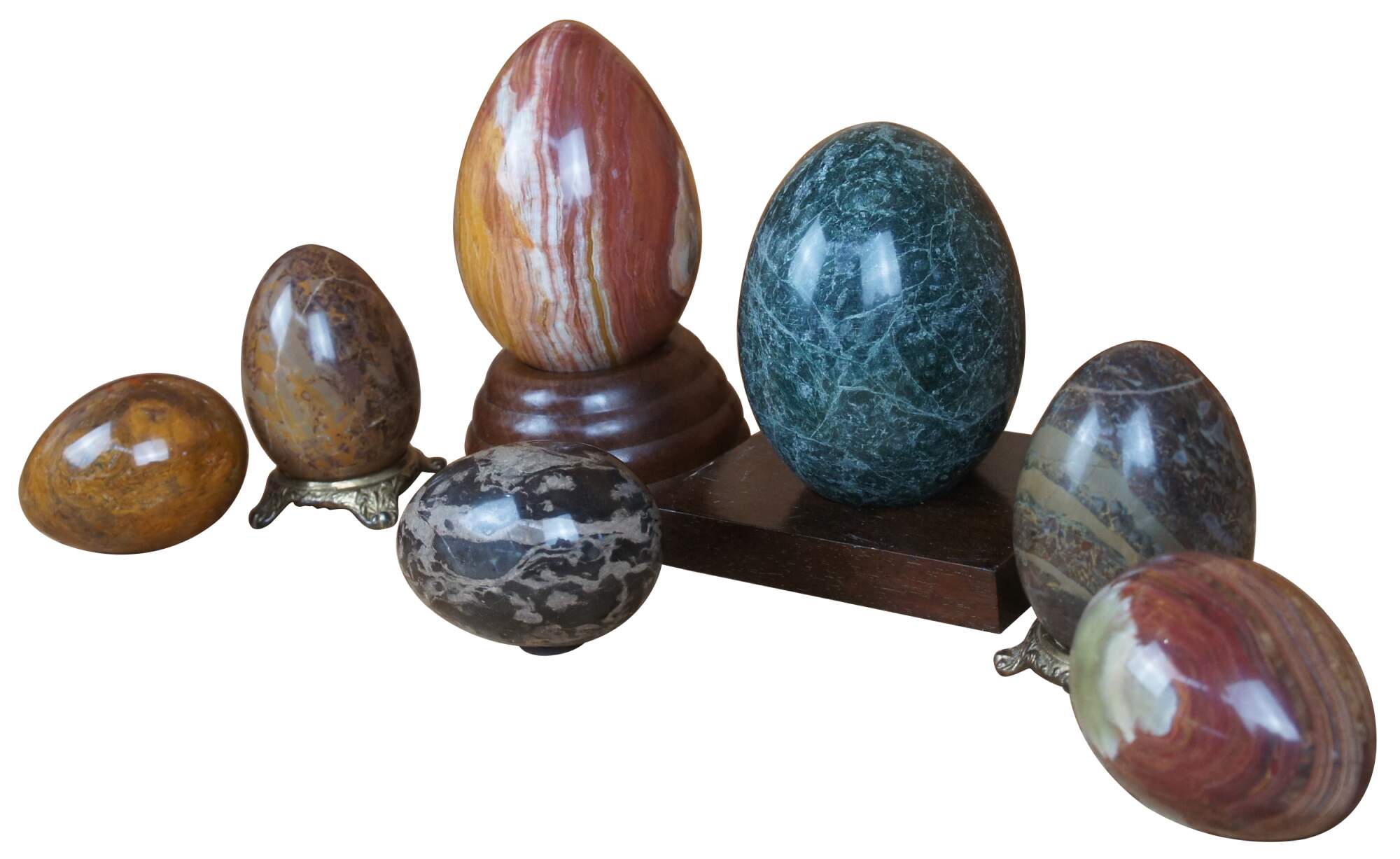 7 large eggs of assorted sizes and materials with wooden and brass stands.