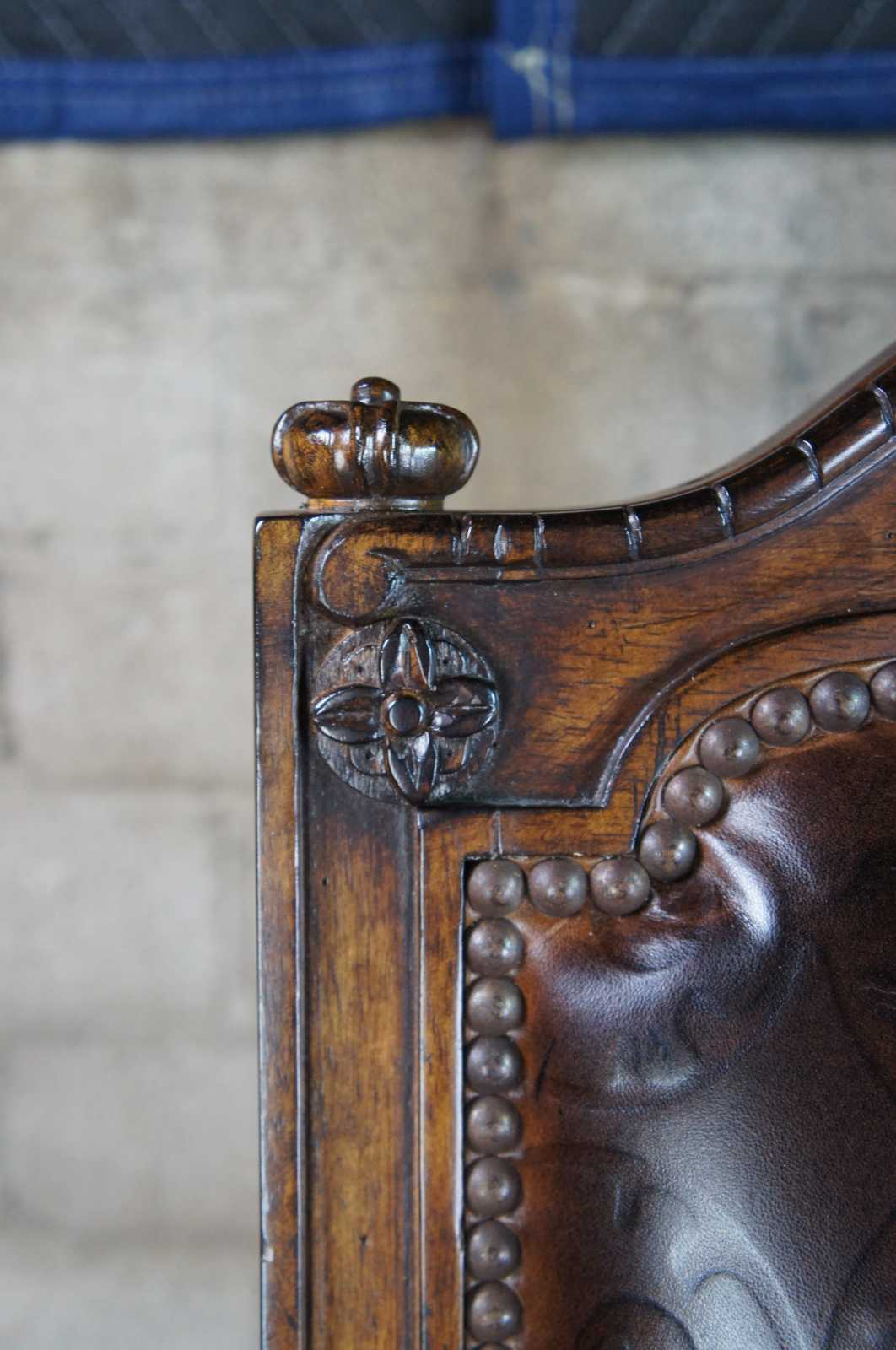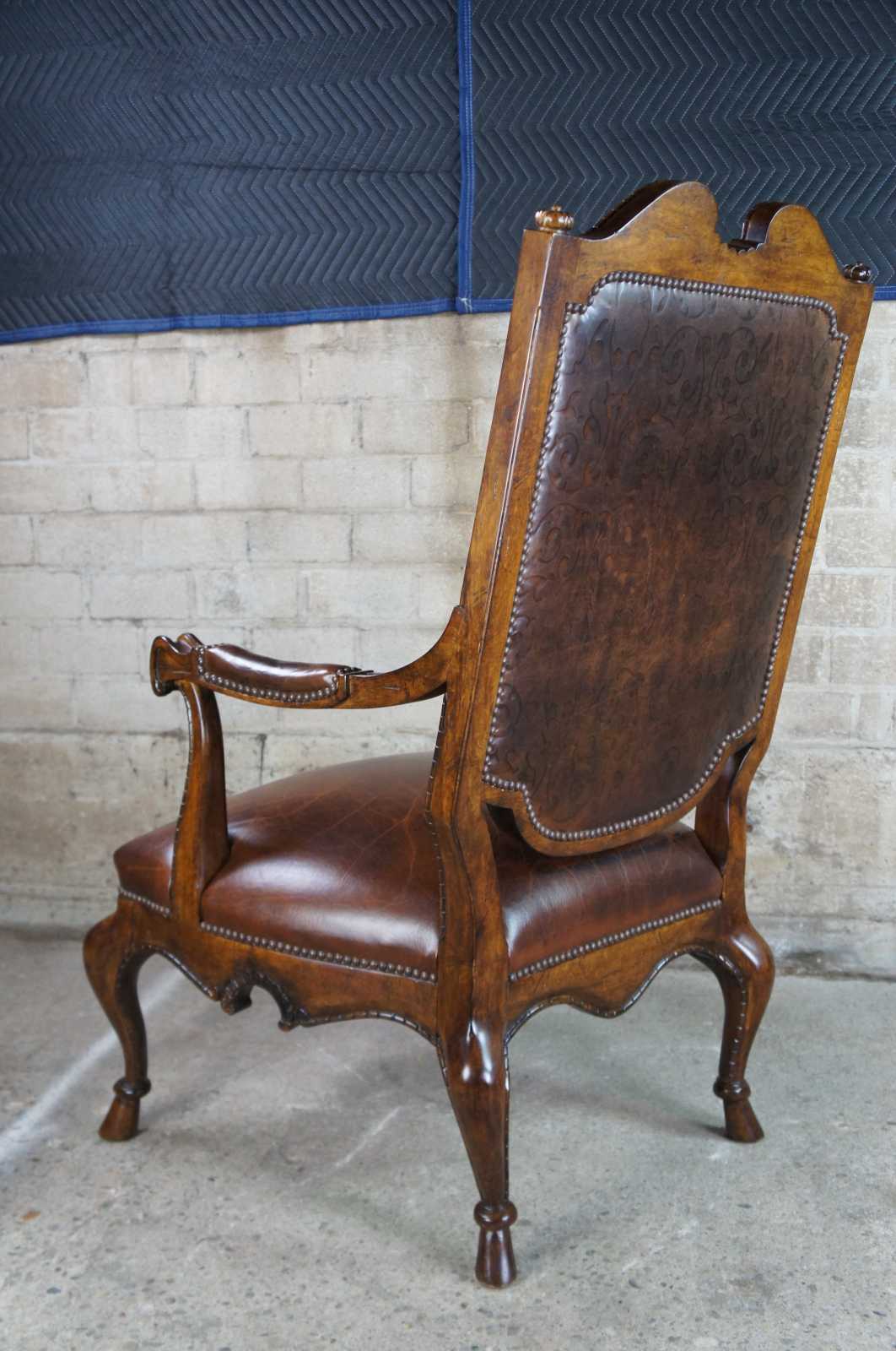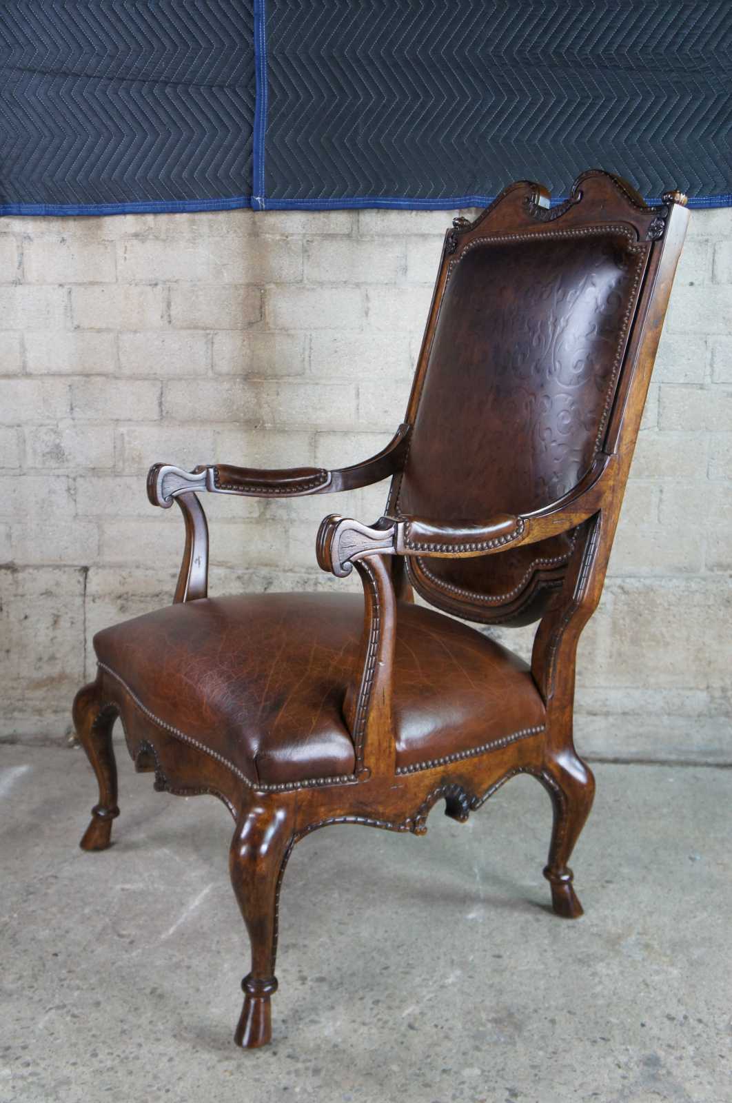 Century Furniture carved occasional armchair, circa 1990s Inspired by French Country styling with a high back and oversized form. Made from walnut with tooled brown leather, nailhead trim, cabrioe legs and hooved / hoof feat. The highback includes an open pediment, french carved medallions and crown shaped finials. Great for use as a desk chair or a statement piece. #3217