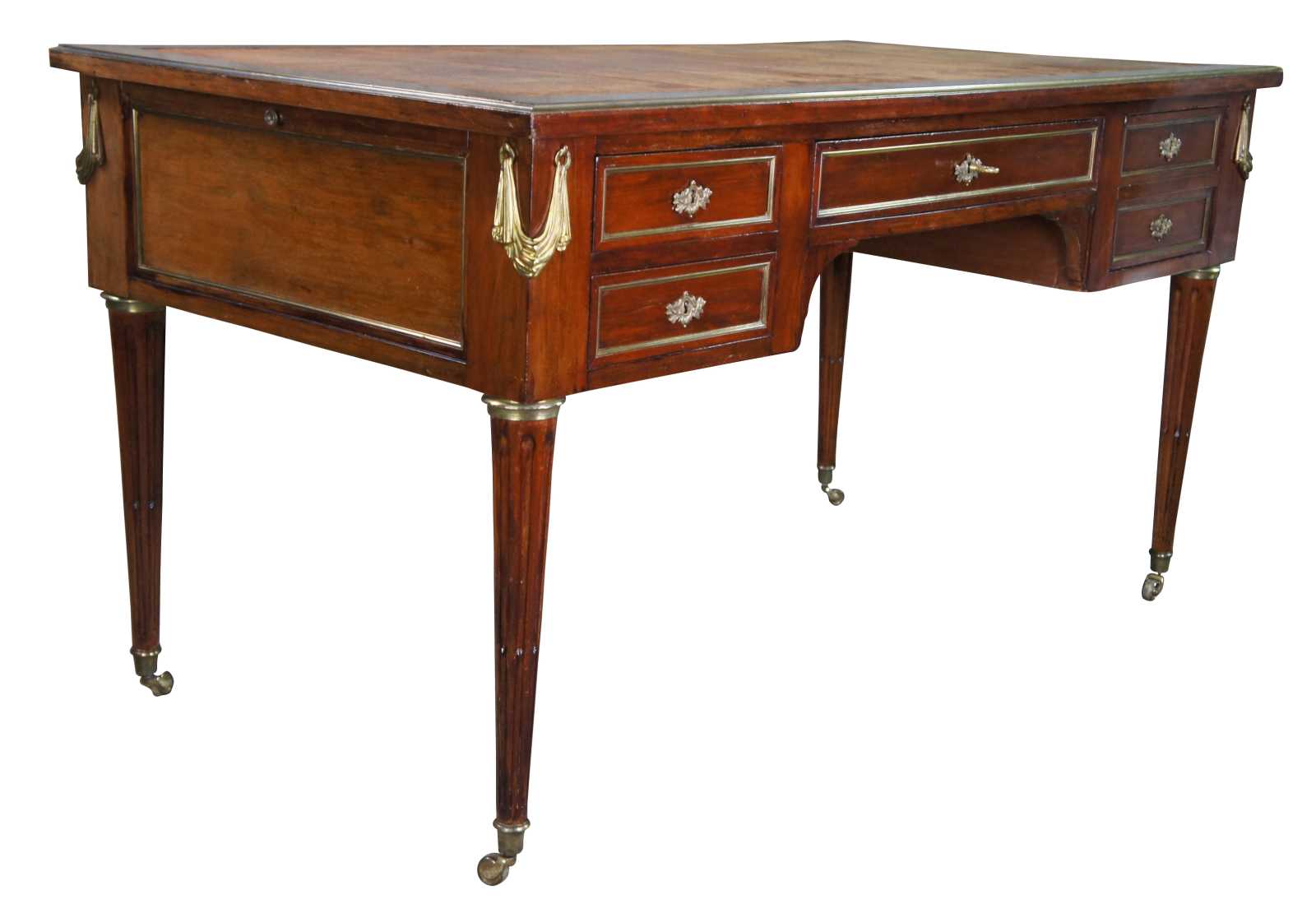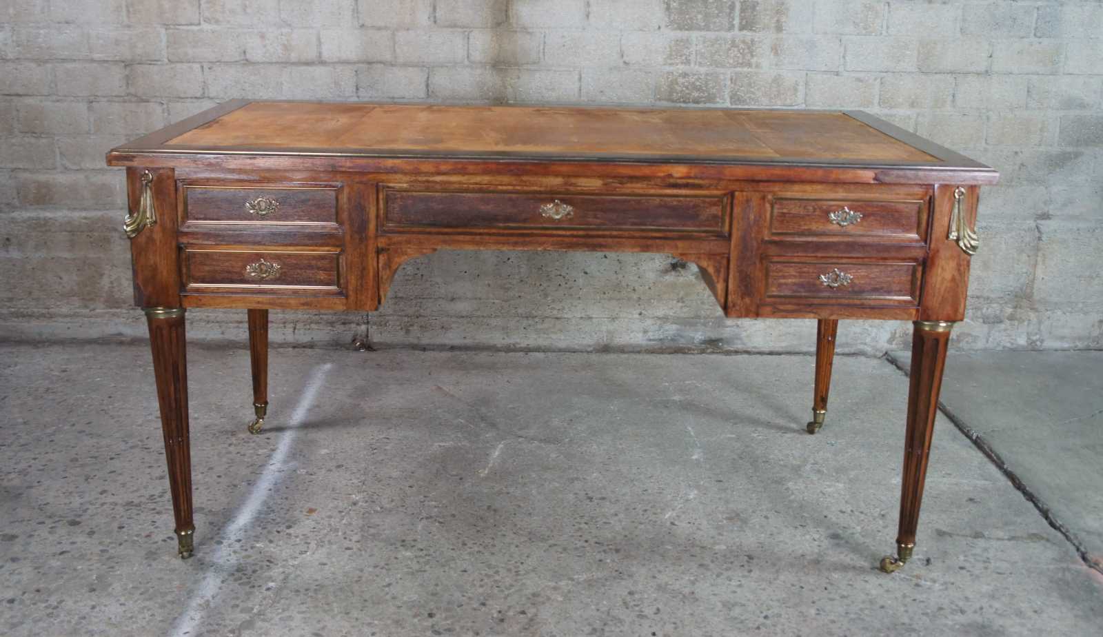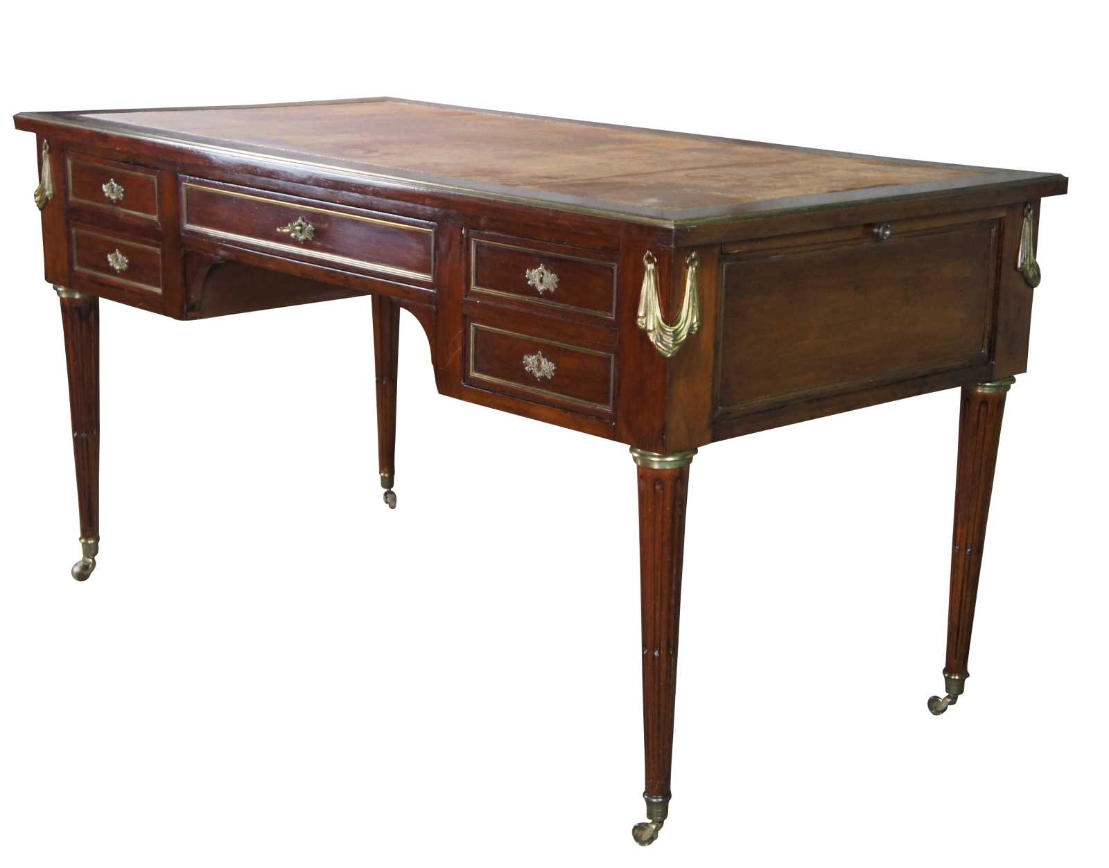 Antique French Louis XVI Directoire writing desk. Made of walnut featuring Neoclassical styling with leather top, two large extending pull out surfaces, four drawers, brass accents and tapered fluted legs over castors. Includes lockable drawers with additional interior lockbox to top right drawer.
