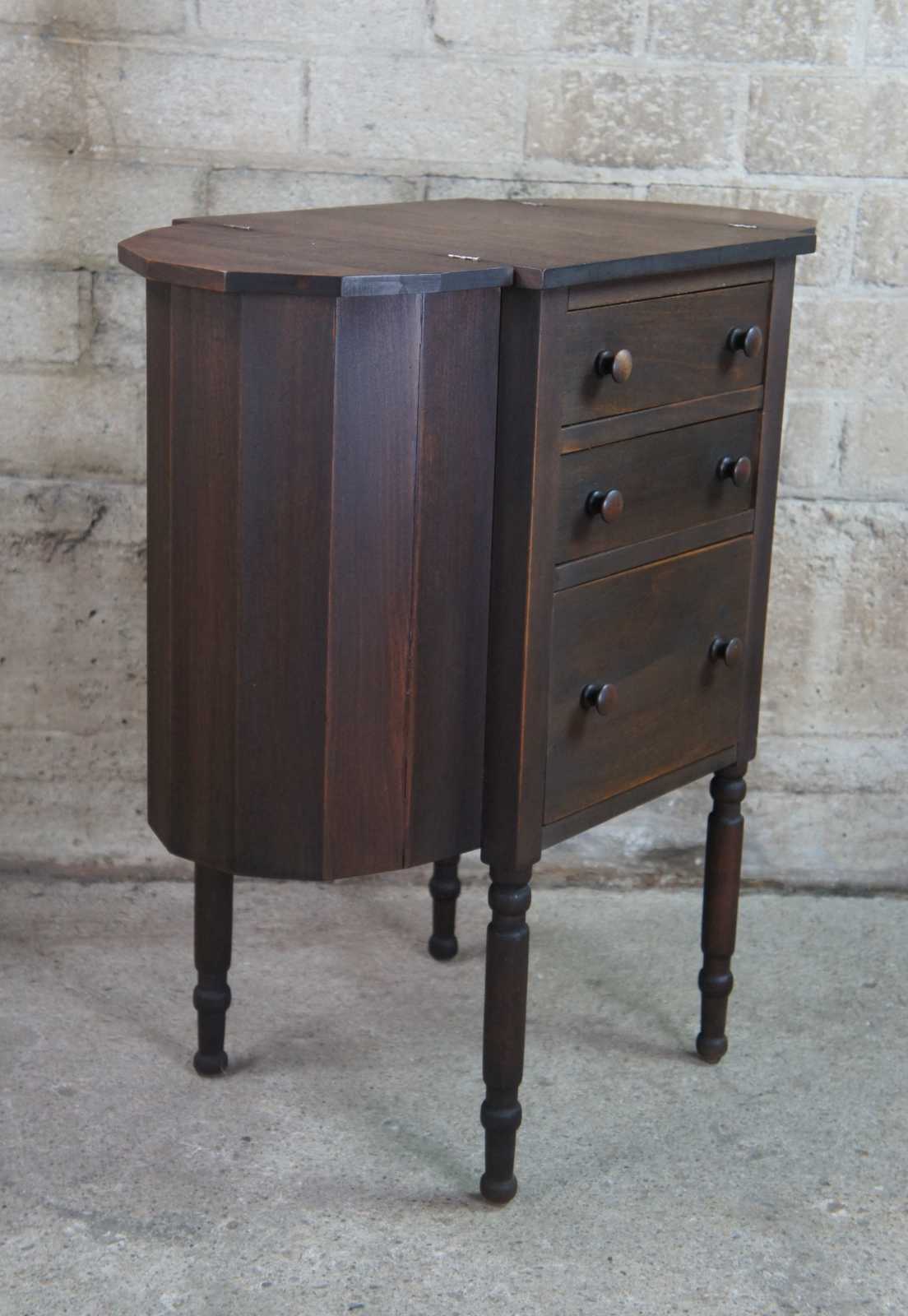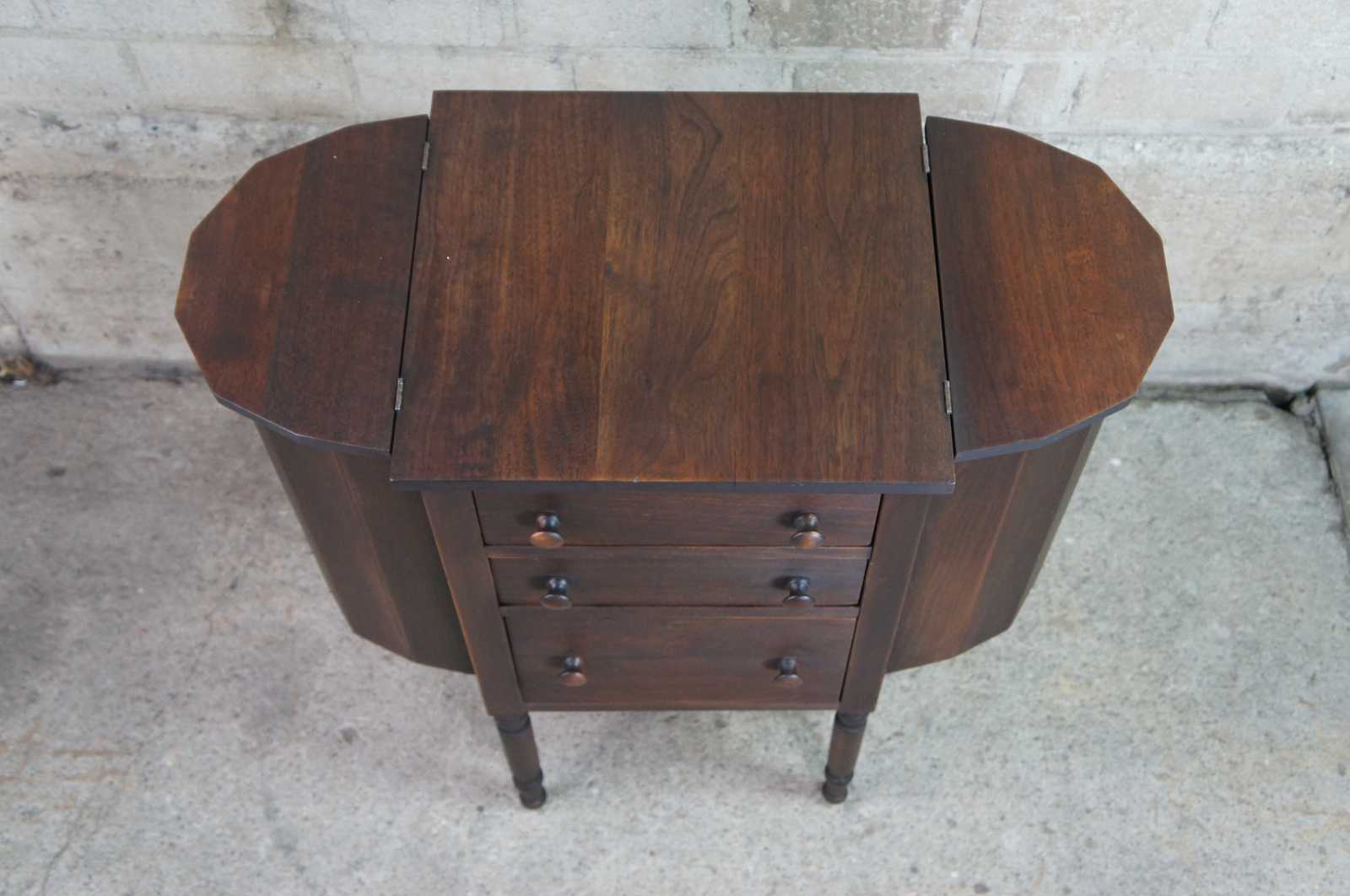 Antique Martha Washington style wooden sewing cabinet with two flip top end sections, three drawers, and turned spindle legs.