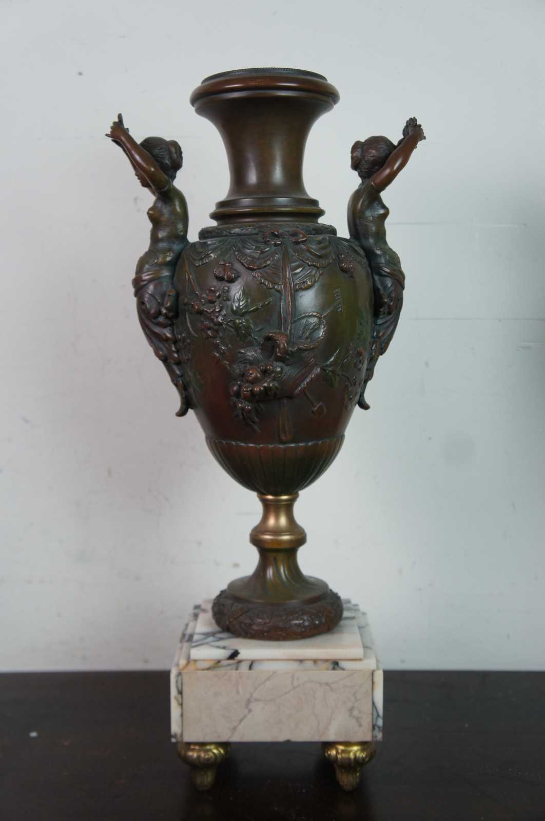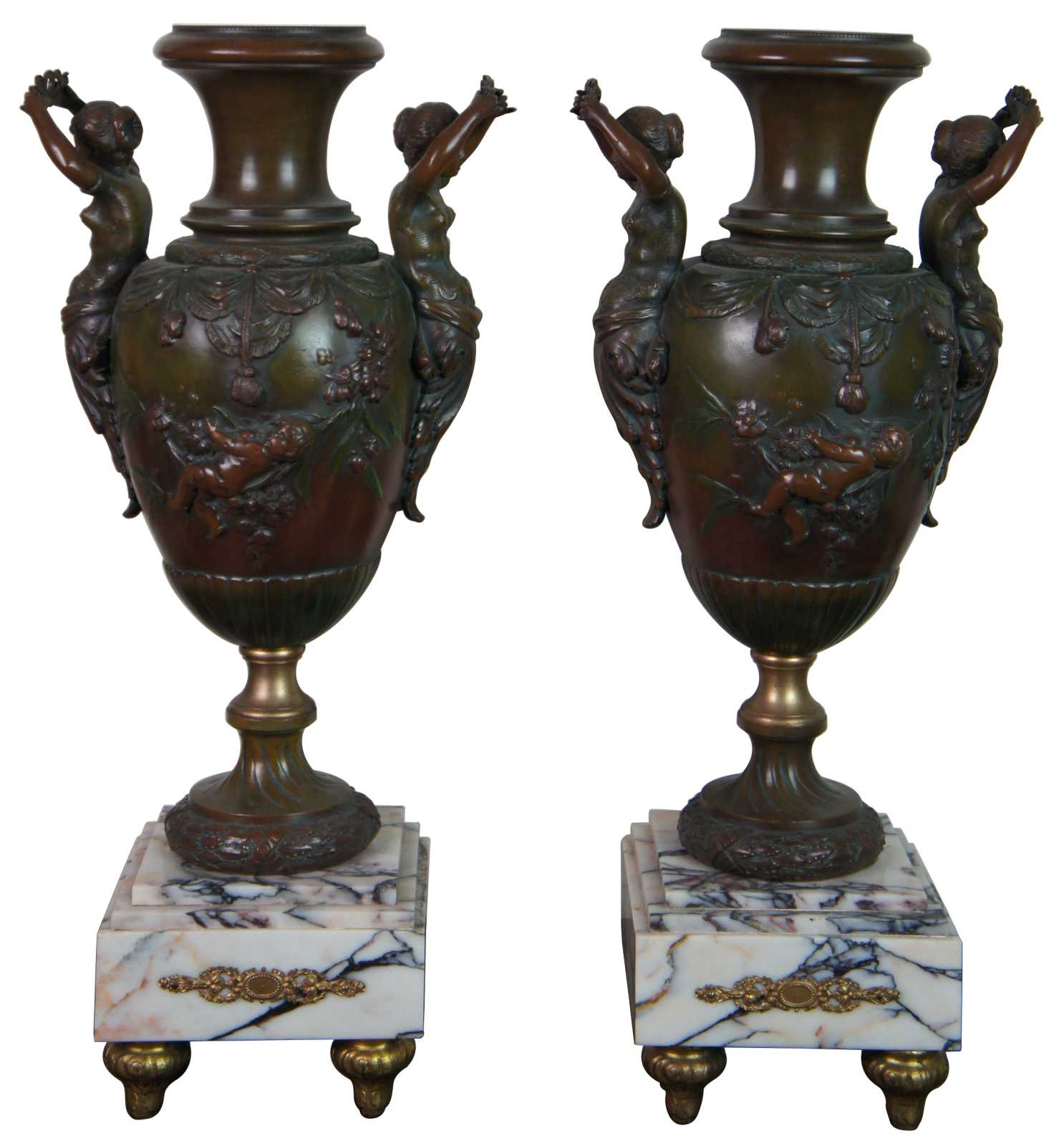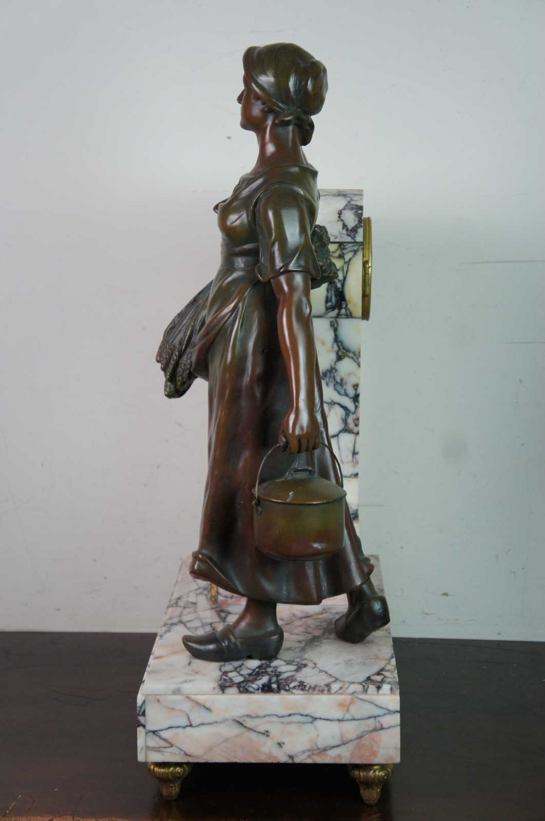 Antique AD Mougin French figural garniture clock and mantel urns. Made of marble and bronze with gilt accents and neoclassical styling featuring a figural bronze peasant woman carrying a sheath of wheat and cook pot flanked by two large mantel urns decorated with nude female figures, cherubs / puttis, flowers, a basket of fruit and tassels. The porcelain clock face is marked Bollot-Lemoine St. Quintin France.