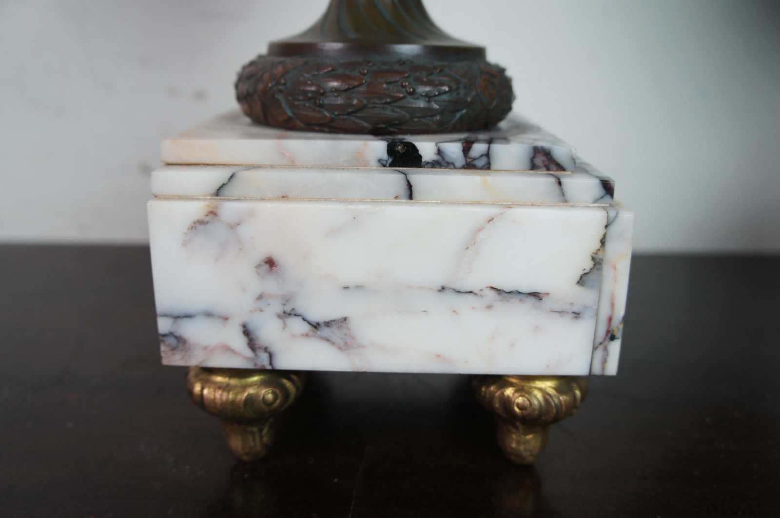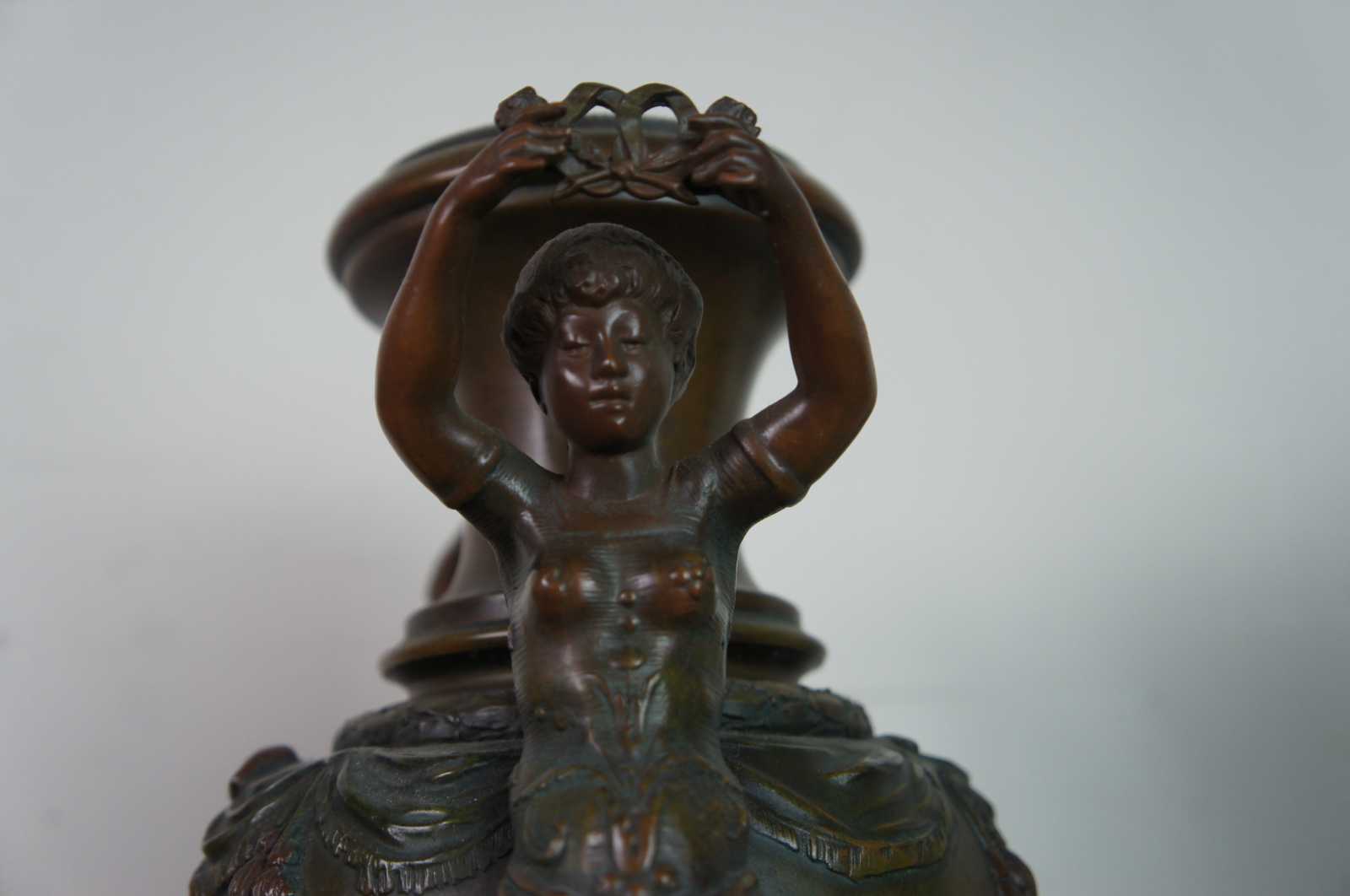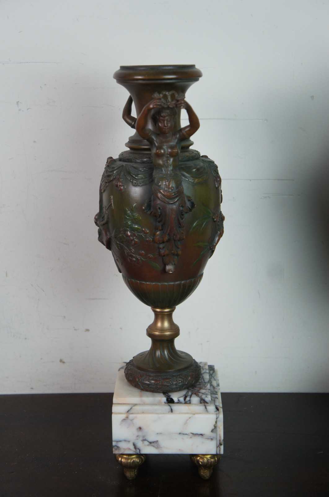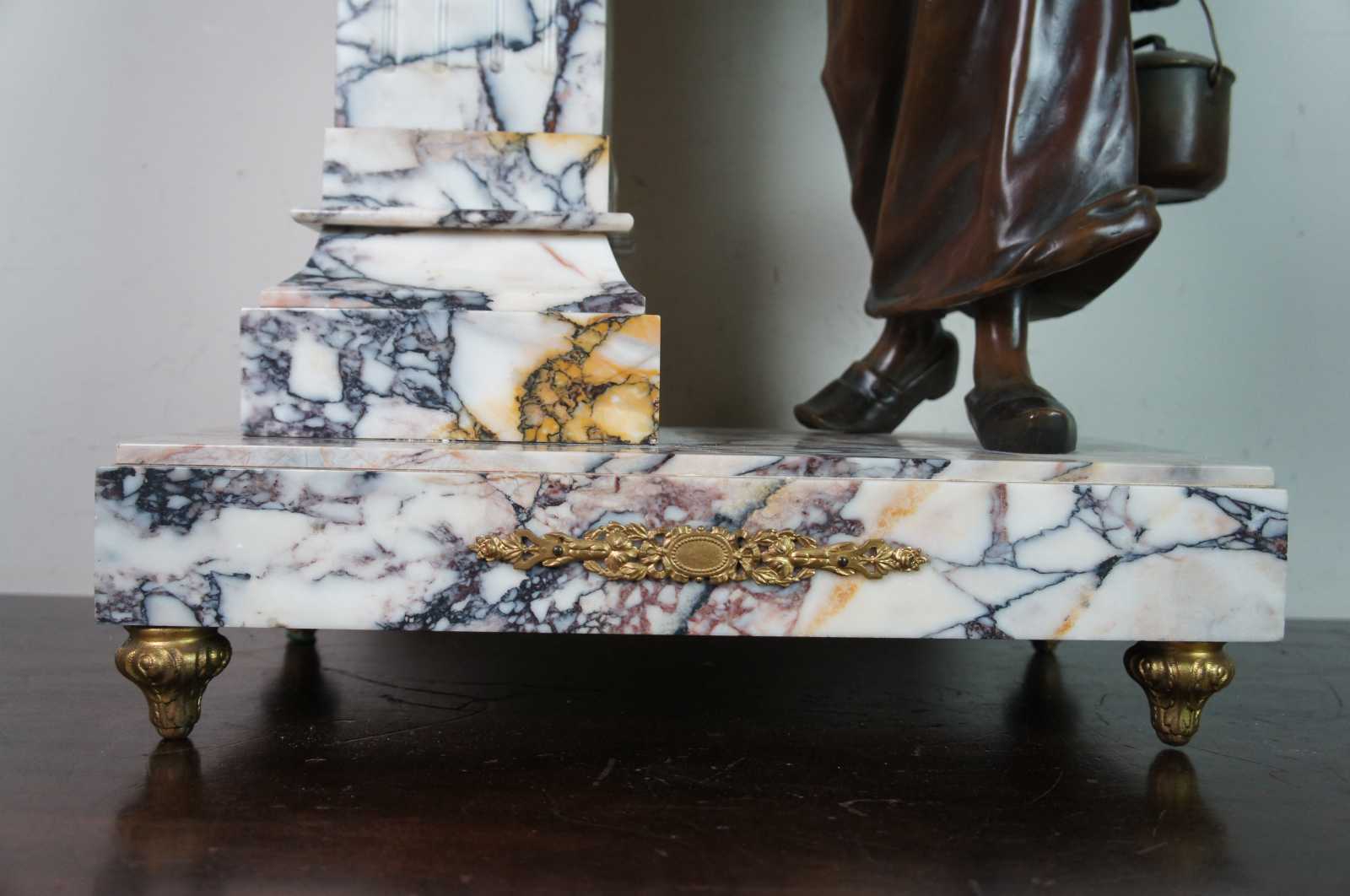 Antique AD Mougin French figural garniture clock and mantel urns. Made of marble and bronze with gilt accents and neoclassical styling featuring a figural bronze peasant woman carrying a sheath of wheat and cook pot flanked by two large mantel urns decorated with nude female figures, cherubs / puttis, flowers, a basket of fruit and tassels. The porcelain clock face is marked Bollot-Lemoine St. Quintin France.