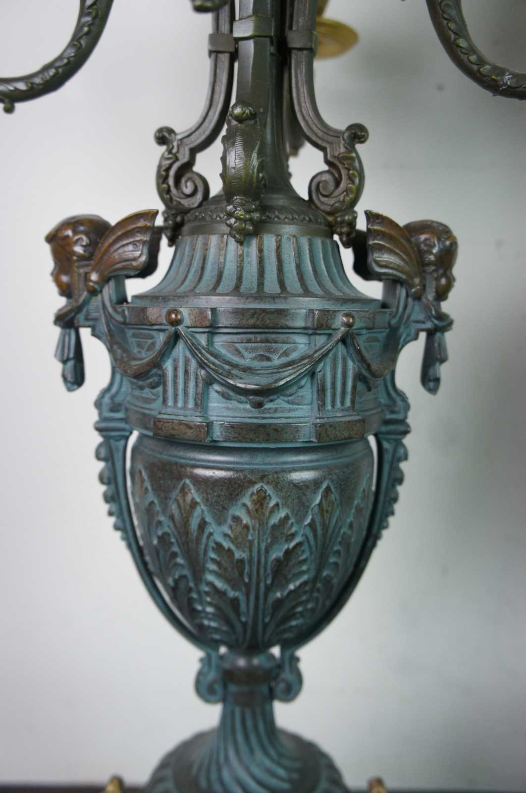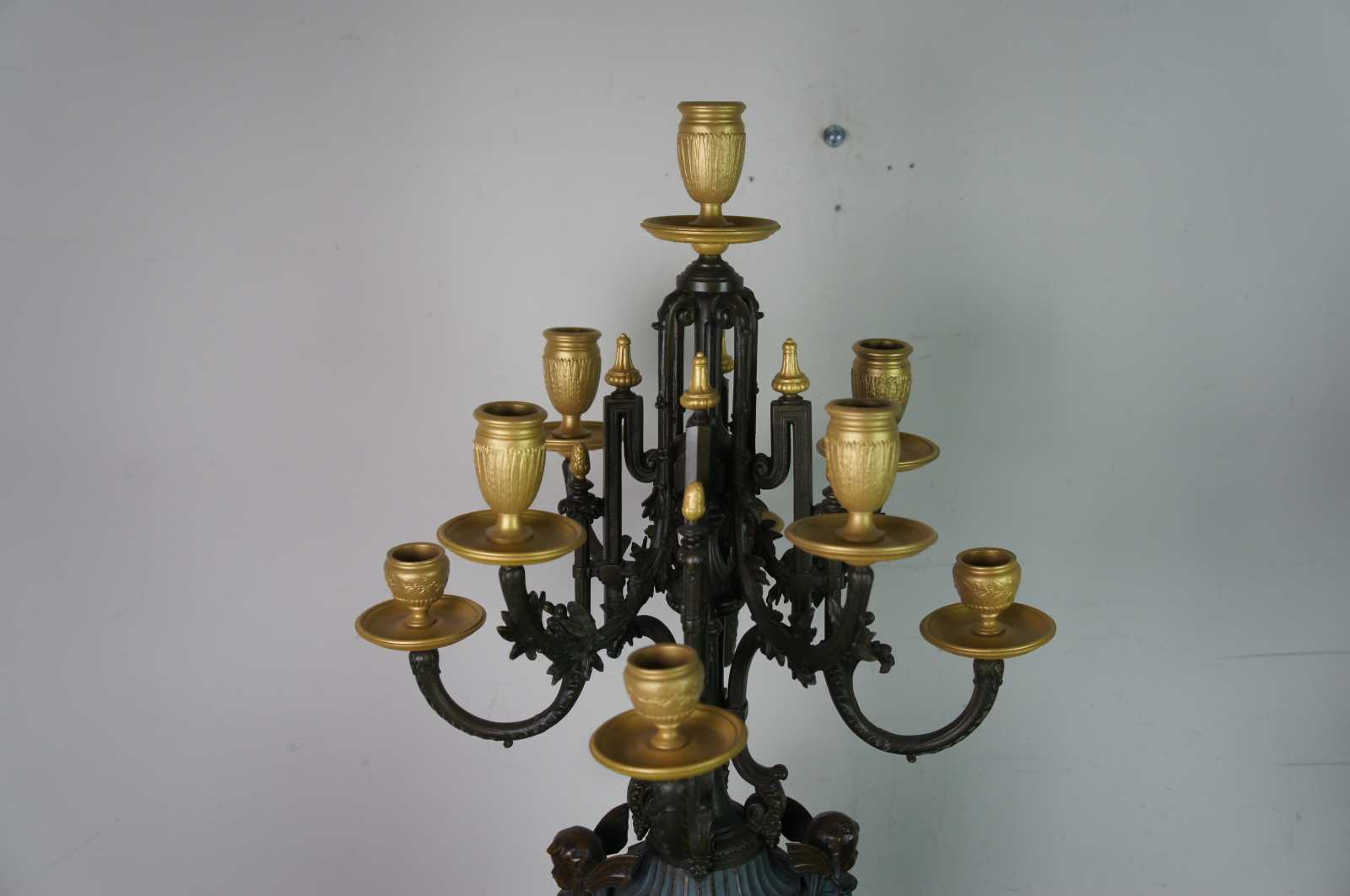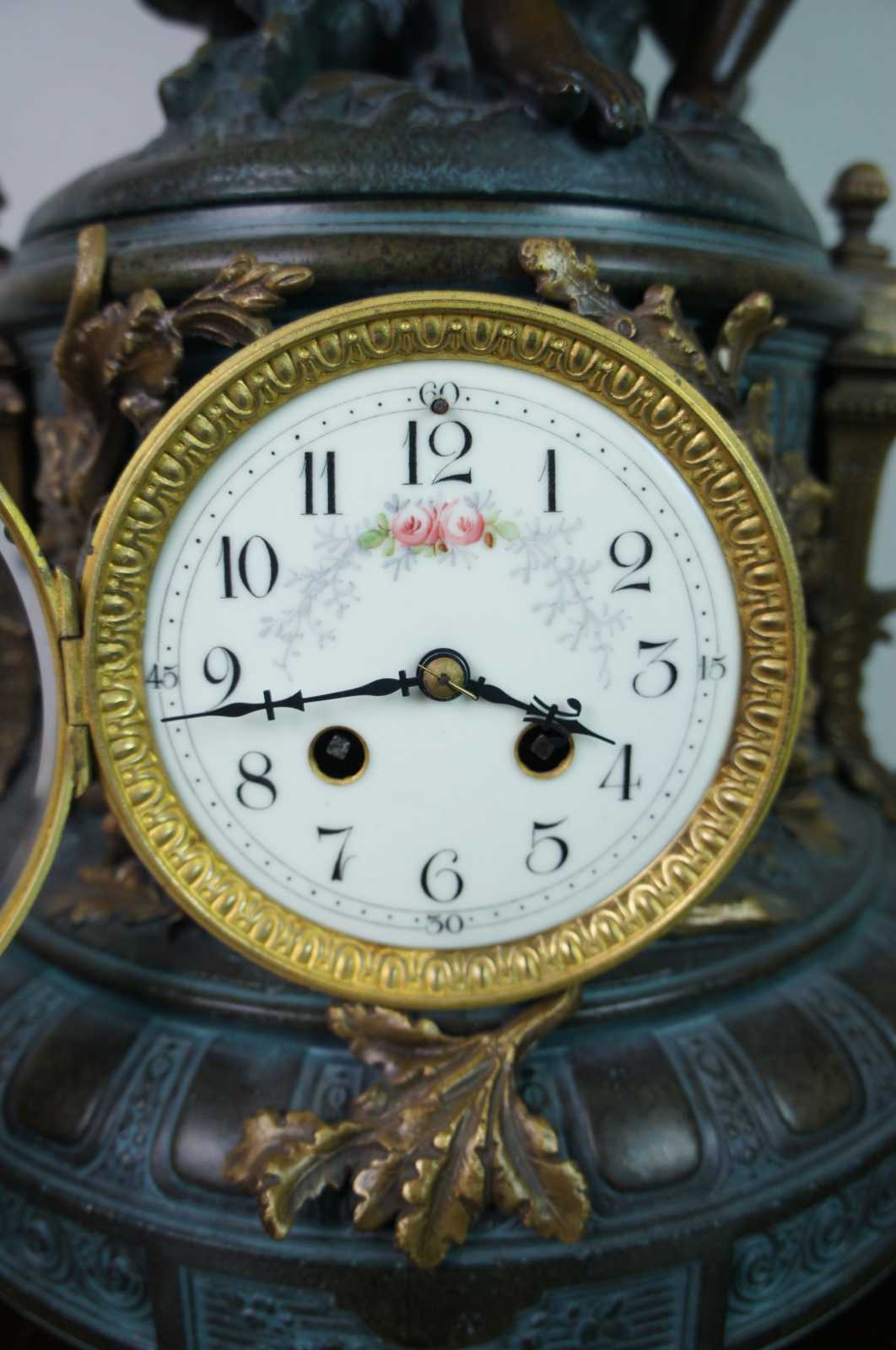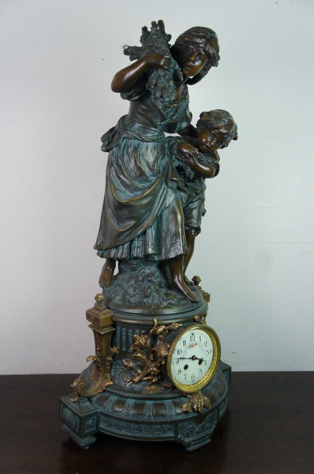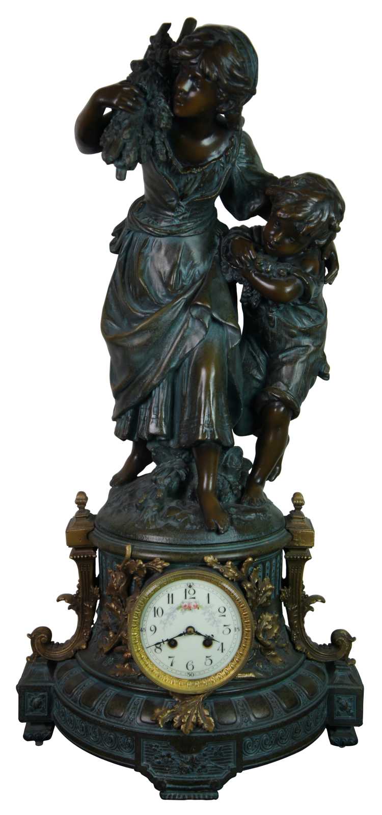 Monumental Antique French Art Nouveau Auguste Moreau garniture clock set. Made of bronze with gilt accents featuring a peasant woman and child carrying a shieth of wheat flanked by large candelabra urns featuring neoclassical stying with cherub / putti faces.