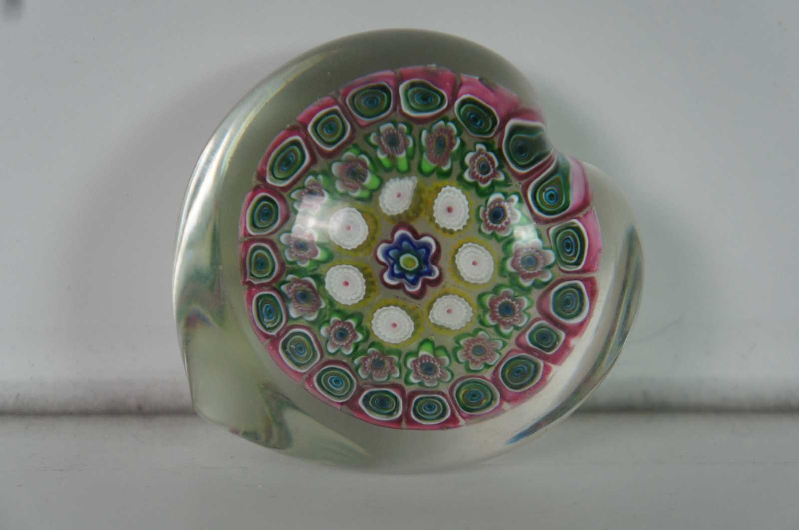 Vintage Murano Italy art glass heart and flower paperweight filled with millefiori glass cane patterns.