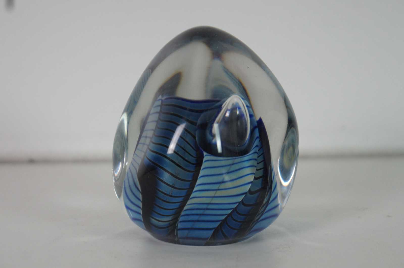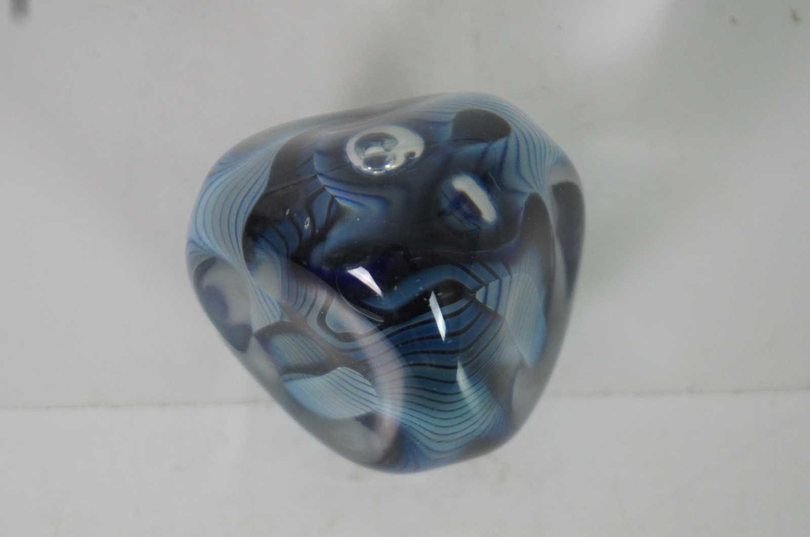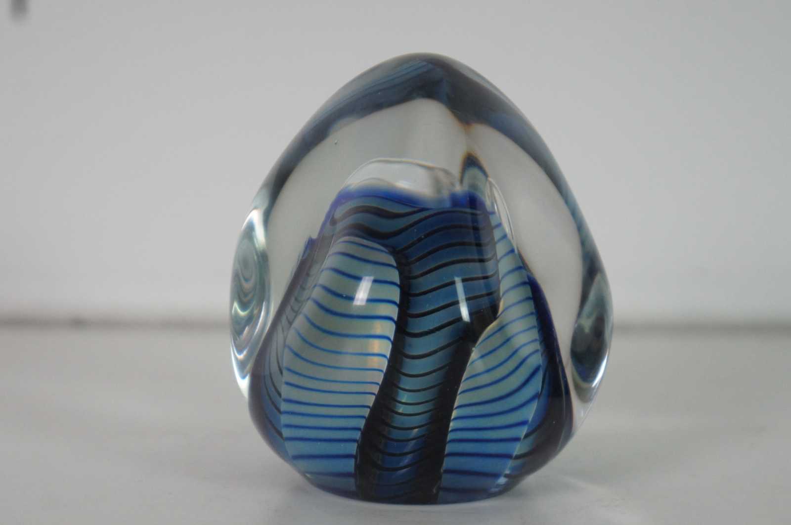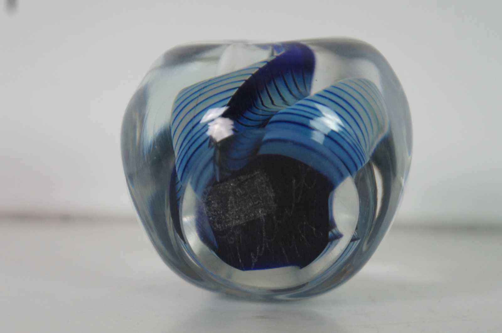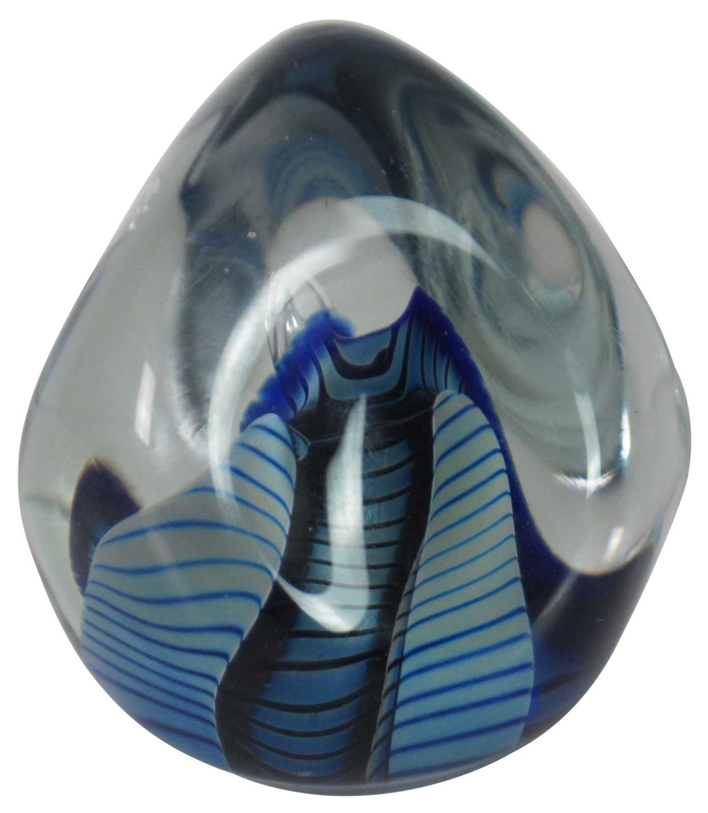 Vintage Robert Eickholt studio art glass paperweight featuring a clear abstract form filled with rippling stripes in various shades of blue and a large controlled bubble at the center. Signed and dated 1988 on base.