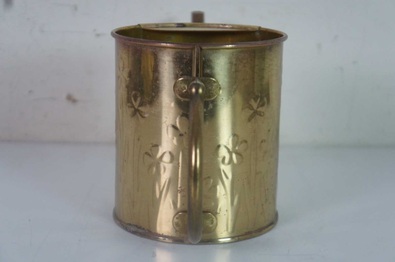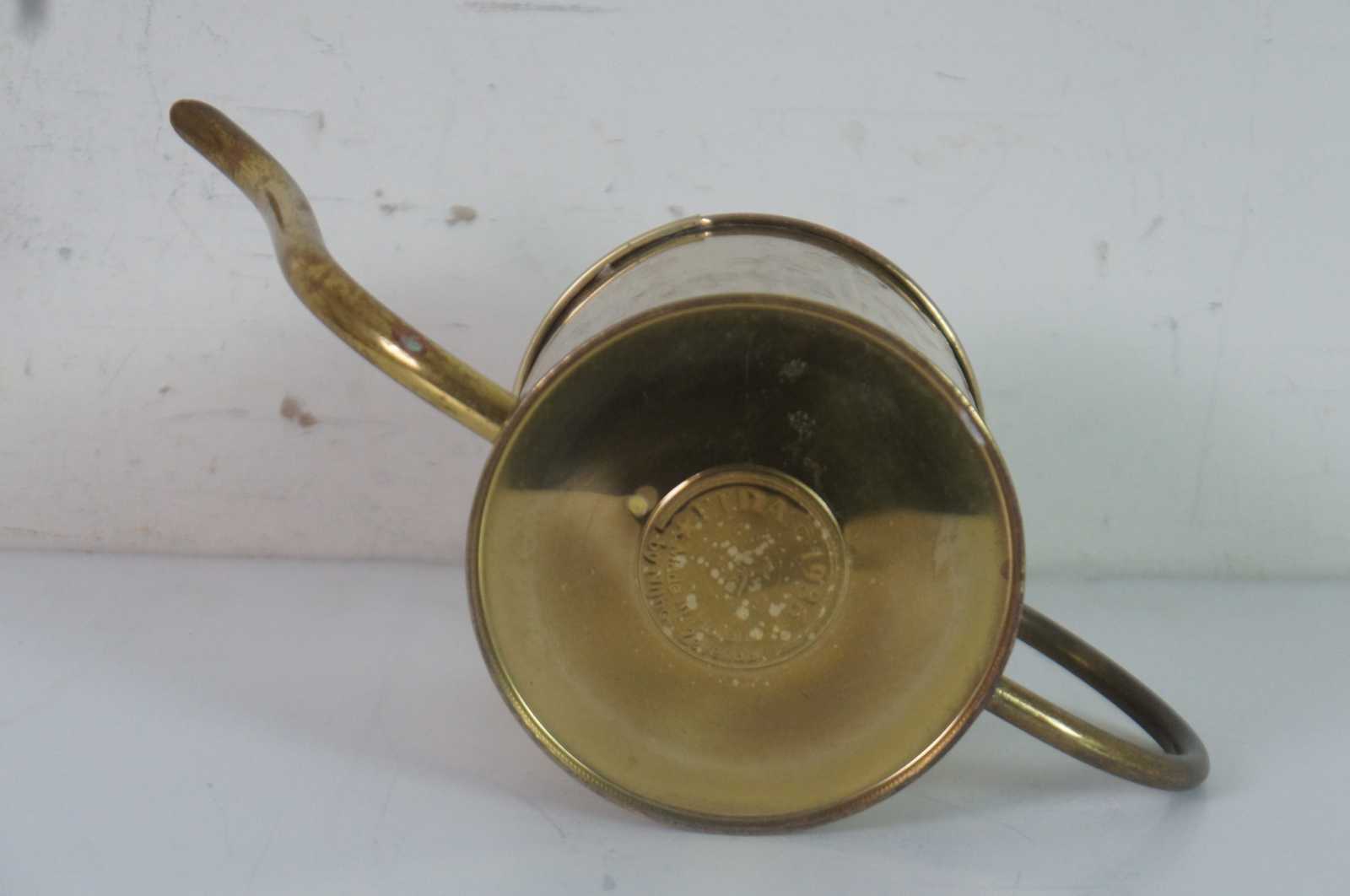Vintage FTDA 1986 brass watering can featuring a gooseneck spout and a design of sprouting daisies, made in Holland by Nijhof-Zevenaar.