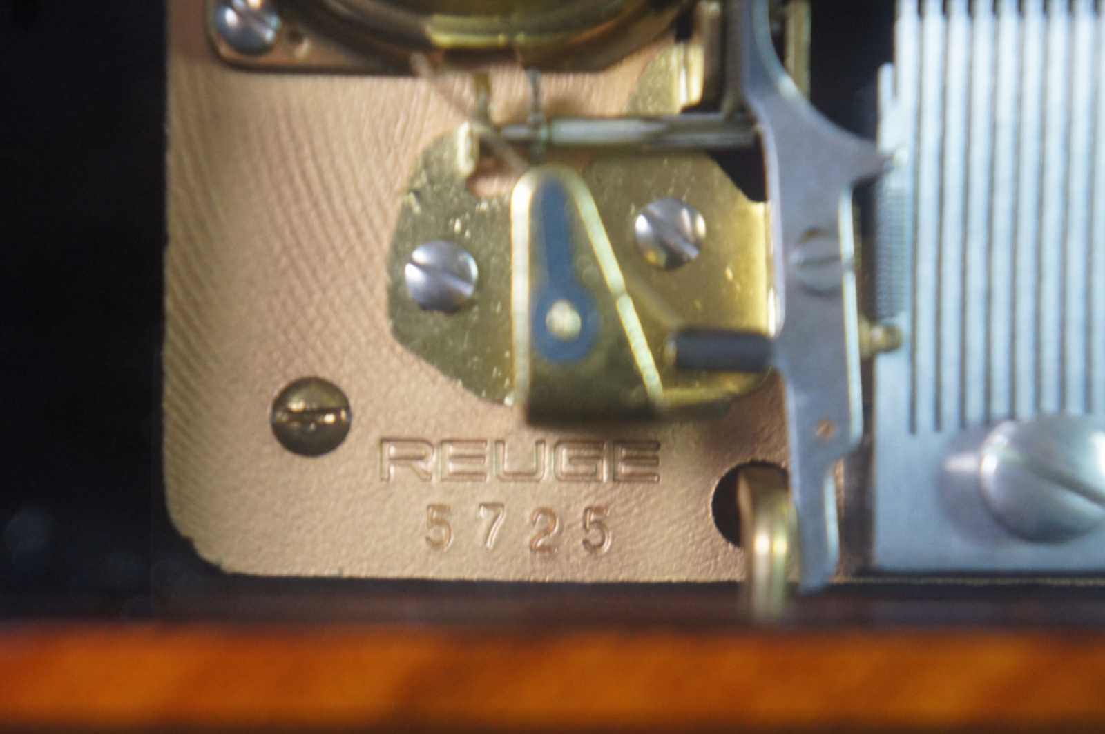 Vintage Reuge Swiss music box number 5725, displayed in a marquetry case decorated with flowers and instruments and a glass front to show the 72 note works. Key is inset on the back; top flips open for access to interior; mechanical stop included on the front.