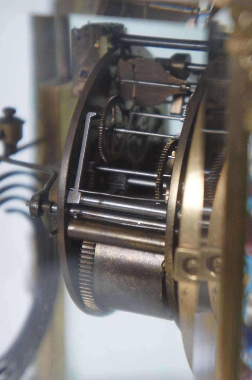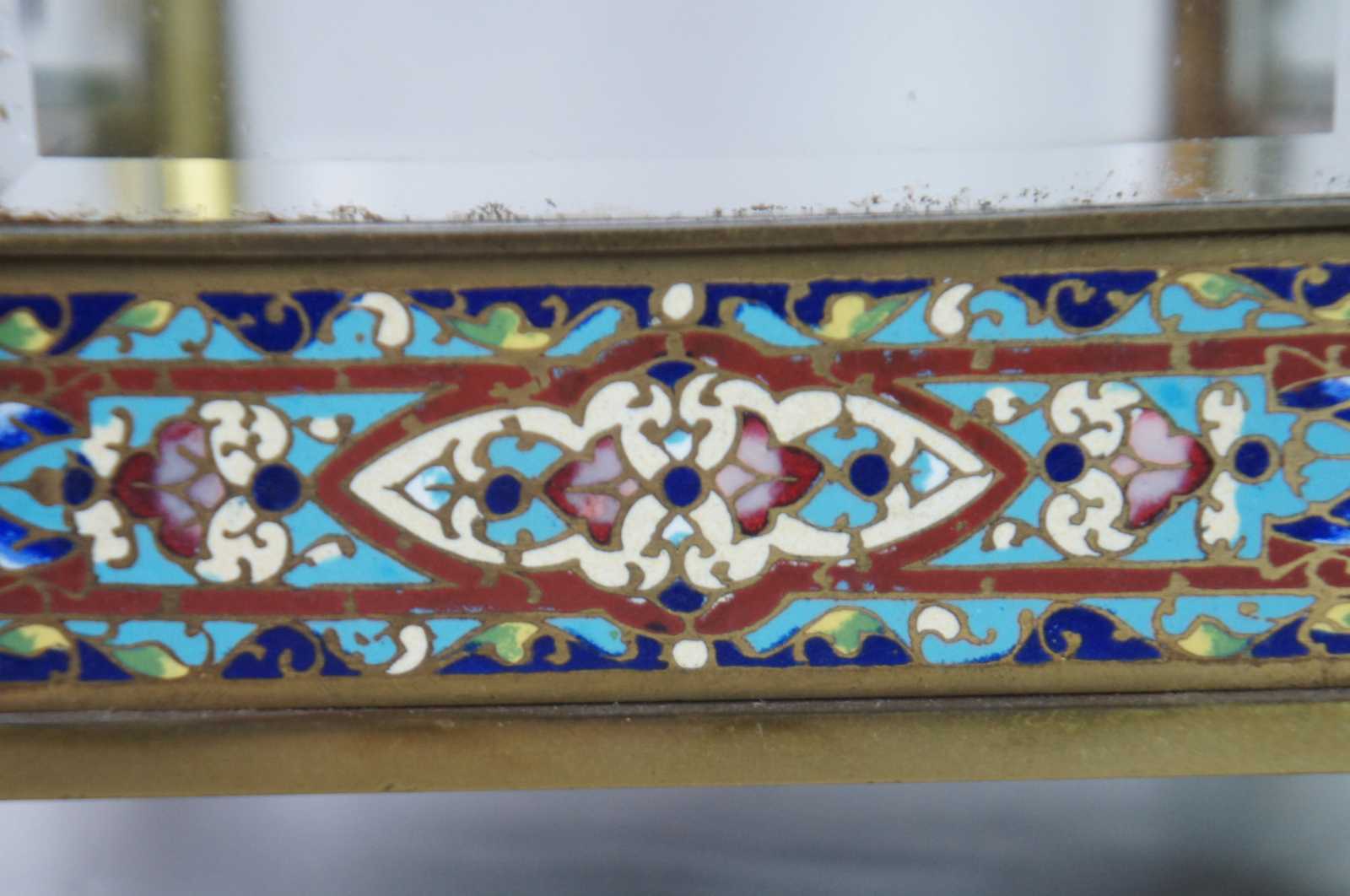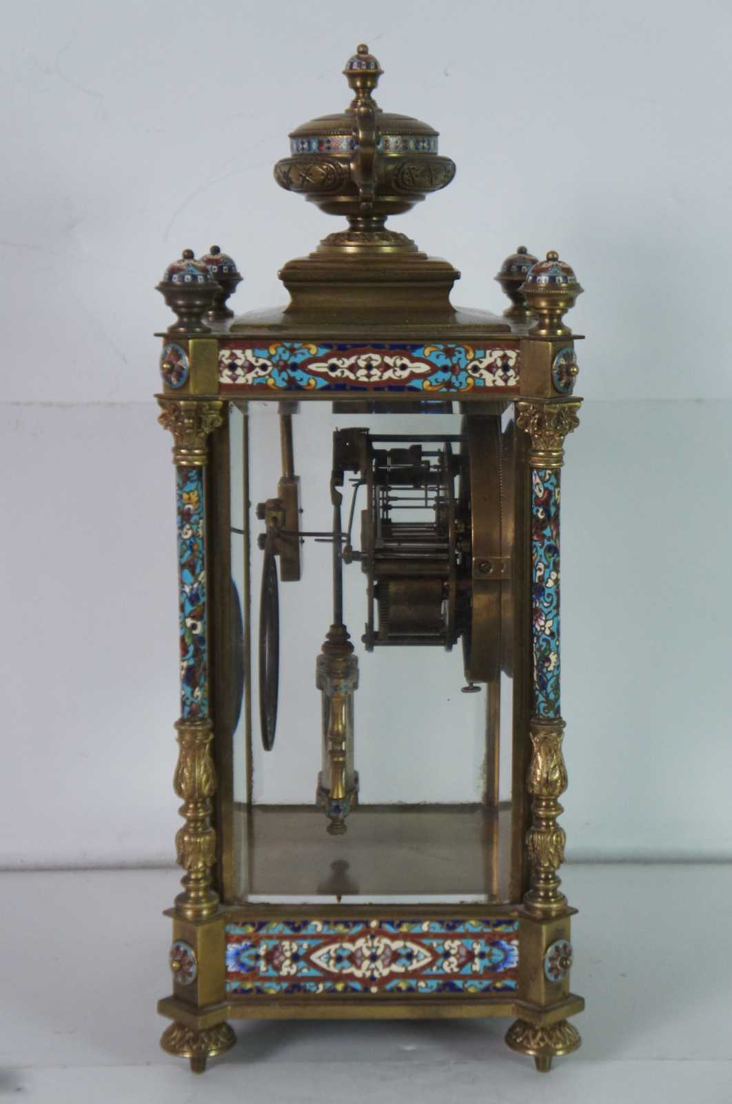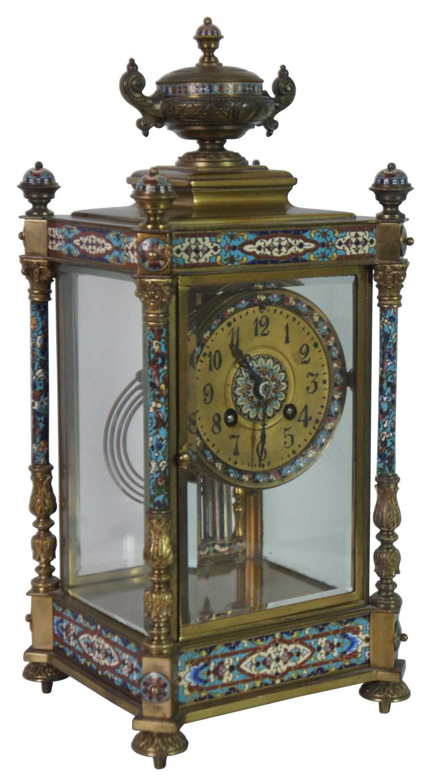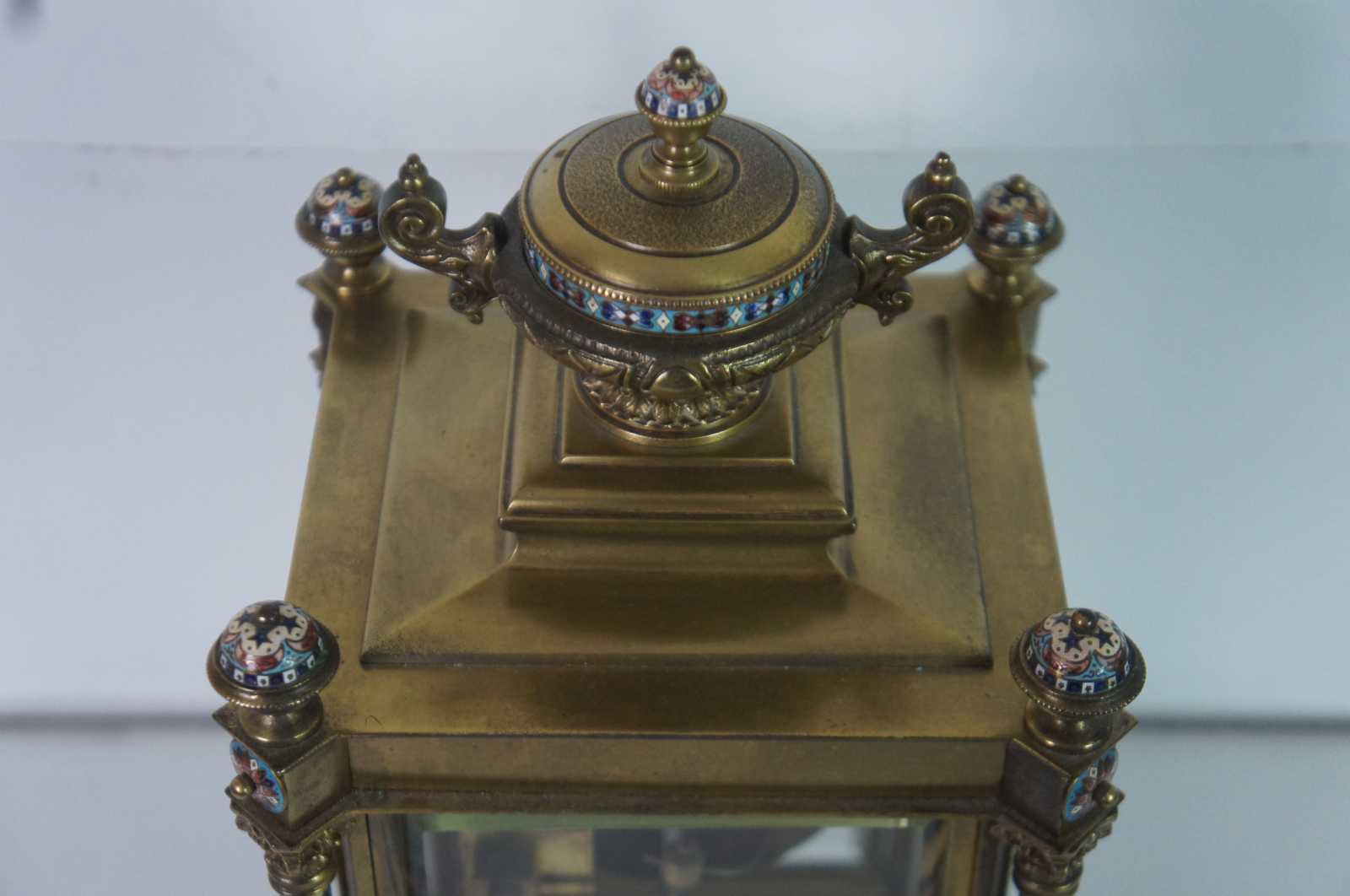Antqiue late 19th Century French Japy Freres gilt brass enameled mantel clock featuring neoclassical styling with polychrome champleve enamel accents, four columns with spire finials, beveled glass sides and trophy vase topper. Stamped with Japy Freres Medaille D'honneur stamp. Eight day striking movement. 9470. Made in France.