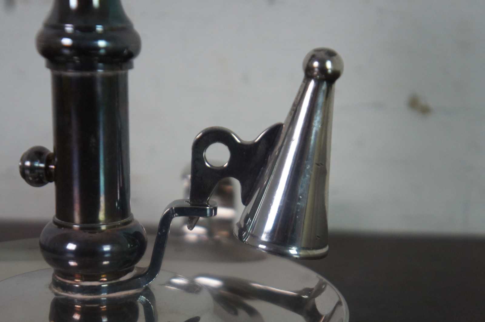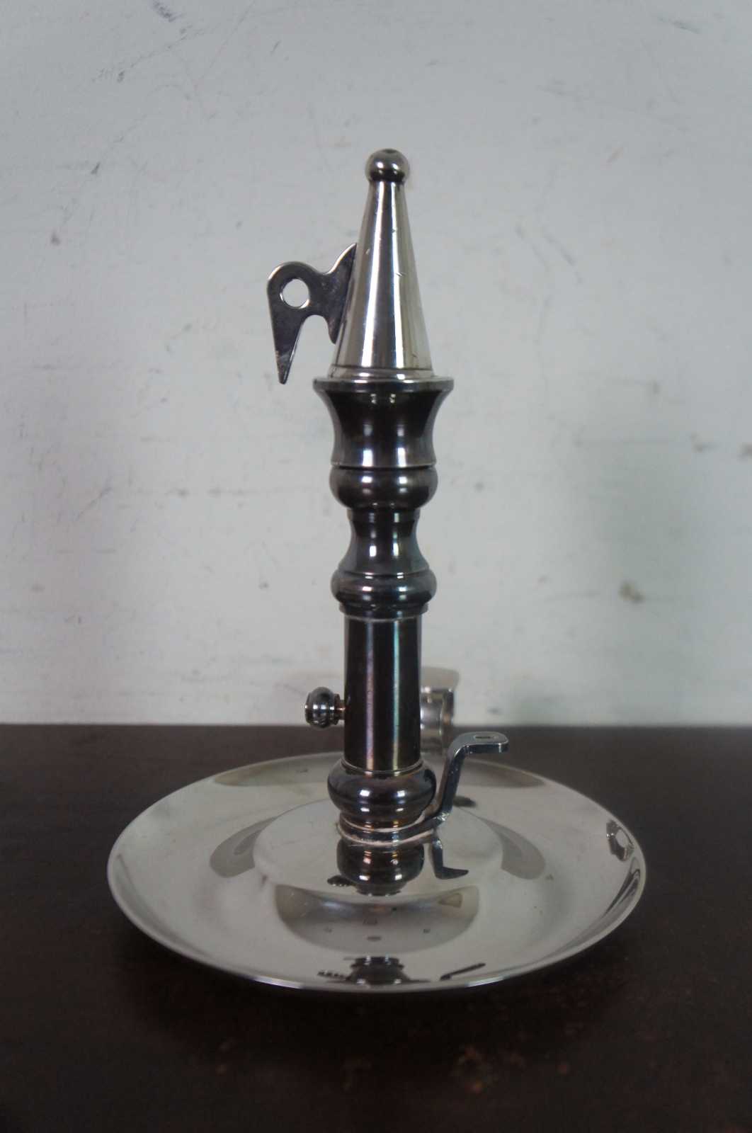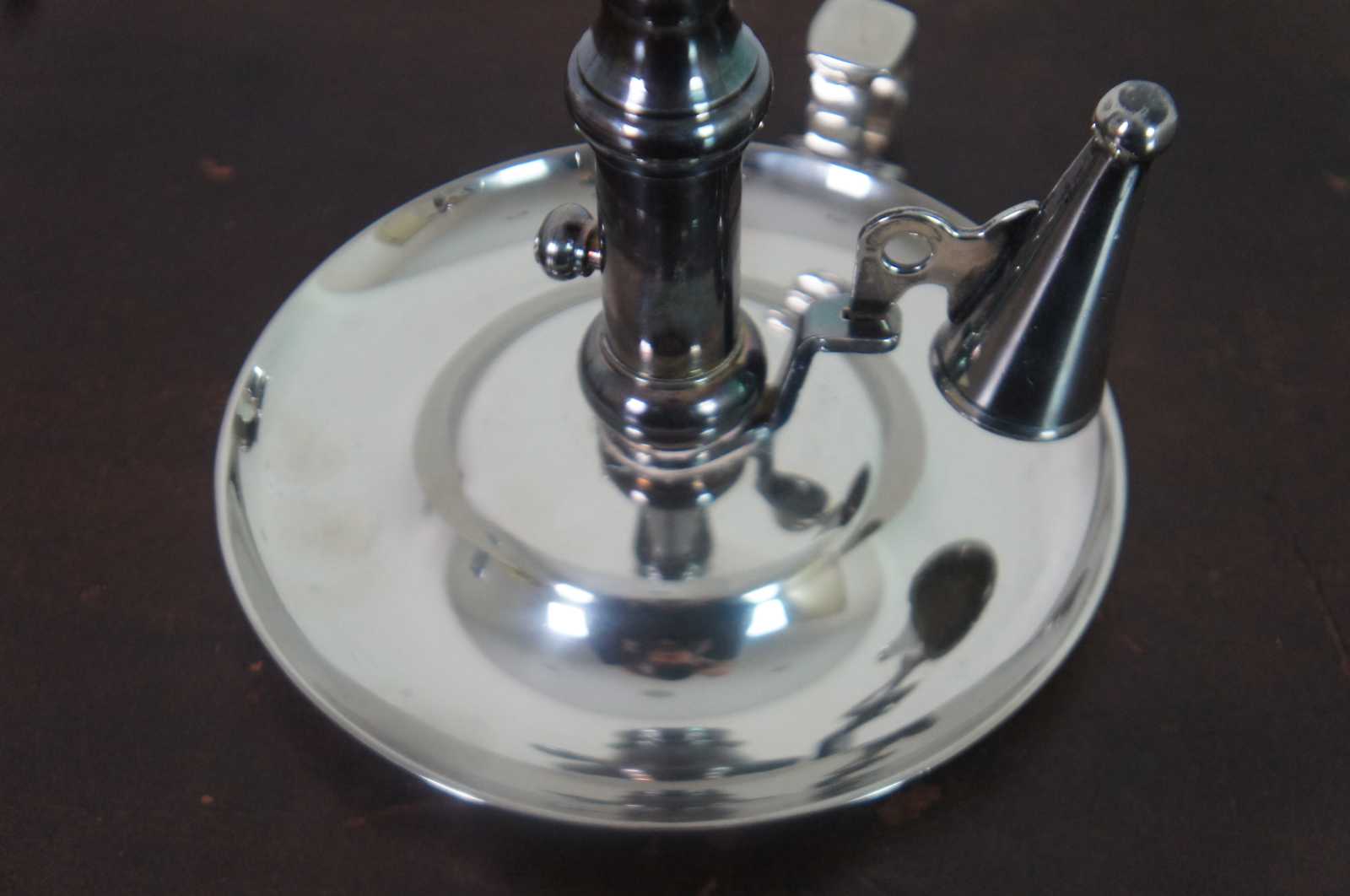 Antqiue English Georgian silver plate chamber candlestick with ring handle, snuffer, and push up mechanism to raise the candle as it burns down.