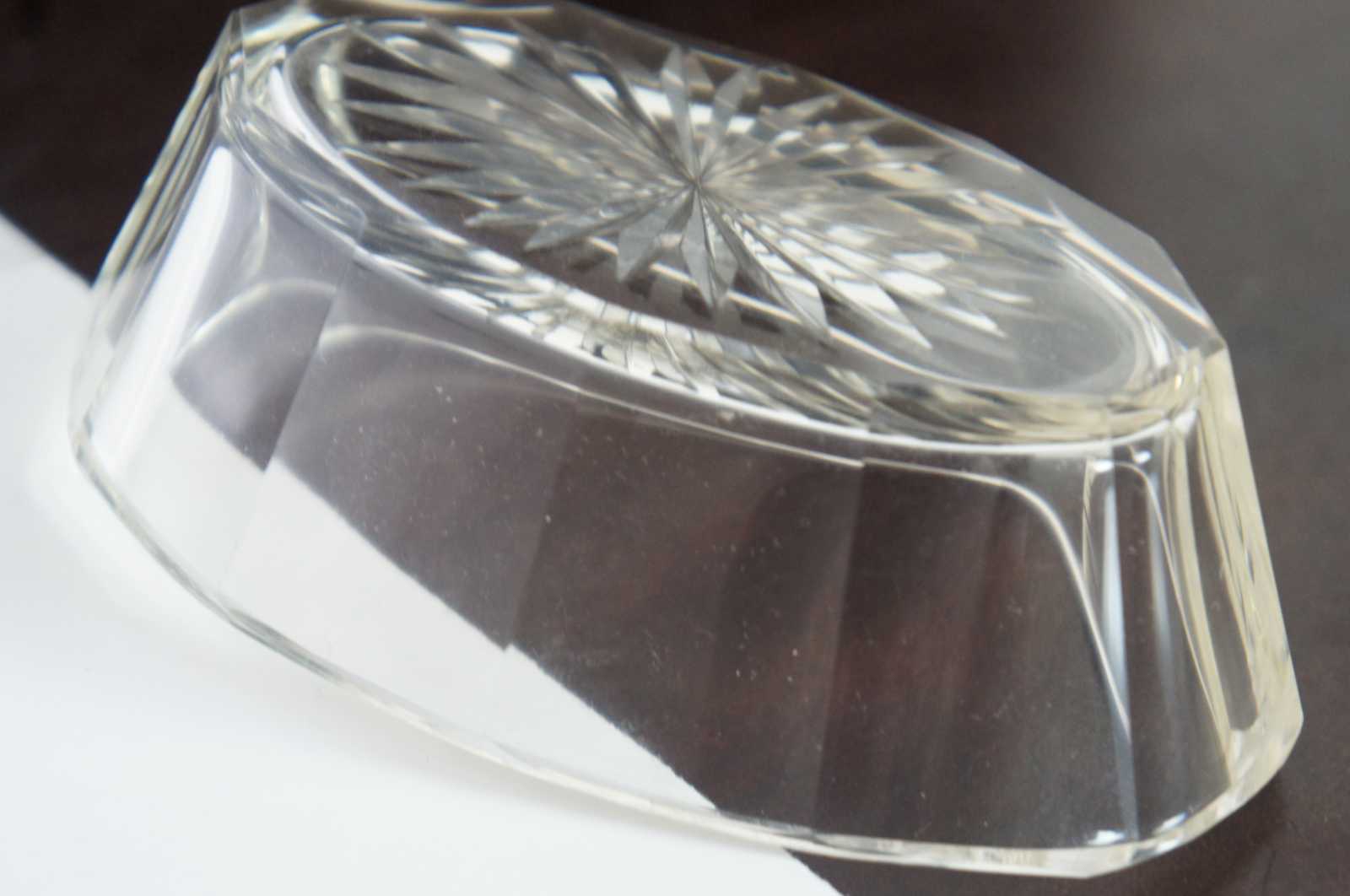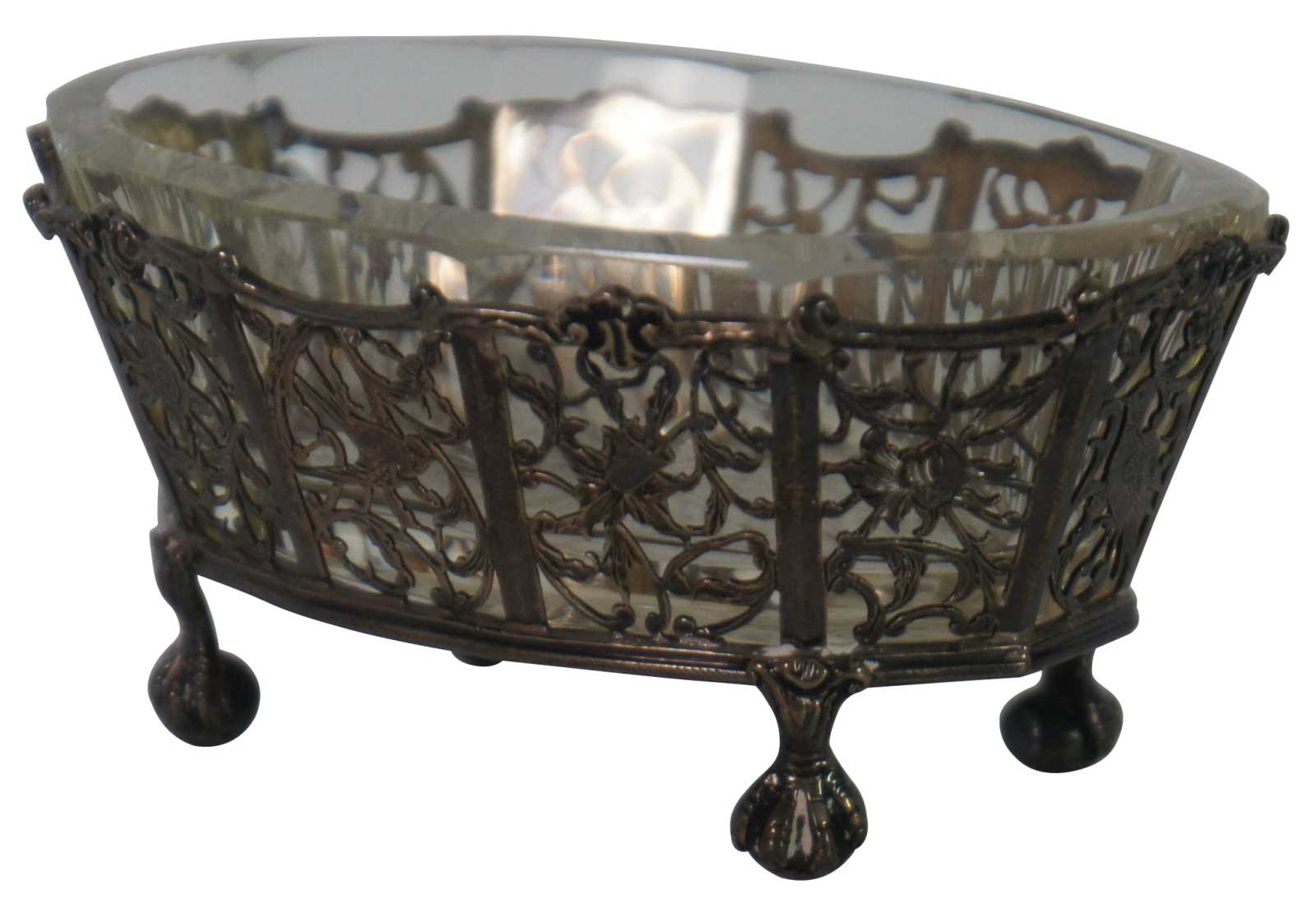 Antique Scottish sterling silver, oval basket shaped candy /sugar / dish / vanity / bowl / compote, ornately decorated with pierced birds, flowers and swirling vines, ball and claw feet, and a faceted clear glass insert.