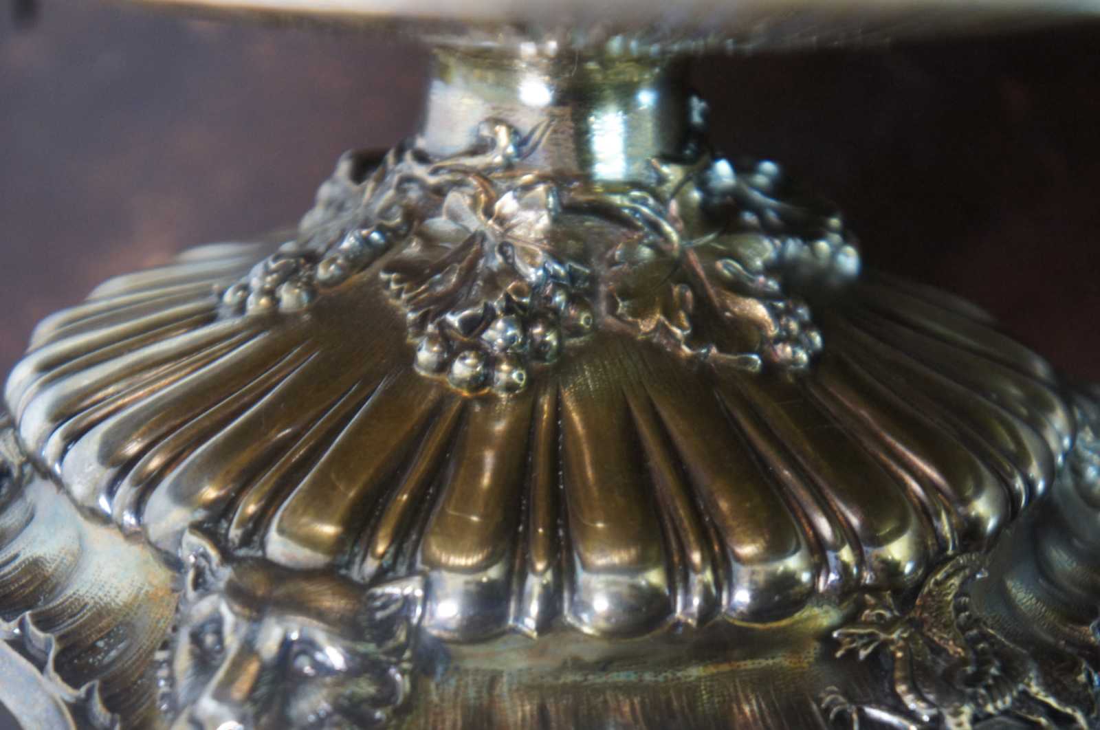 1902 antique English Edwardian sterling silver 925 footed centerpiece compote by Goldsmiths & Silversmiths Co of London. Features stamped and fluted design of grapevines with figural face of a bearded man (Dionysus) along the top and a fox / wolf / cat along the base accompanied by The Buffs badge, a winged griffon / gryphon / dragon referred to as East Kent Regimental Dragon Badge.