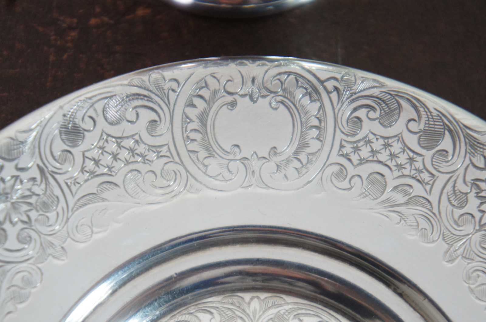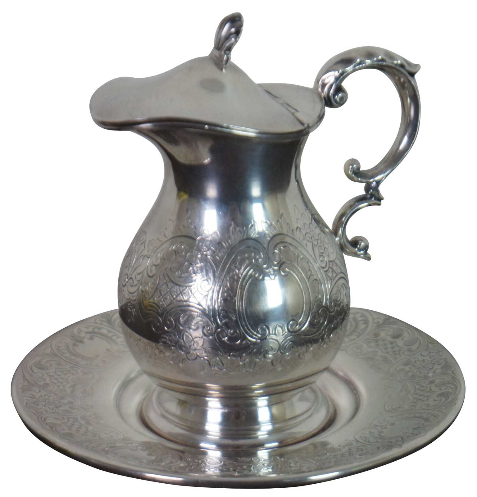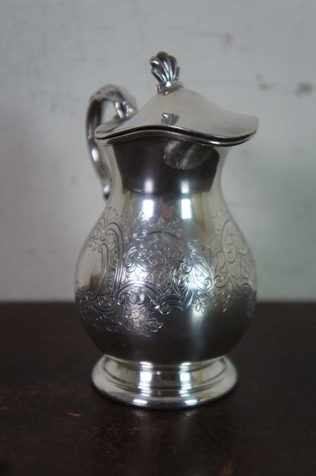 Antique English engraved plated silver creamer or syrup pitcher and small under-plate.