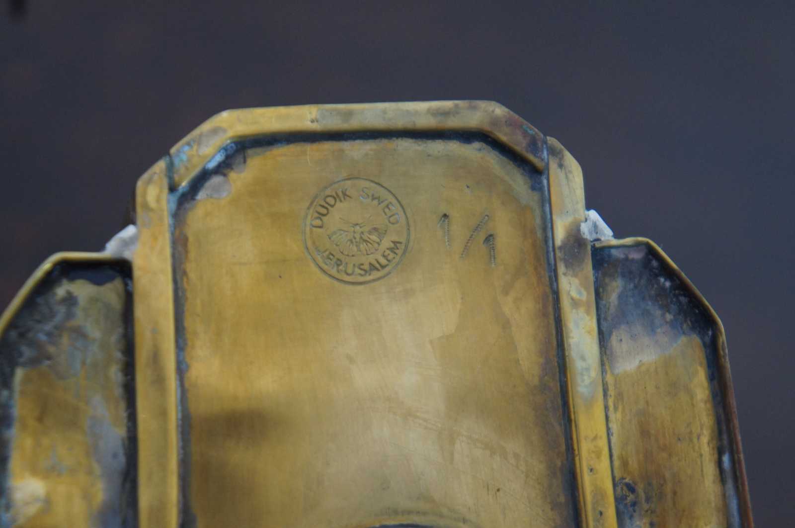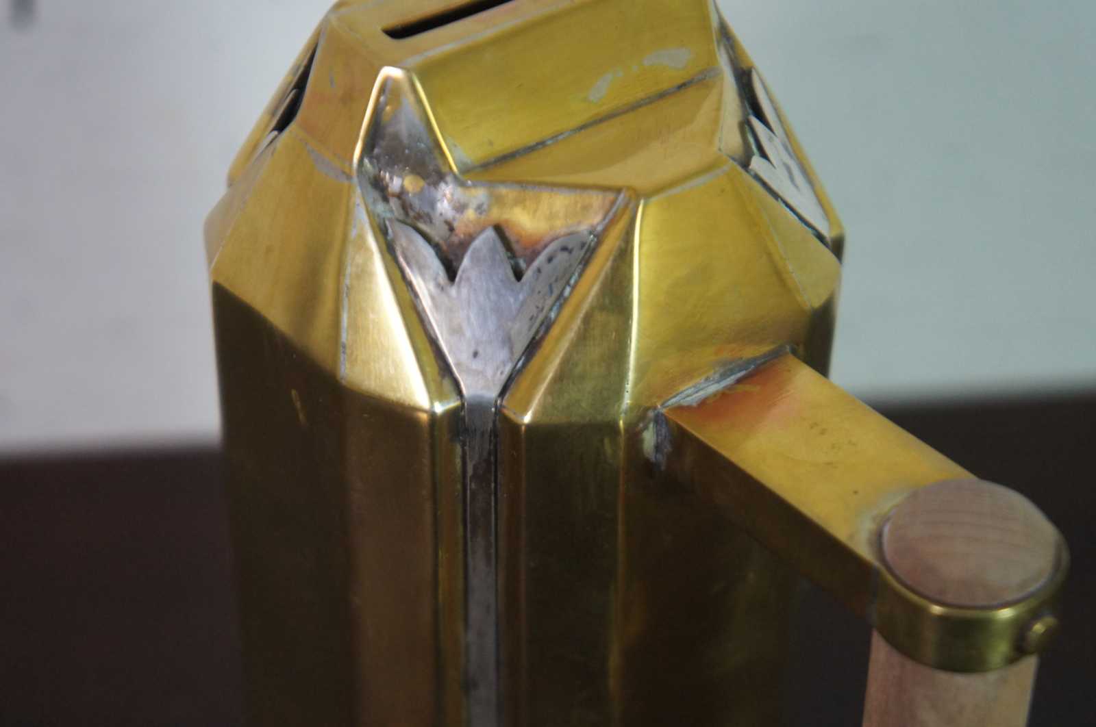 Rare Dudik Swed Masters Jerusalem brass charity Tzedakah box with silver accents, wooden handle and key. 1 of 1, commissioned by the Schottensteins.