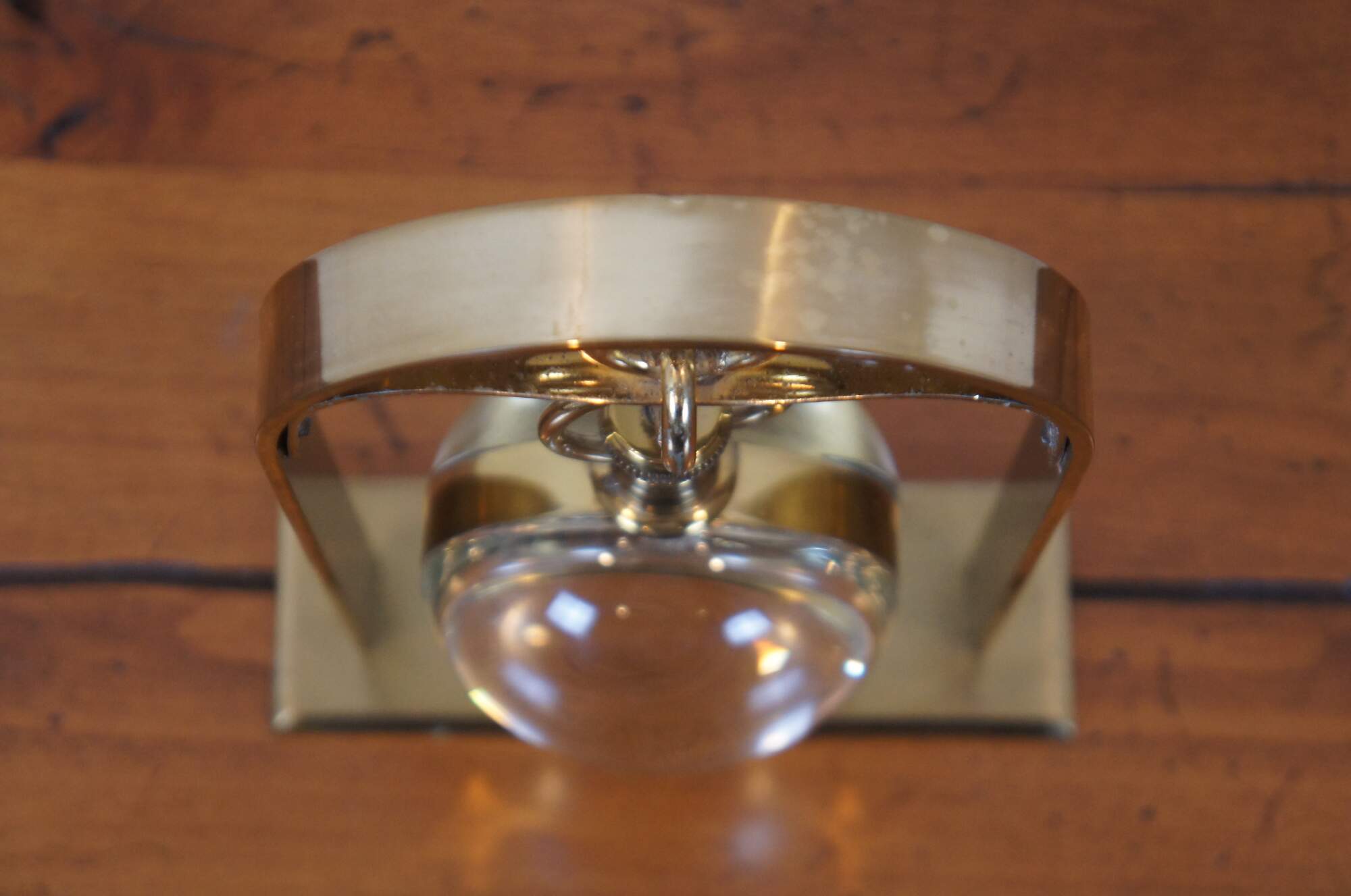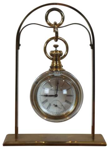 Mid century Henri Lagin Cie desk clock featuring a gold tone arch from which hangs a brass pocket watch inside a crystal paperweight orb / ball.