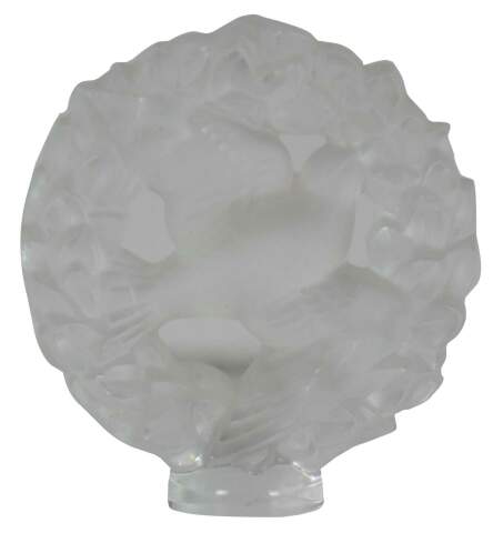 Vintage Lalique French crystal frosted figurine in the shape of a dove flying at the center of a laurel wreath.