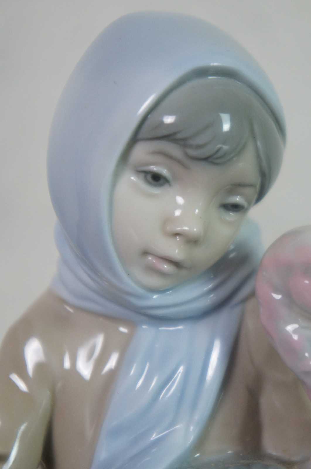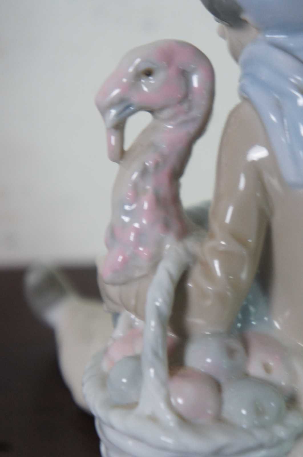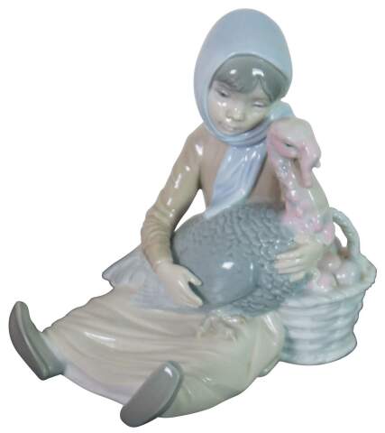 Vintage Lladro Spain porcelain figurine titled “Girl with Turkey,” number 4569, designed by Fulgencio Garcia, featuring a young girl seated on the ground with a large turkey and a basket of eggs.