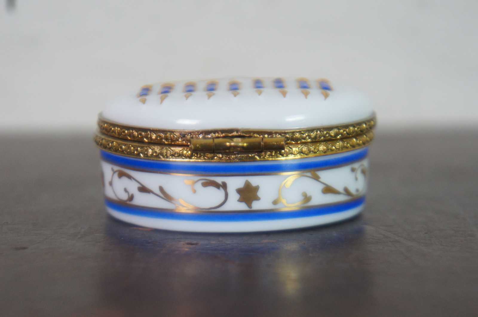 Vintage signed Limoges France hand painted porcelain trinket box featuring a 22KT gold painted Hanukkah menorah with nine royal blue candles, edged in gold with gold flames. A blue and gold pin stripe border with gold scrolls and Jewish stars is on the side. The clasp is a coiled square.