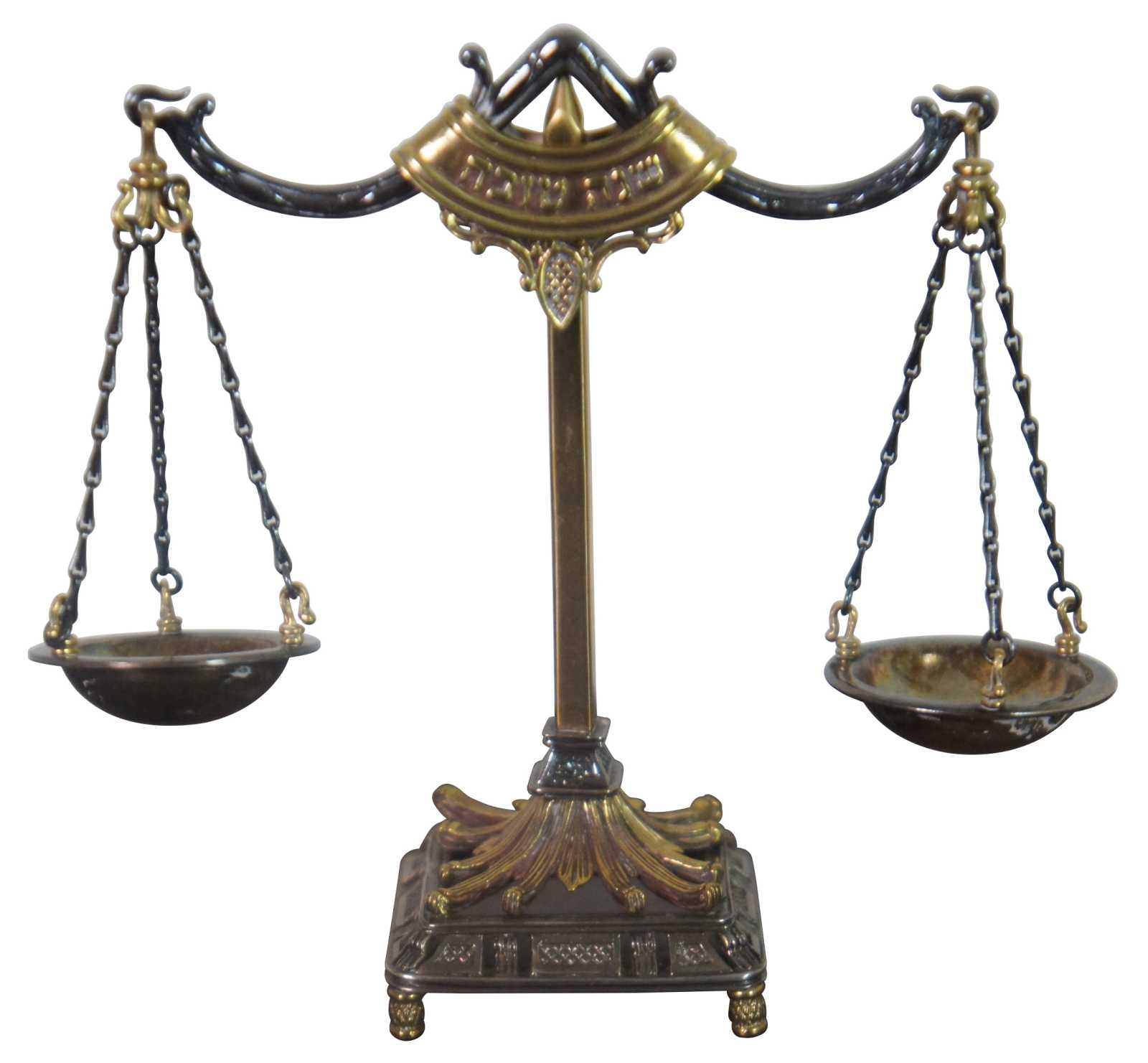 Vintage sterling silver and brass Scales of Judgment / justice art sculpture. Numbered 166/500. “Rosh Hashana, (Hebrew: “Beginning/Head of the Year”) , Hashana also spelled Hashanah or Ha-shanah, also called Day of Judgment or Day of Remembrance, a major Jewish observance now accepted as inaugurating the religious New Year on Tishri 1 (September or October). Because the New Year ushers in a 10-day period of self-examination and penitence, Rosh Hashana is also called the annual Day of Judgment; during this period each Jew reviews his relationship with God, the Supreme Judge. A distinctive feature of the liturgy is the blowing of the ram’s horn (shofar) as prescribed in Numbers 29:1; the notes of the shofar call the Jewish people to a spiritual awakening associated with the revelation to Moses on Mount Sinai. During the Additional Service in the synagogue, the shofar is sounded after the recital of each of three groups of prayers. Rosh Hashana is also known as the Day of Remembrance, for on this day Jews commemorate the creation of the world, and the Jewish nation recalls its responsibilities as God’s chosen people. On the first night of Rosh Hashana a New Year’s custom dictates that delicacies be prepared as omens of good luck. On the following night bread and fruit, dipped in honey, are customarily eaten, and a special blessing is recited. Rosh Hashana is the only festival observed for two days in Israel.”
