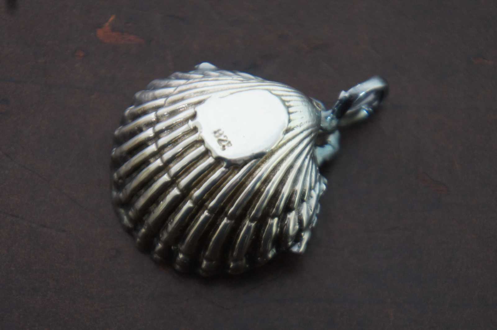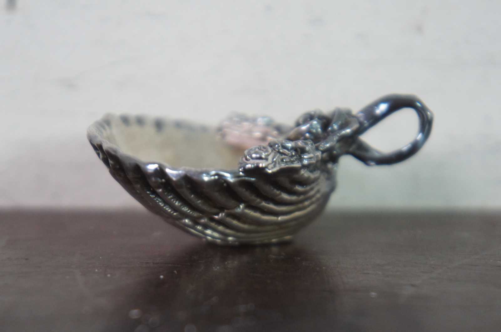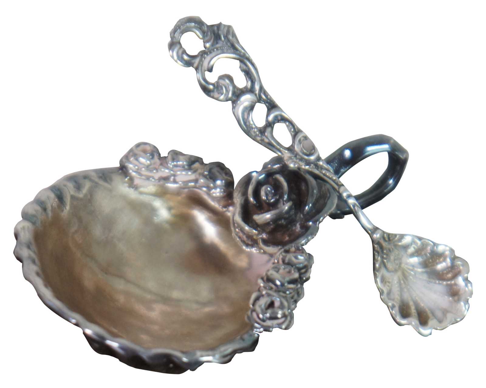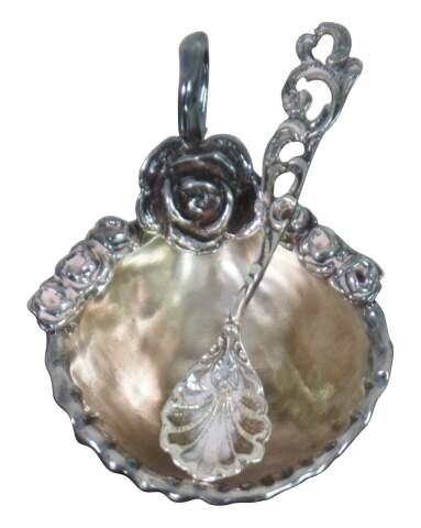 Vintage sterling silver 925 salt cellar / dish / compote in the shape of a scallop shell decorated with roses and a round handle, plus a shell shaped salt spoon.