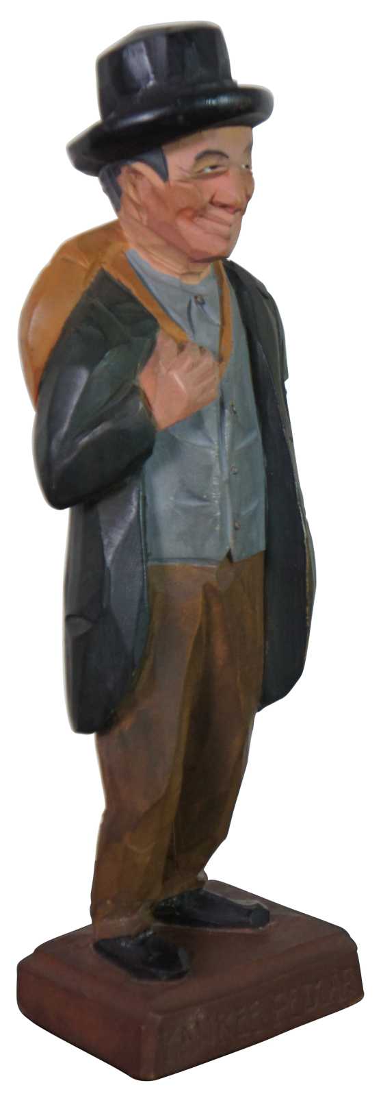 Mid Century carved wood folk art figure by Geral Pat Hannah titled “Yankee Pedlar,” featuring an middle aged man with a pack on his back. “One of the original three Hannah brothers (Charles, Pat and Tom) who became wood carvers in the 1930’s in Quebec. “Pat” Gerald Hannah and his brother Charles learned wood carving from Carl-Johan Trygg (the founder of the Trygg family of artists in Canada.) who had a carving school near Saint-Sauveur, Quebec. He was called Pat because he was born on Saint-Patrick’s day; though living in the predominantly Irish Burrough of Verdun may have had some influence. The Trygg influence is apparent in many works done by him and the other family members who learned their techniques from Pat and Charlie Hannah. After a brief stay in Florida, Pat Hannah re-located in North Poultney, Vermont in 1948. He carved character figures in a full range; from Mounted Police to sailors, famous people and just ‘folks’ in various sizes typically about 6 inches high. All in bright paint and in Pine wood or Basswood. Unlike the Trygg carvers, who applied their bases, Most of the the Hannah sculptors carved the base into their works. In the carvings by ‘Pat’ Hannah, illustrated below, the bases are applied, as the Tryggs were. He signed P. Hannah or Pat Hannah, usually on the bottom of the base with a pencil or later, with a chisel. In the late 50’s he started signing his carvings “By Hannah.” His son, Duncan Hannah, of Vermont, was also a carver of figural characters (see his post). He had another son, Pete Hannah, who may have carved. Carvings stamped “Hand Carved by P. R. Hannah, Quebec” are seen occasionally.”