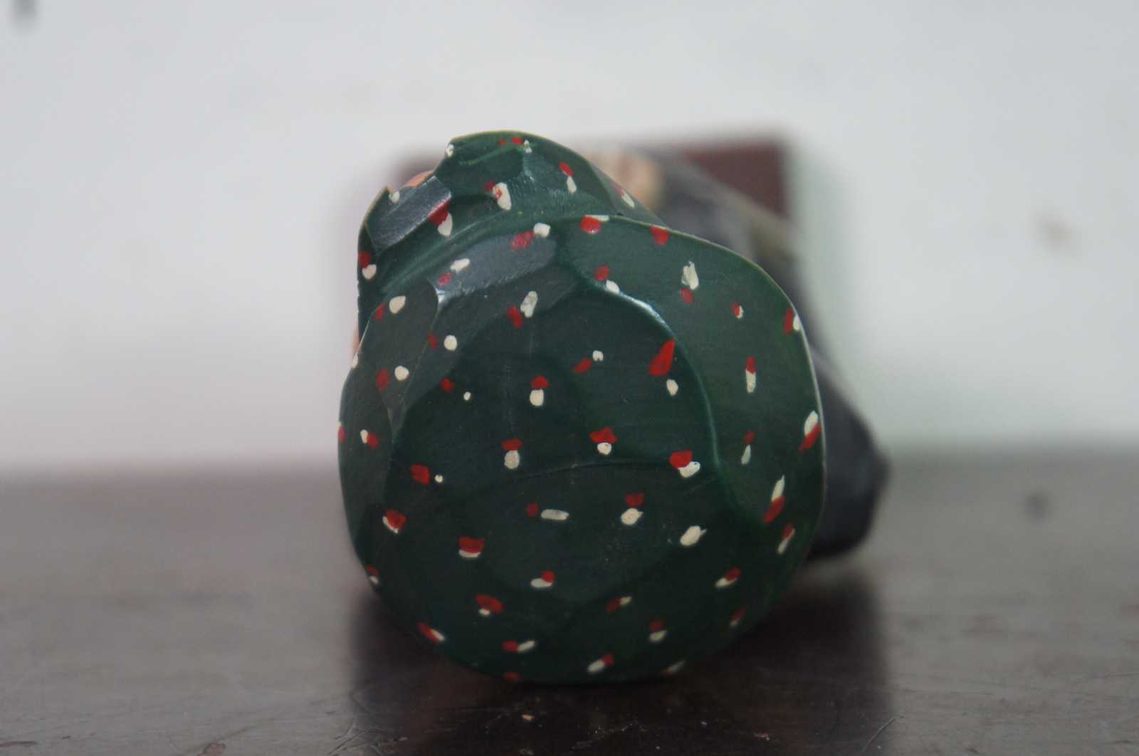 Mid Century carved wood folk art figure by Gerald Pat Hannah titled “Happy Day,” featuring a man with patched trousers, striped scarf and spotted cap, standing with his hands in his pockets, once smoking a cigar. “One of the original three Hannah brothers (Charles, Pat and Tom) who became wood carvers in the 1930’s in Quebec. “Pat” Gerald Hannah and his brother Charles learned wood carving from Carl-Johan Trygg (the founder of the Trygg family of artists in Canada.) who had a carving school near Saint-Sauveur, Quebec. He was called Pat because he was born on Saint-Patrick’s day; though living in the predominantly Irish Burrough of Verdun may have had some influence. The Trygg influence is apparent in many works done by him and the other family members who learned their techniques from Pat and Charlie Hannah. After a brief stay in Florida, Pat Hannah re-located in North Poultney, Vermont in 1948. He carved character figures in a full range; from Mounted Police to sailors, famous people and just ‘folks’ in various sizes typically about 6 inches high. All in bright paint and in Pine wood or Basswood. Unlike the Trygg carvers, who applied their bases, Most of the the Hannah sculptors carved the base into their works. In the carvings by ‘Pat’ Hannah, illustrated below, the bases are applied, as the Tryggs were. He signed P. Hannah or Pat Hannah, usually on the bottom of the base with a pencil or later, with a chisel. In the late 50’s he started signing his carvings “By Hannah.” His son, Duncan Hannah, of Vermont, was also a carver of figural characters (see his post). He had another son, Pete Hannah, who may have carved. Carvings stamped “Hand Carved by P. R. Hannah, Quebec” are seen occasionally.”