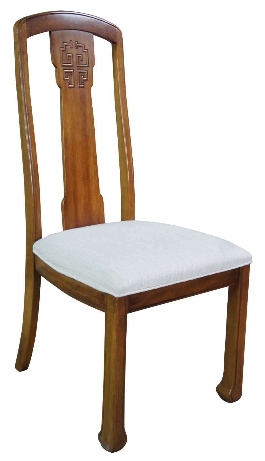 8 Vintage stanley furniture dining chairs, circa last quarter 20th century. Features an oriental carved back splat and ming inspired feet.