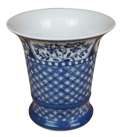 This blue and white vase features an intricate lattice design and floral motif by centrum ceramics.
