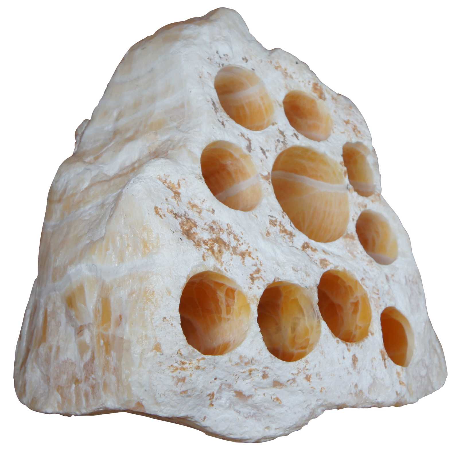The discovery came about completely by accident, when topsoil was being removed and workers noticed the “glowing” stone, caused by the sun refracting through the calcite crystals. Comparable to onyx and marble, Honeycomb Calcite can be used for dramatic accents in artistic, decorative and architectural applications.