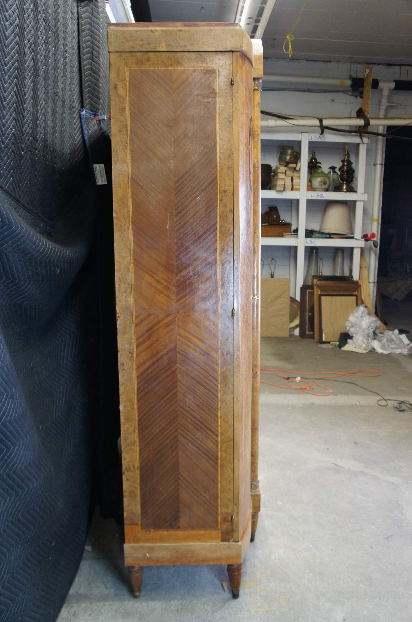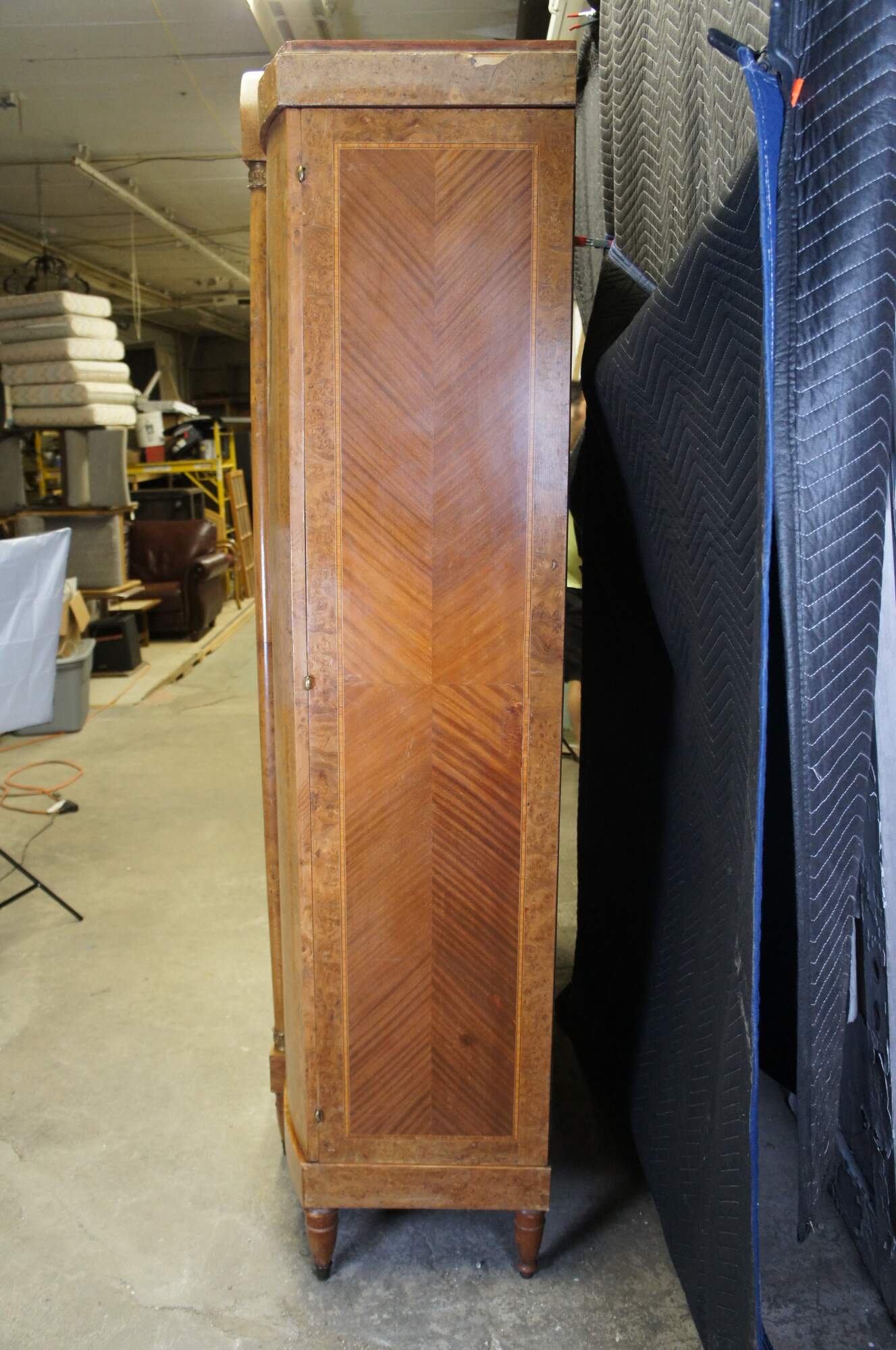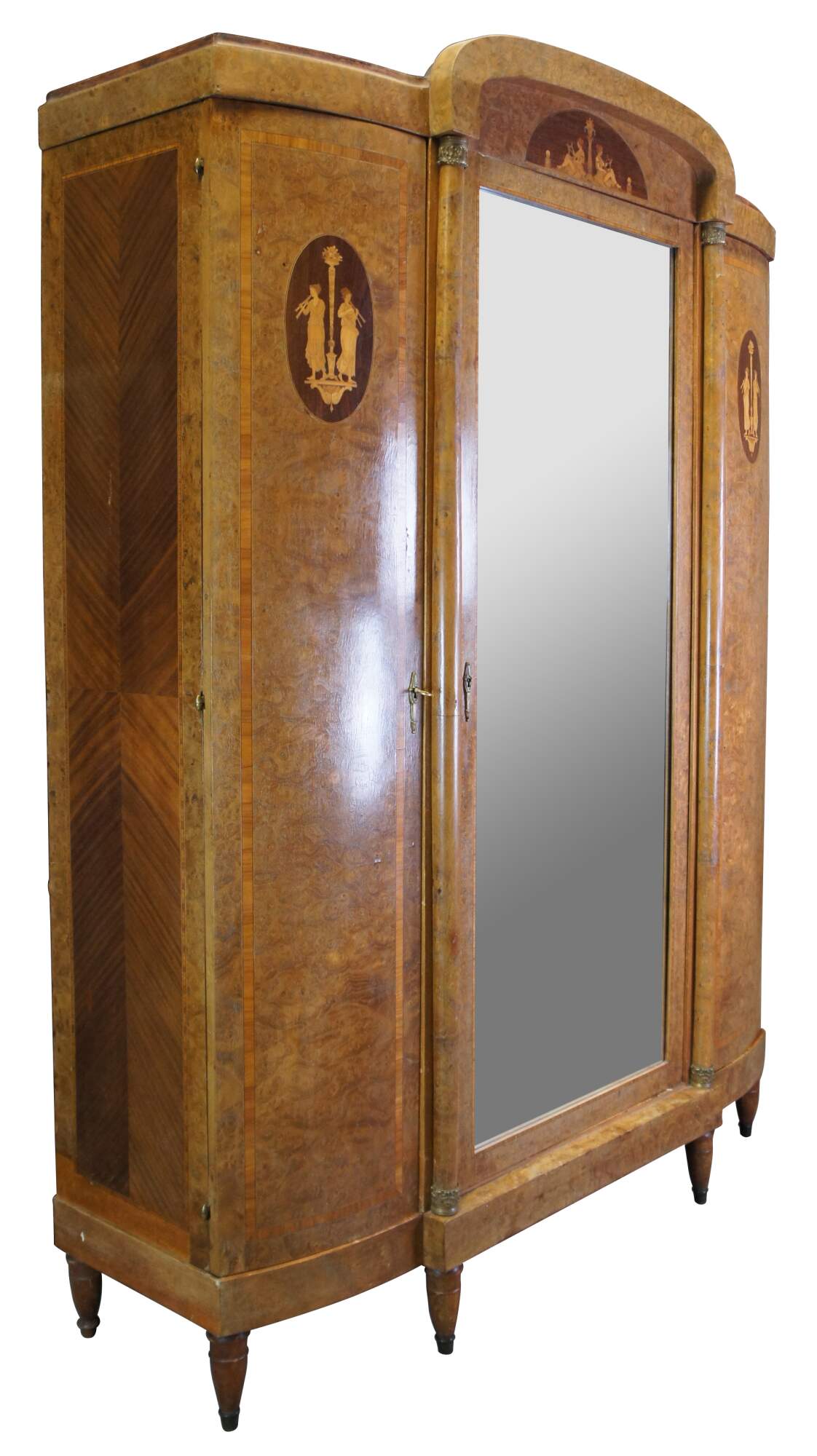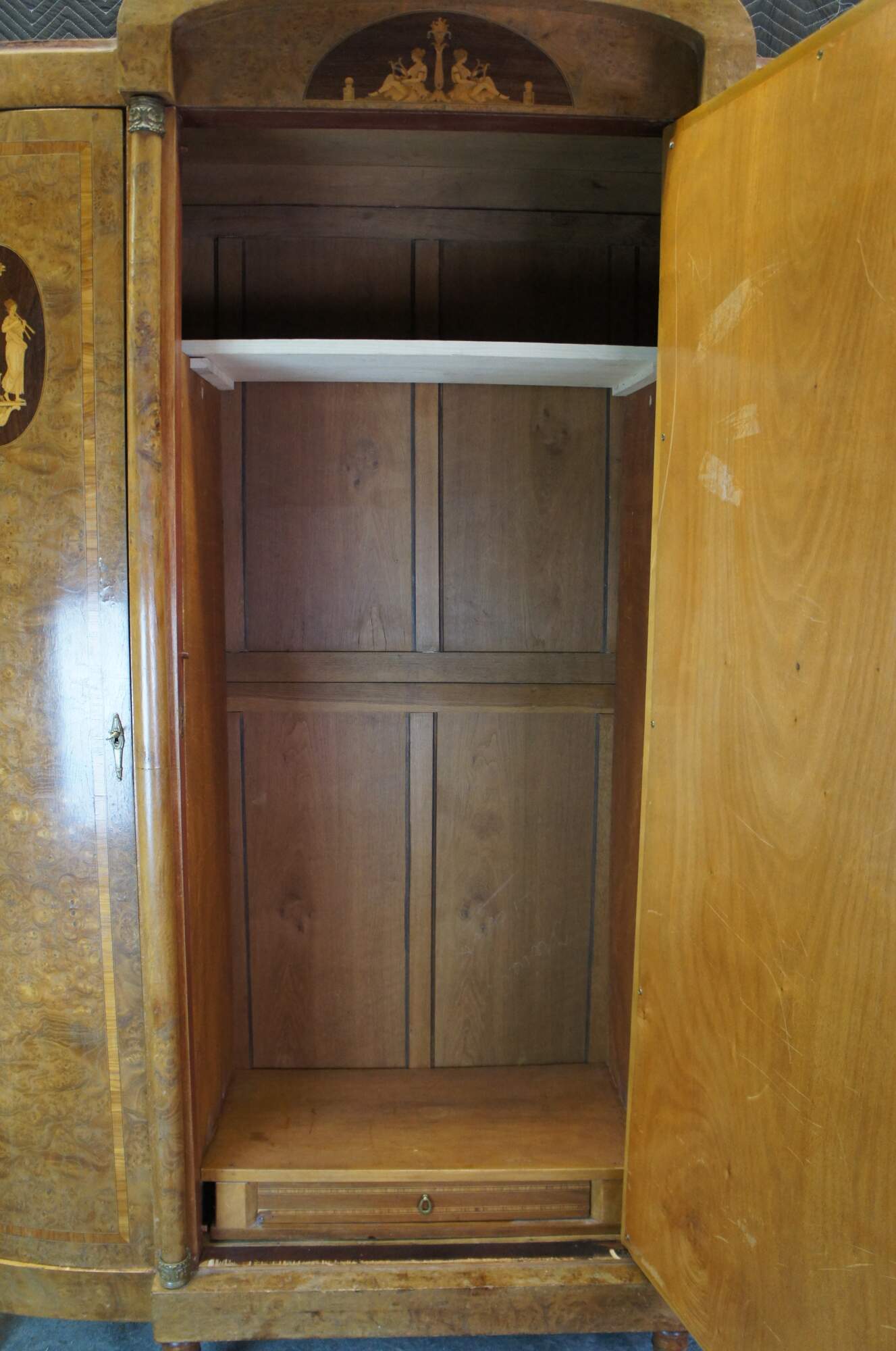 A beautiful Italian Neoclassical knockdown armoire or wardrobe from the last quarter of the 19th century. Rectangular in form with bowfront and domed top, accompanied by graceful brass capped columns along the front. Made from walnut and olive ash burl with banding, figural inlay and cameo inlay features of a Grecian woman holding an amphora or wine jug on her shoulders.