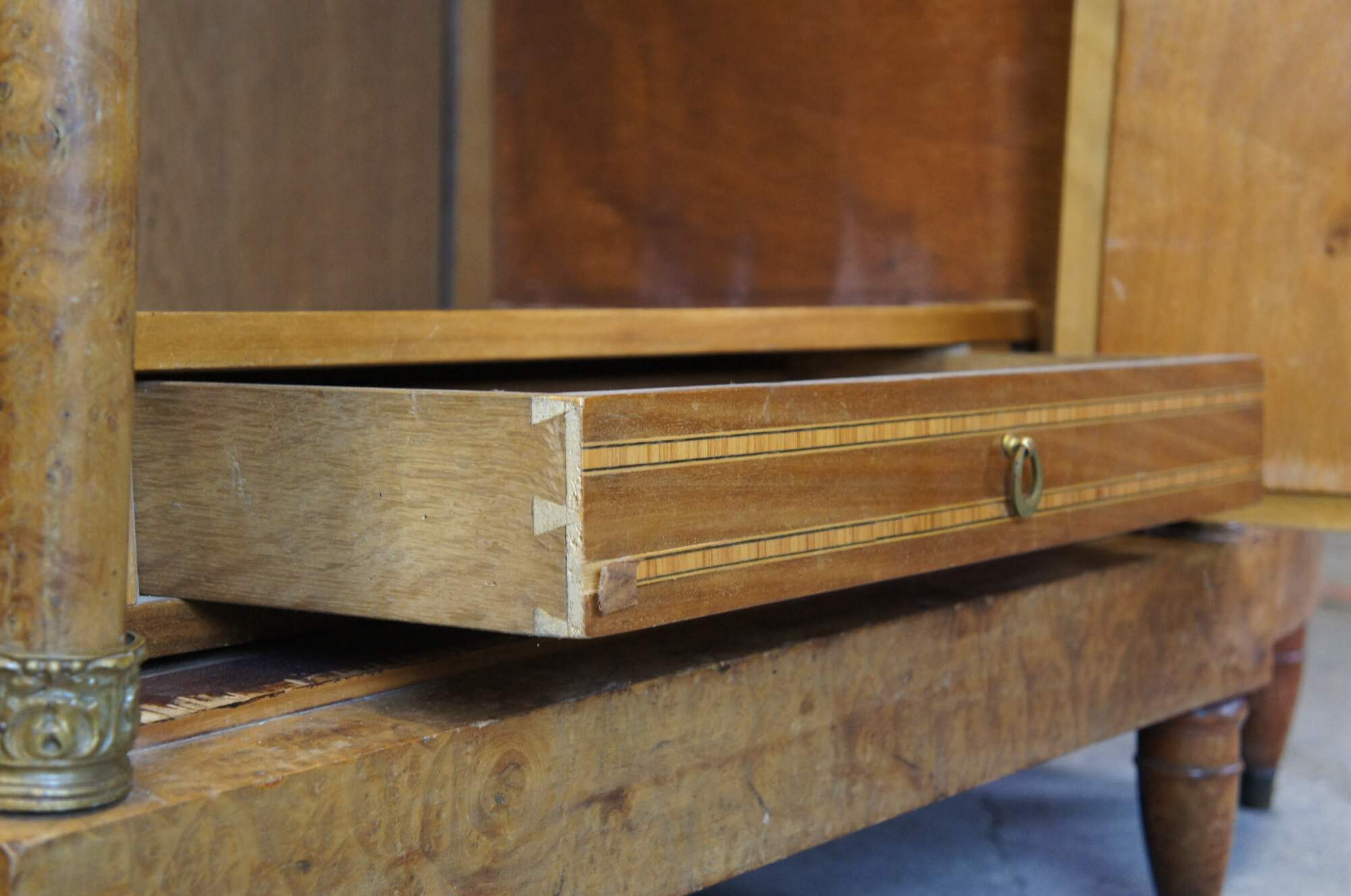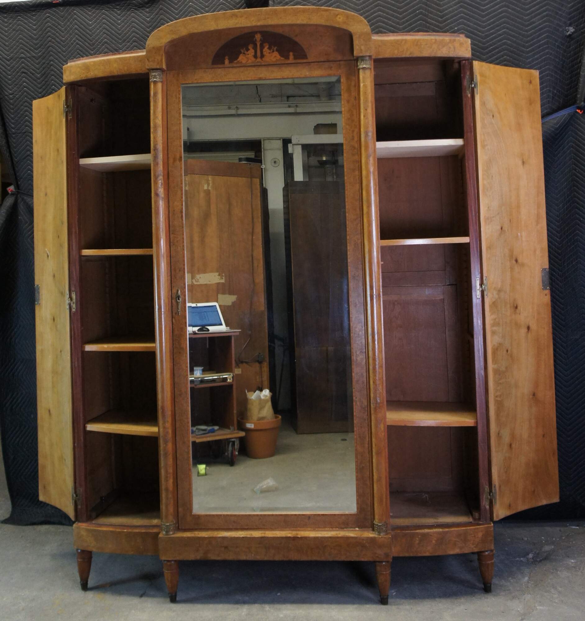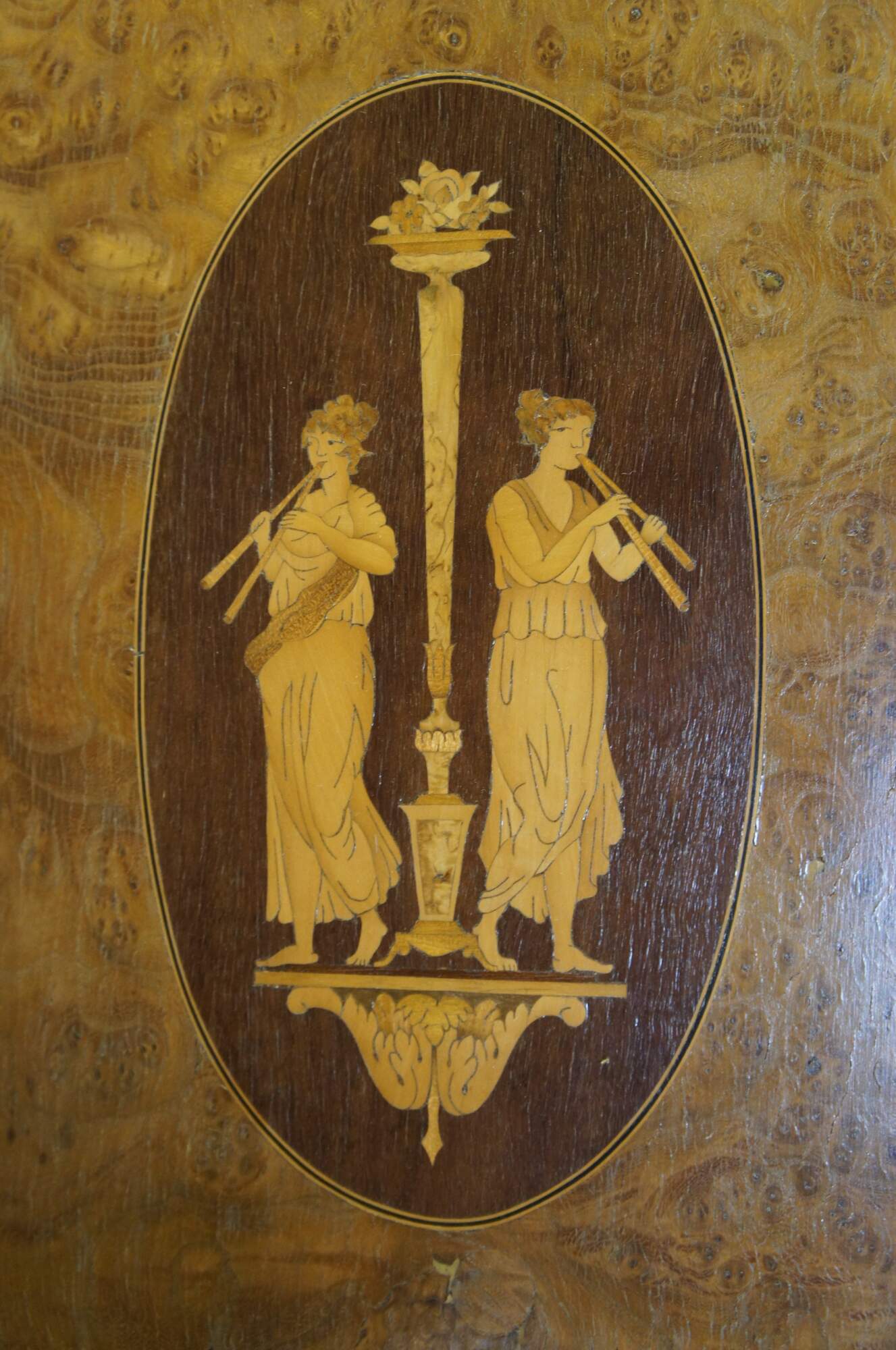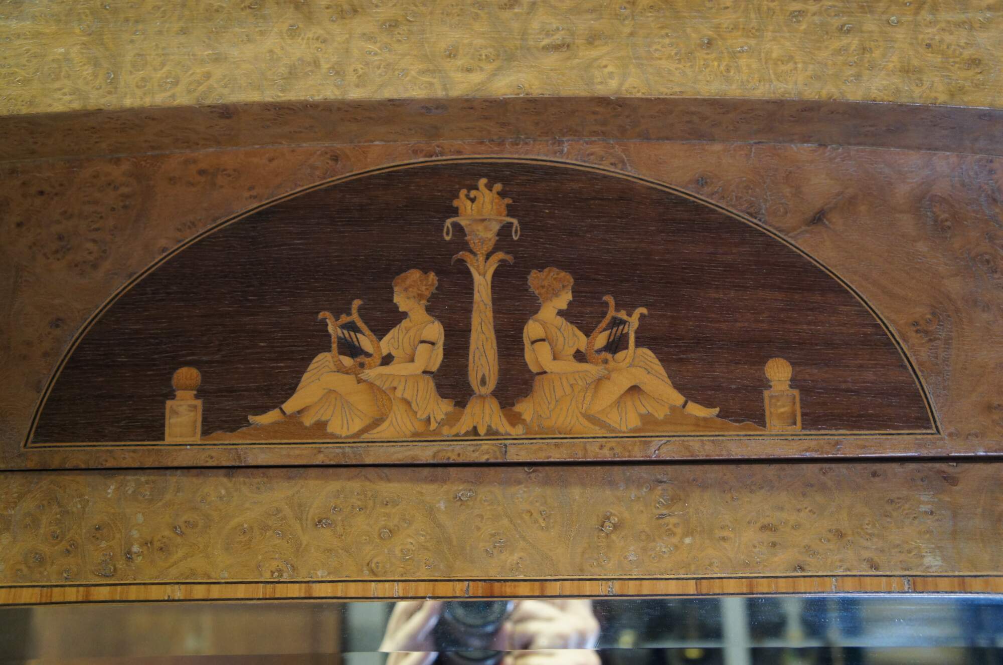 A beautiful Italian Neoclassical knockdown armoire or wardrobe from the last quarter of the 19th century. Rectangular in form with bowfront and domed top, accompanied by graceful brass capped columns along the front. Made from walnut and olive ash burl with banding, figural inlay and cameo inlay features of a Grecian woman holding an amphora or wine jug on her shoulders.