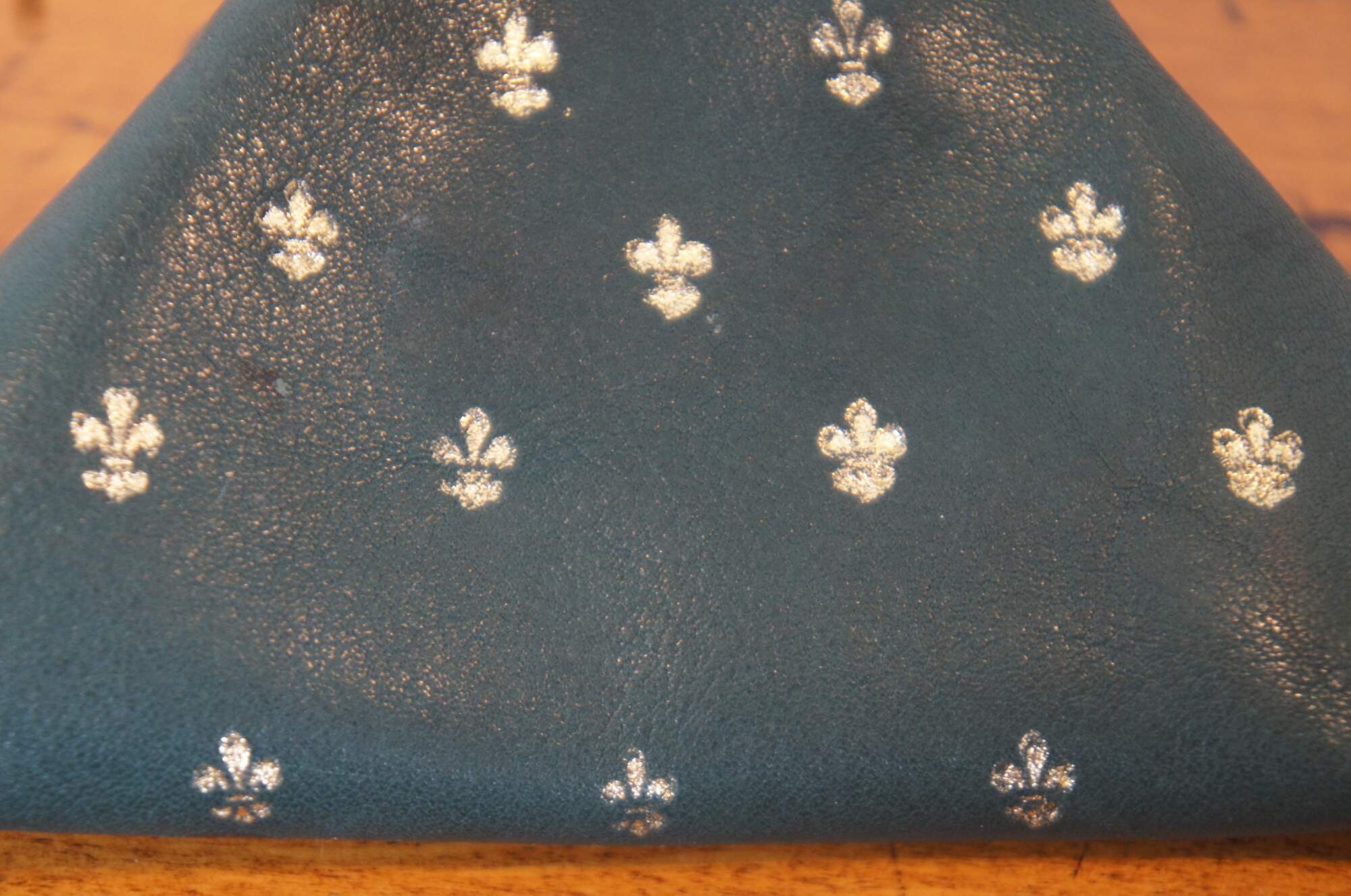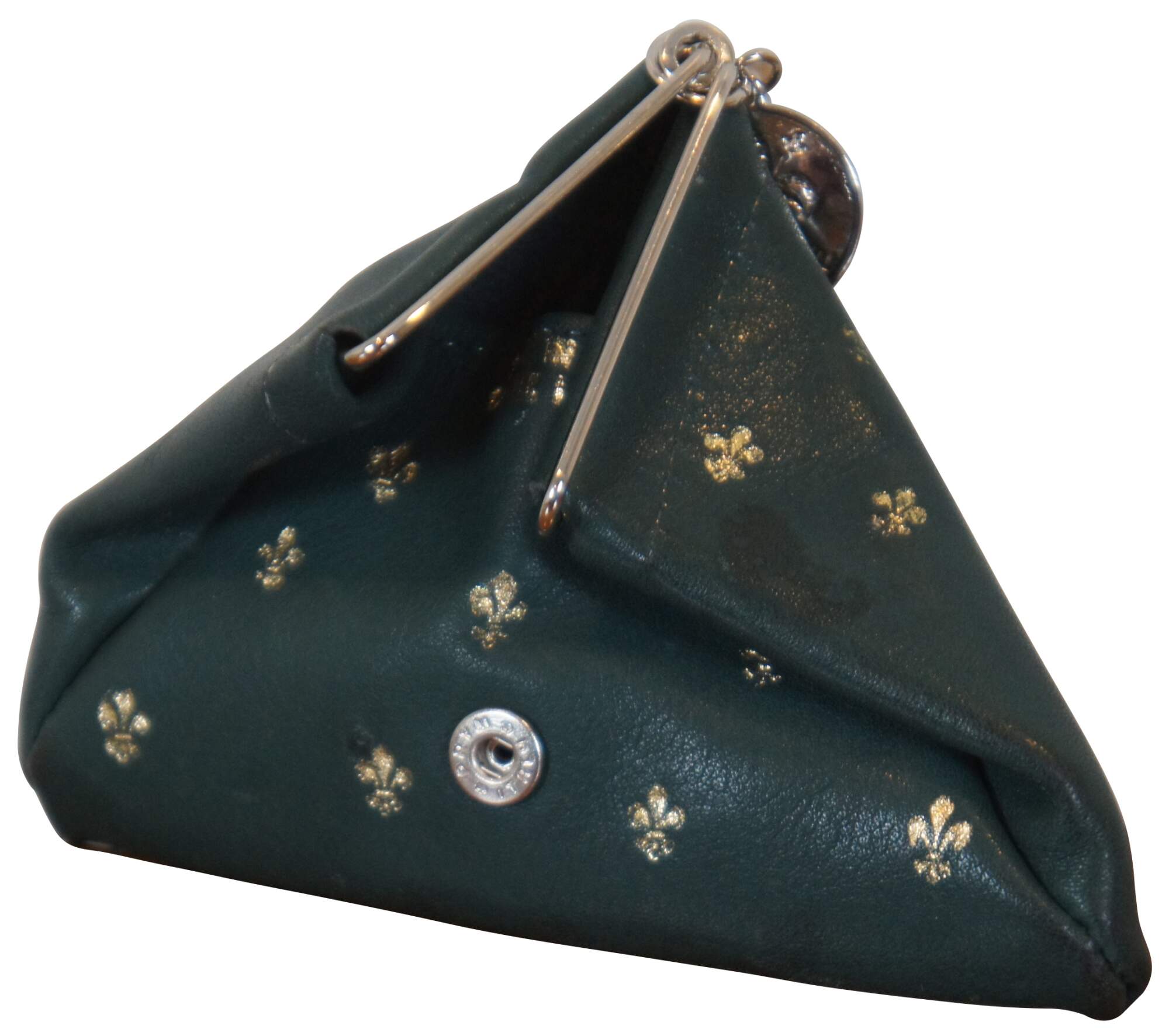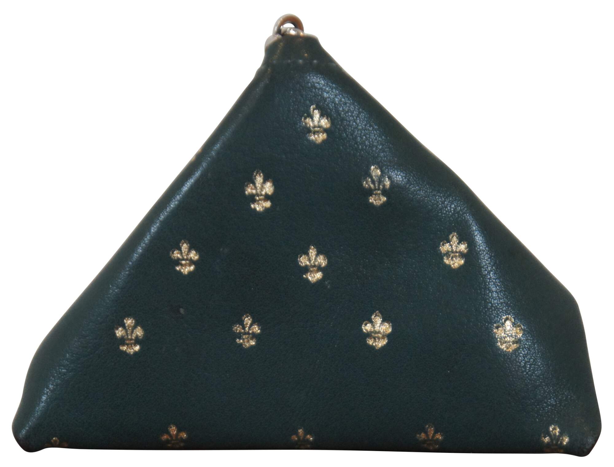 Vintage Firenze Fiocchi folding triangular shaped coin purse made of green Florentine leather stamped with gold fleur de lis.