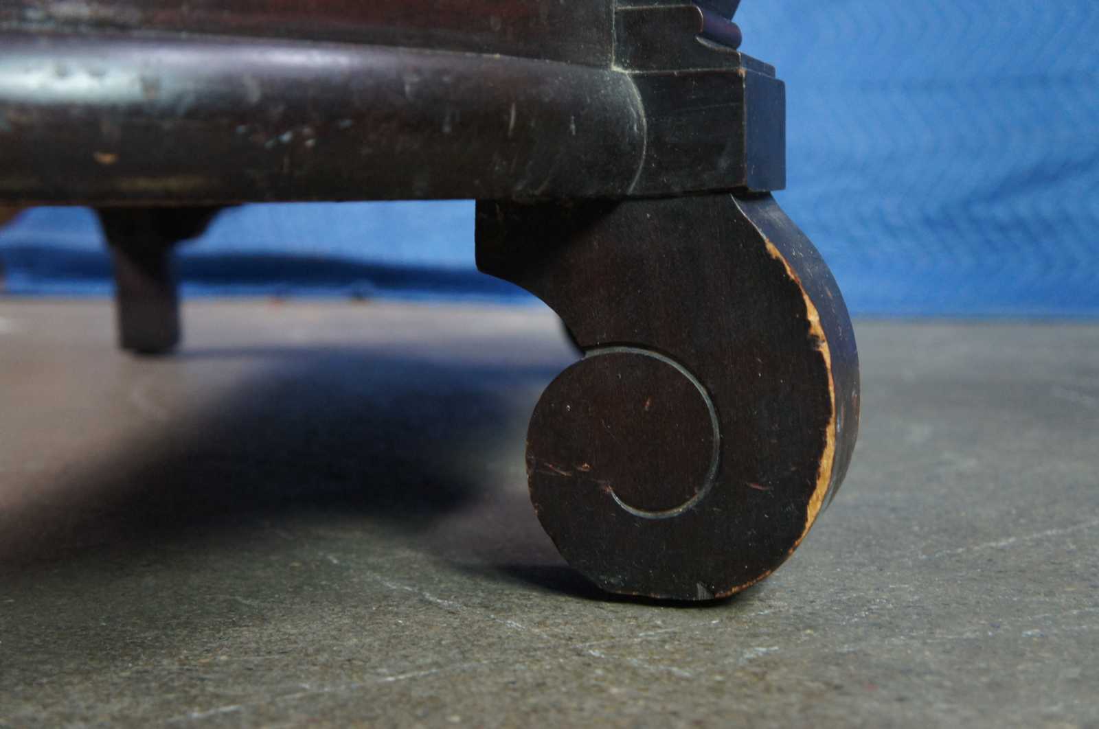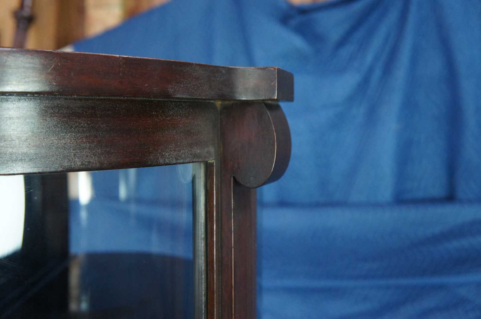 Antique mahogany bow front curio display or china cabinet featuring American Empire styling with curved glass doors, wood shelves and scrolled legs.