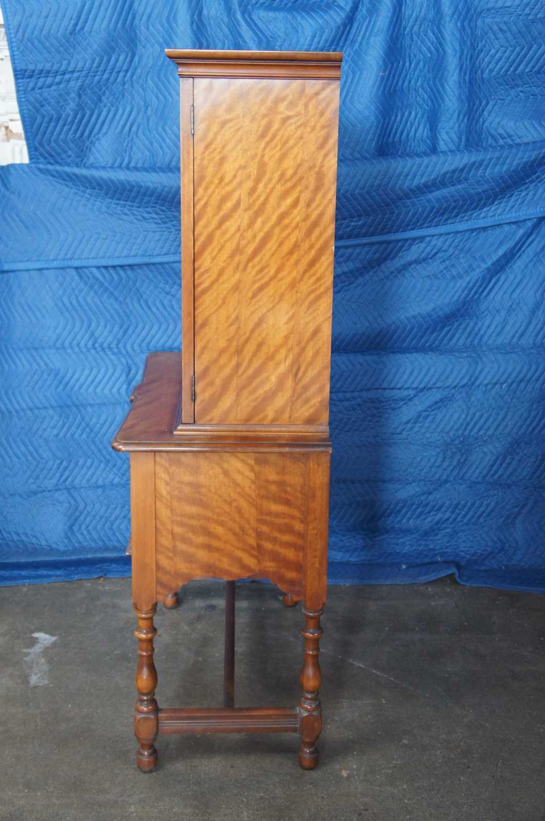 Circa 1940s William & Mary style maple flamed cupboard, cabinet or china hutch featuring old cherry finish with three shelves and lower drawer.