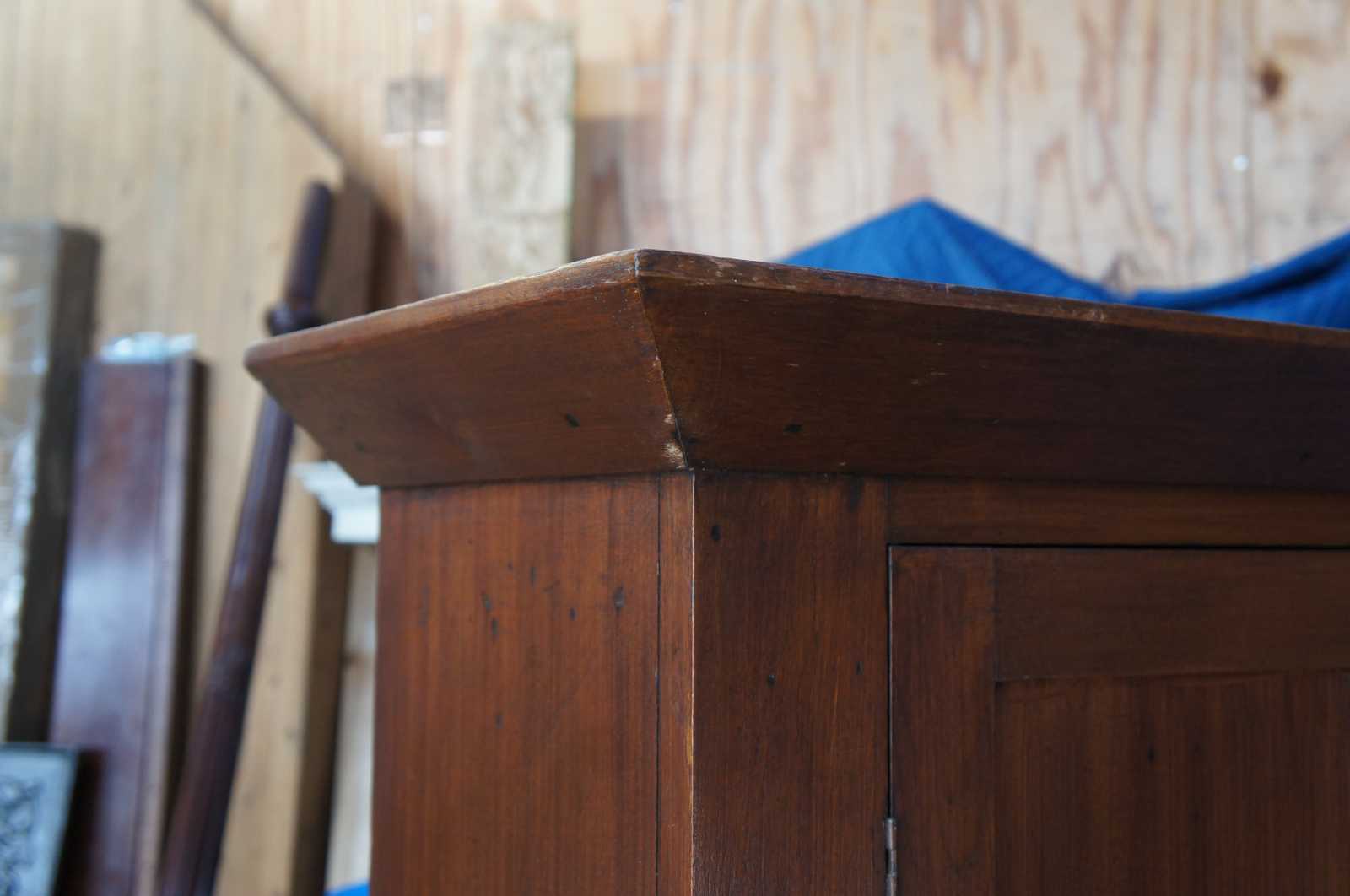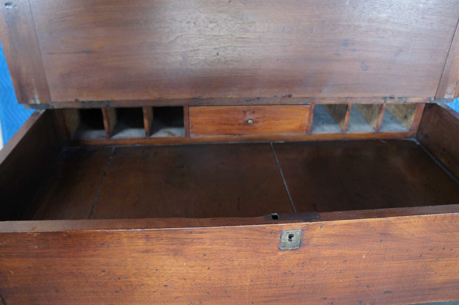 Good overall condition, wear and distressing commensurate with age and use, marking, finish loss, missing side drawer (can be remade if interested), no key to lower portion.