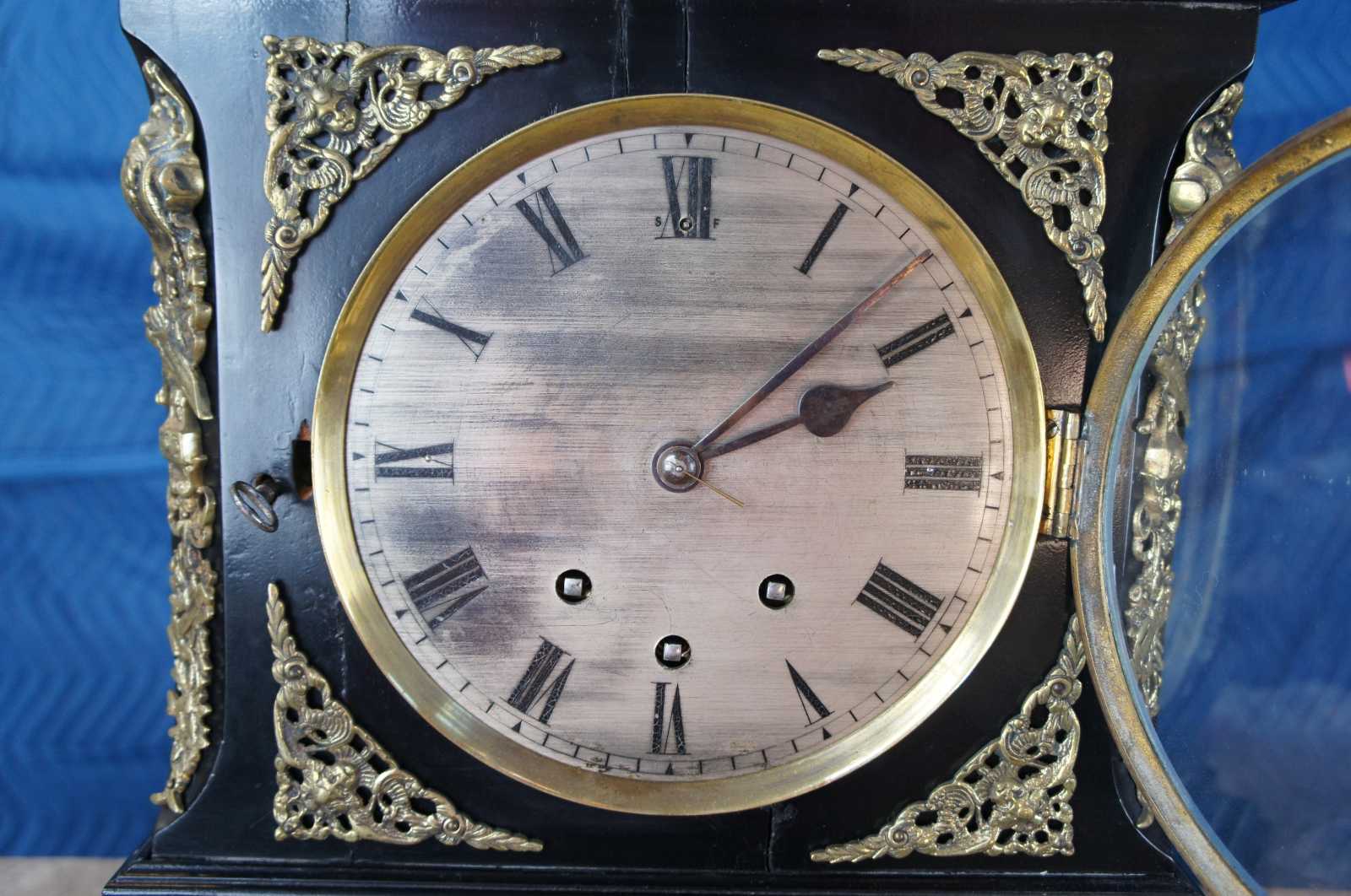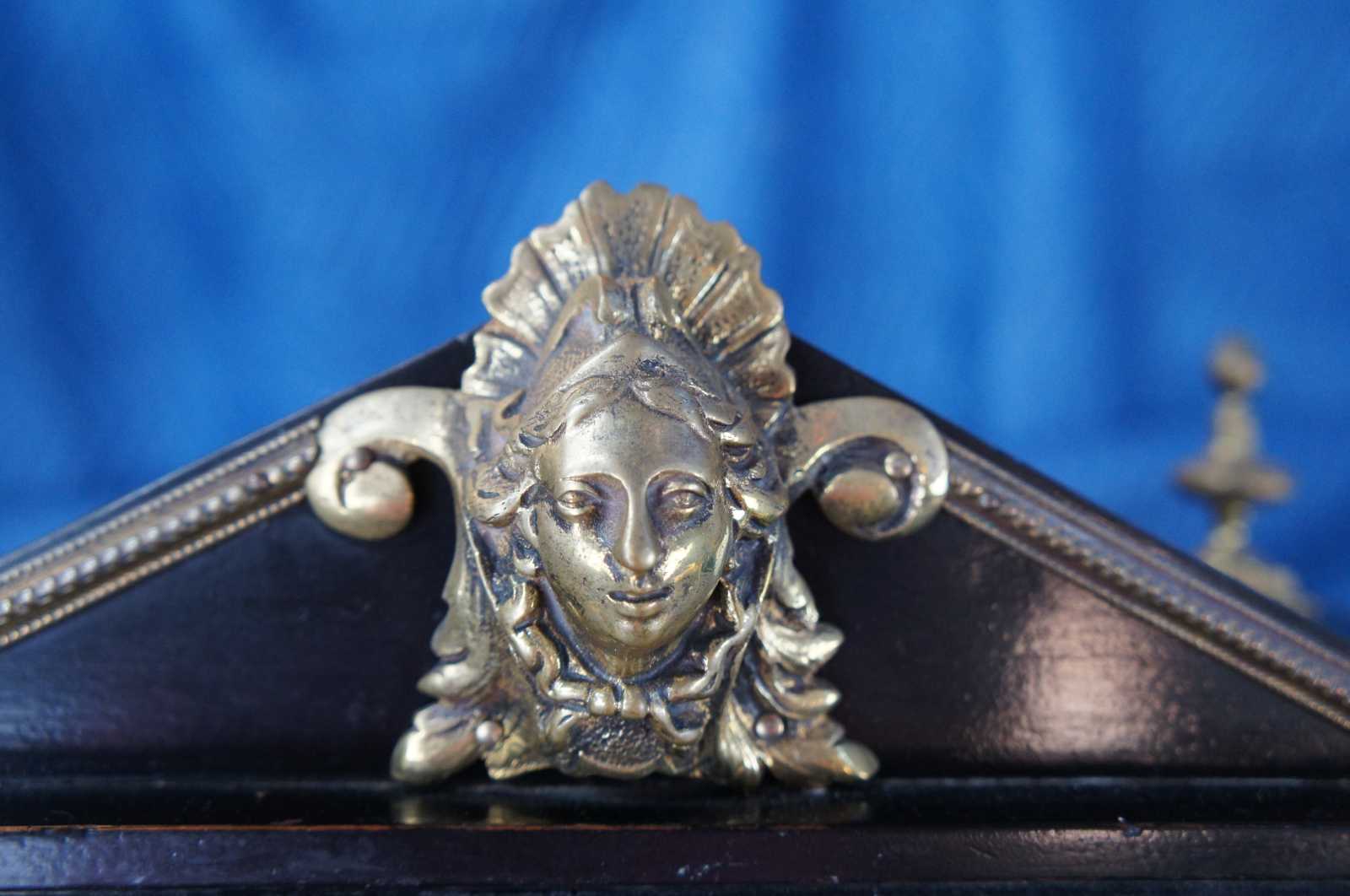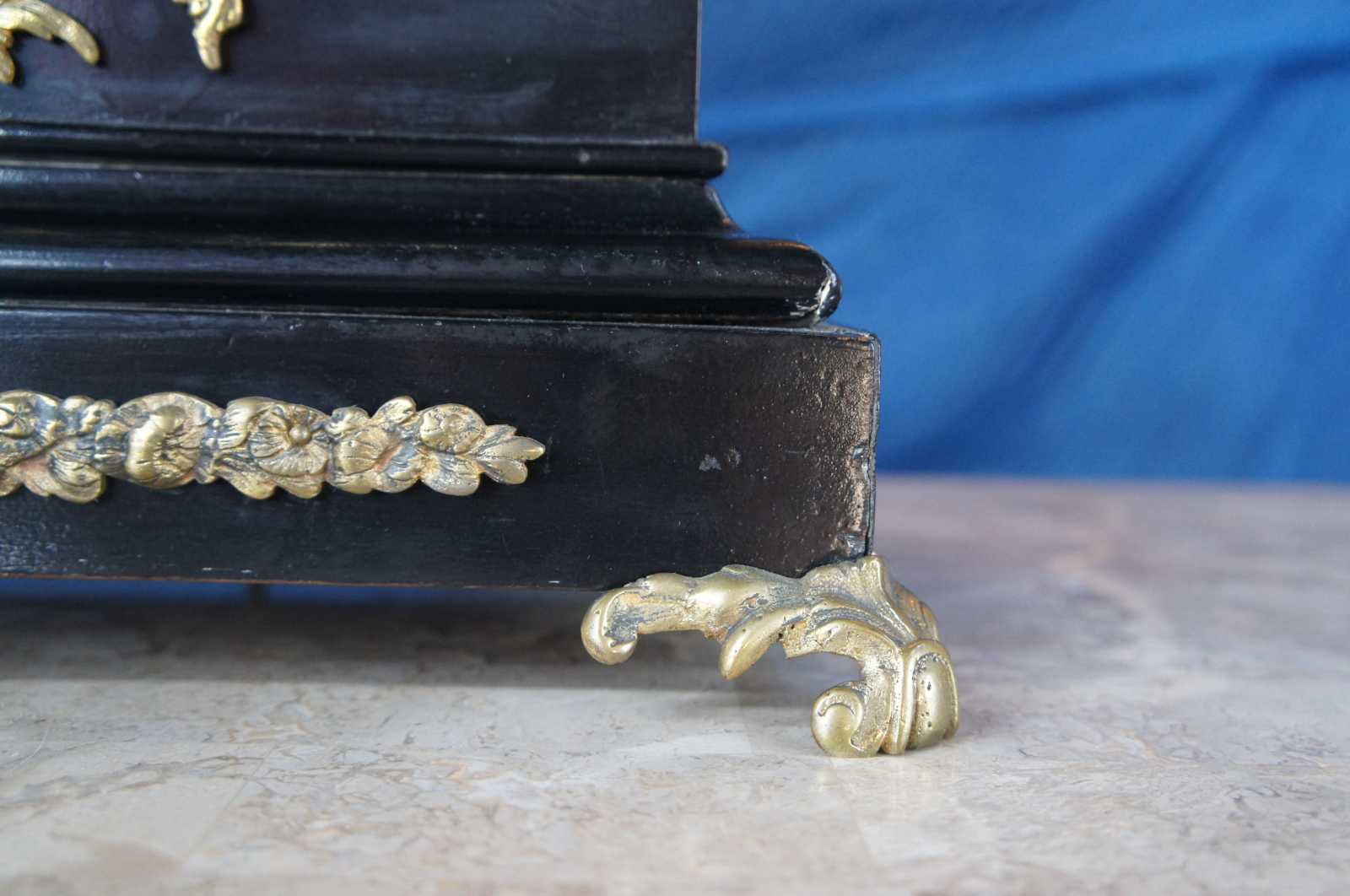 Antique English Georgian bracket clock featuring ebonized case with ormolu accents. The ornate case features gothic styling with an arched top, mesh gilt side panels, jardiniere urn shaped finials and figural mount. Chimes beautifully with several bells and hammers allowing for a musical hymn.