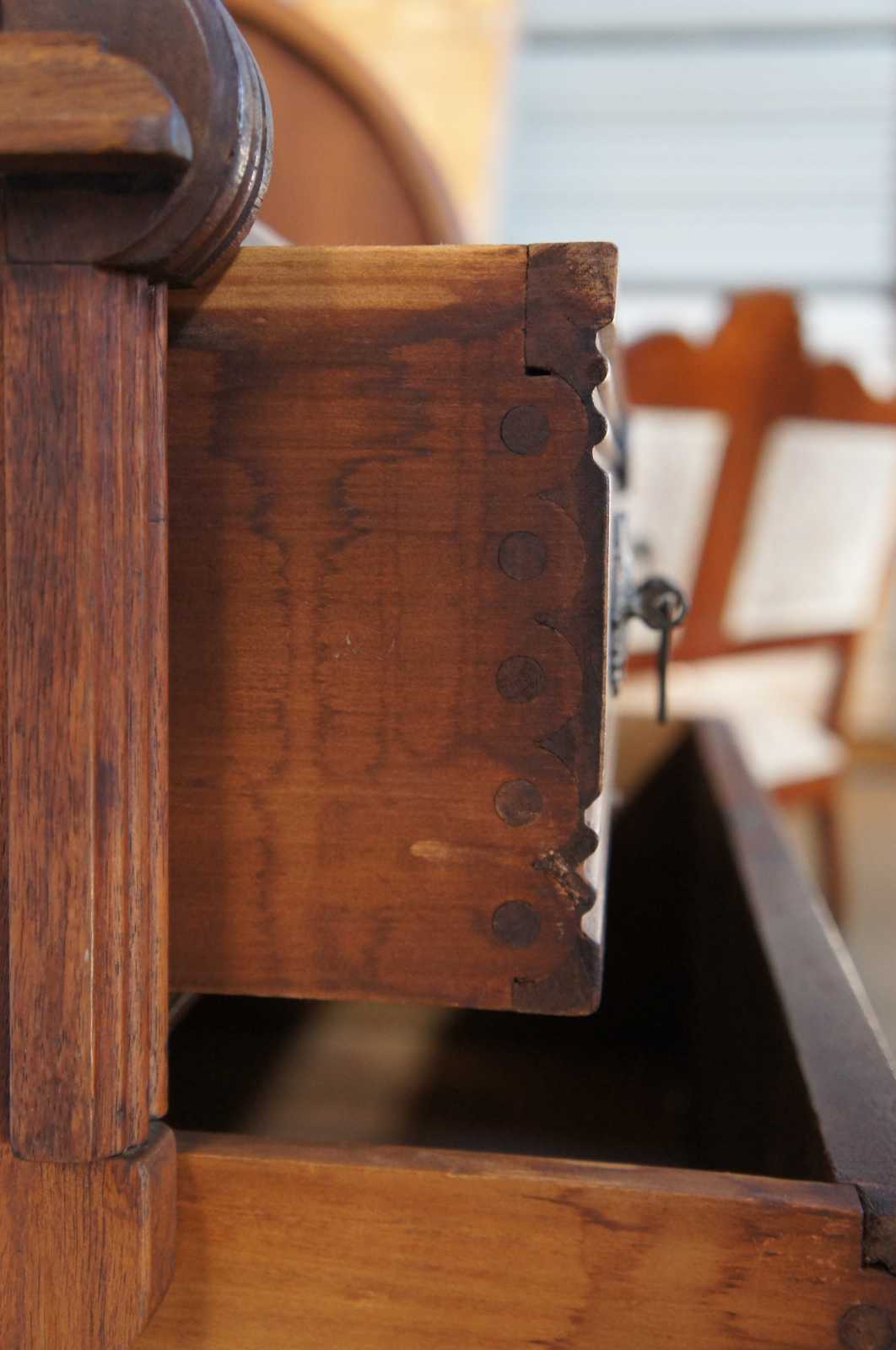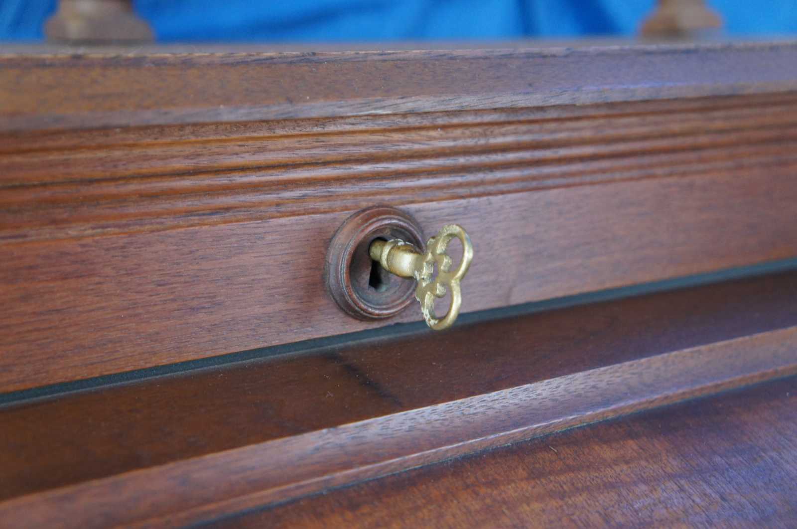 Good antique condition, wear and distressing commensurate with age and use, light marking, key included, all locks work.