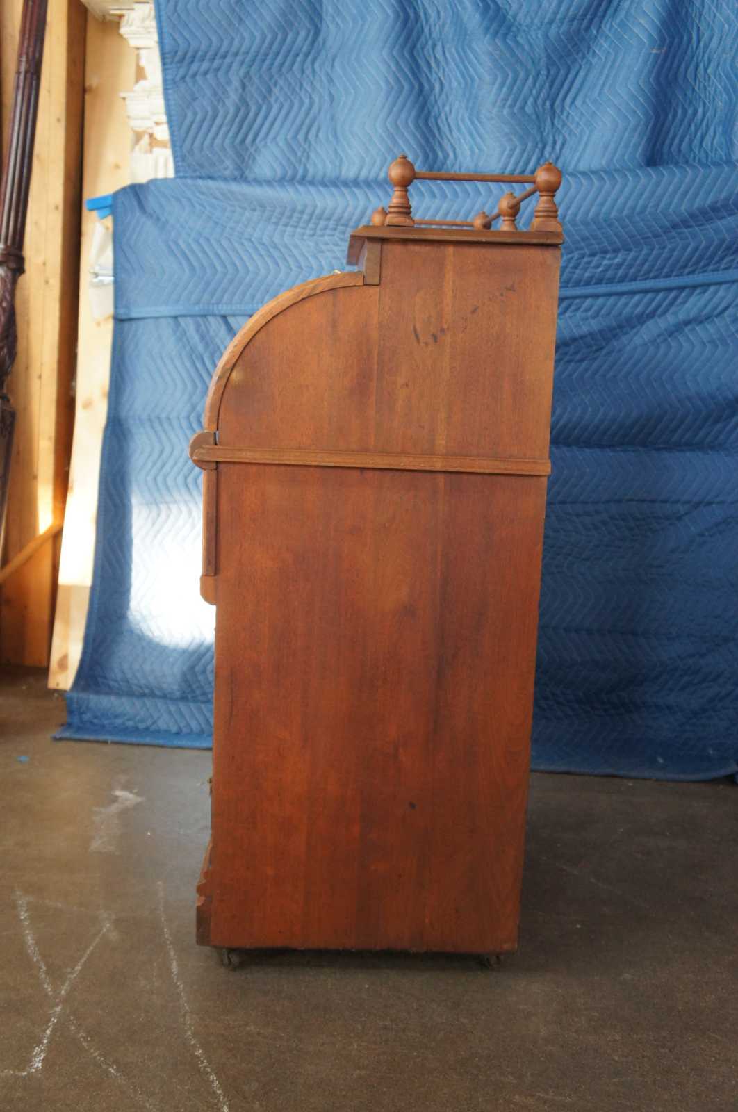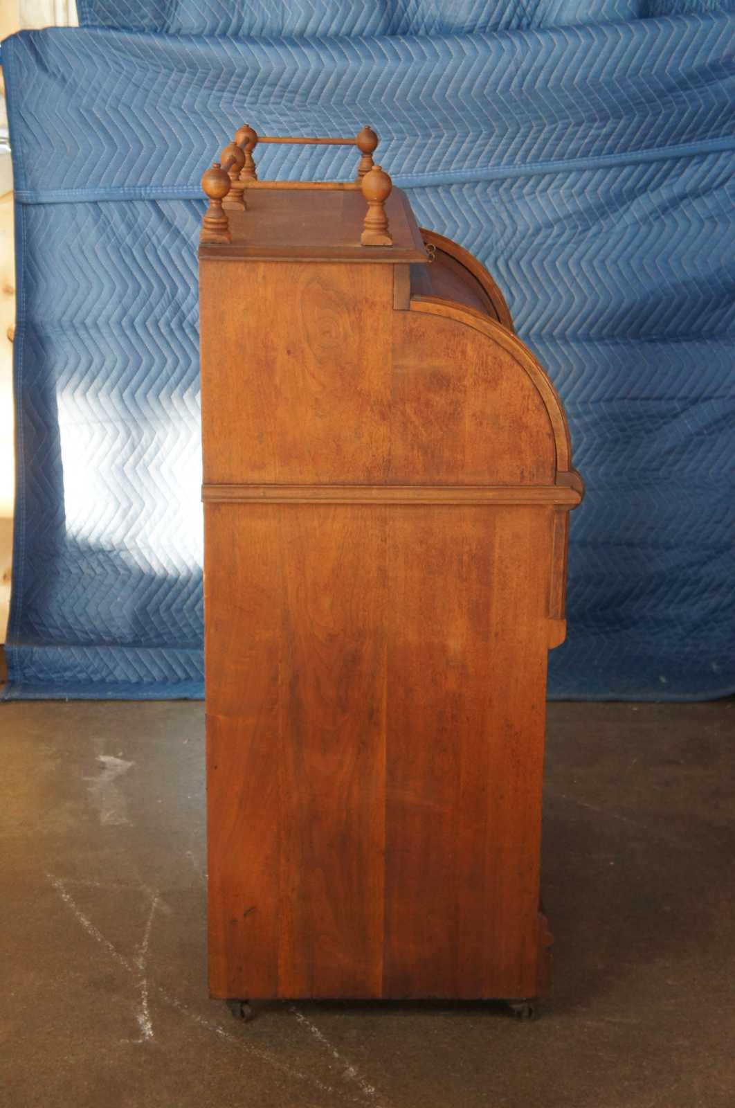 Antique 19th century Aesthetic period cylinder roll top secretary writing desk. Made of maplewood featuring lower chest with three knapp joint drawers, a roll top that opens to leather pullout writing surface with multiple drawers and cubbies, upper ball and stick gallery, and brass hardware with ornate key. Made in Massachusetts by E.A. Peters, circa 1870s.