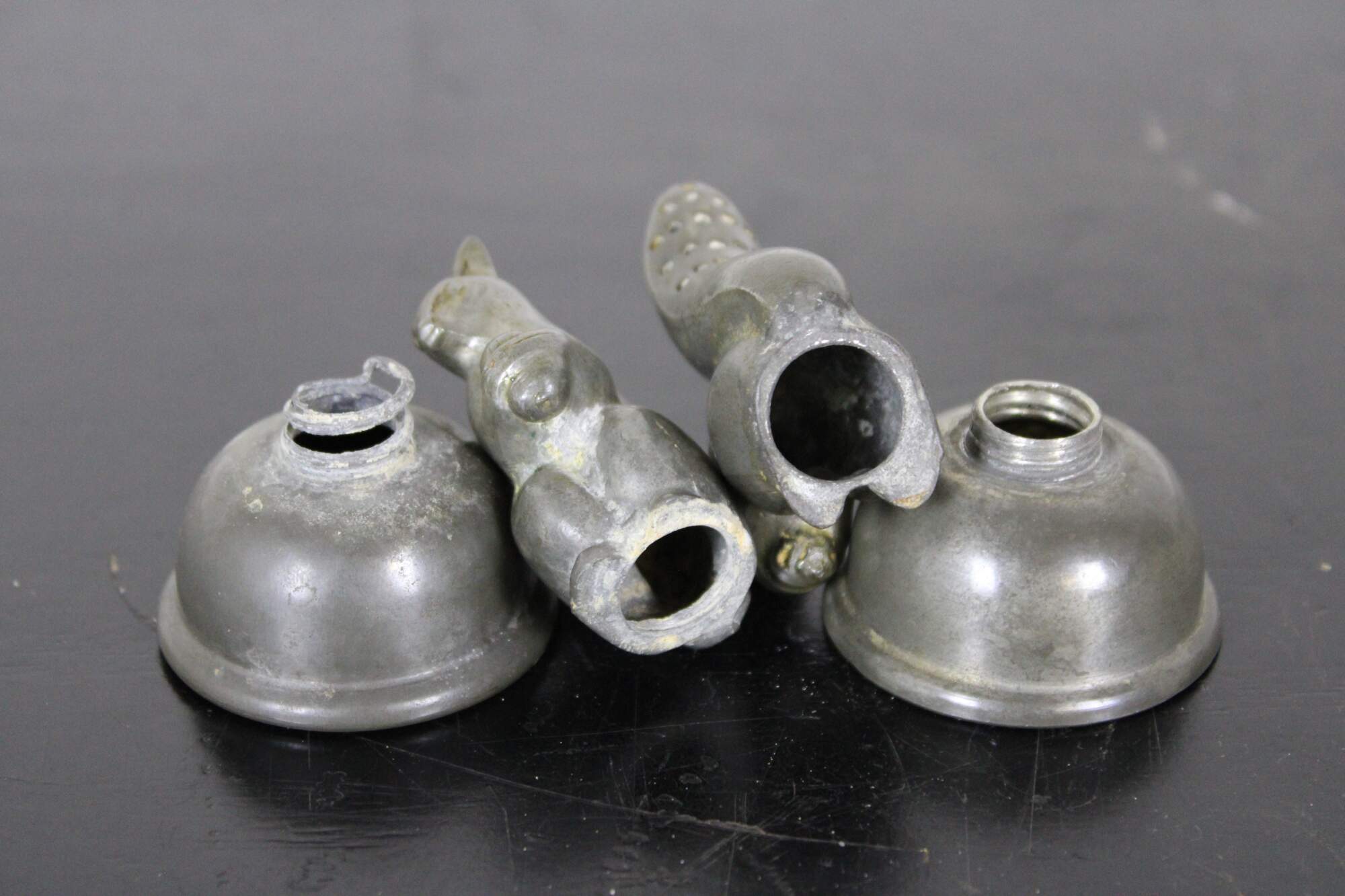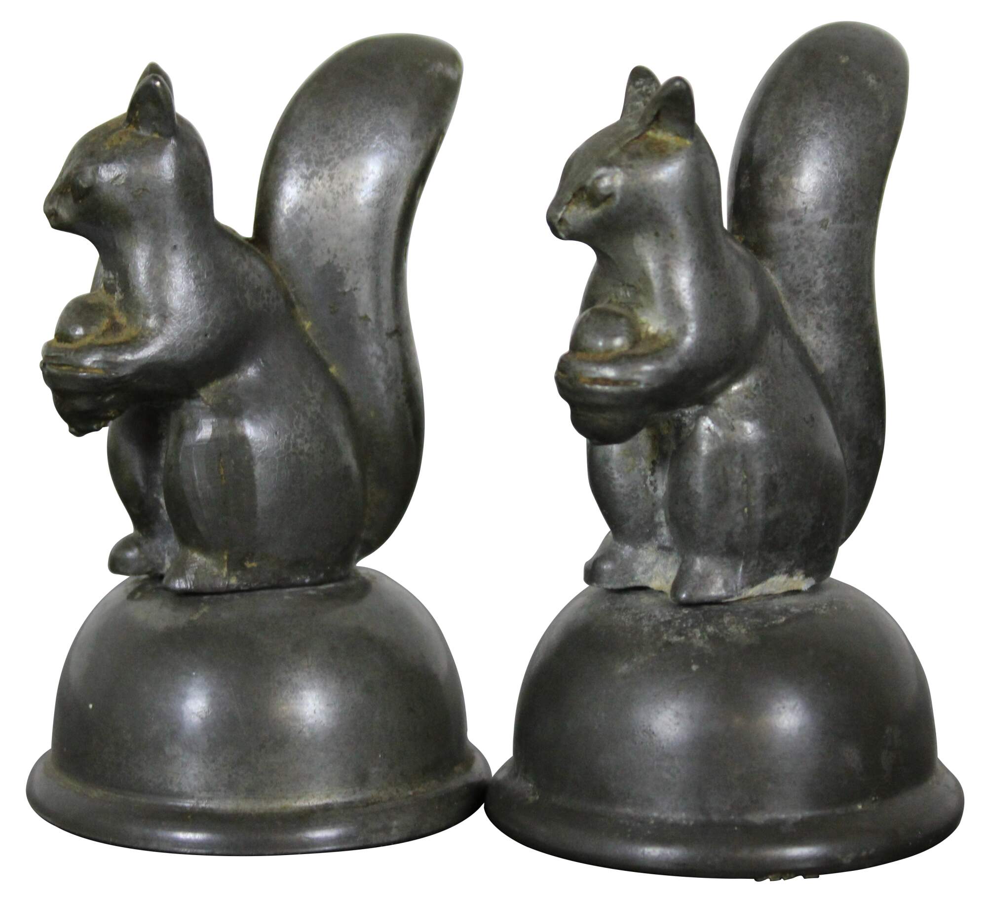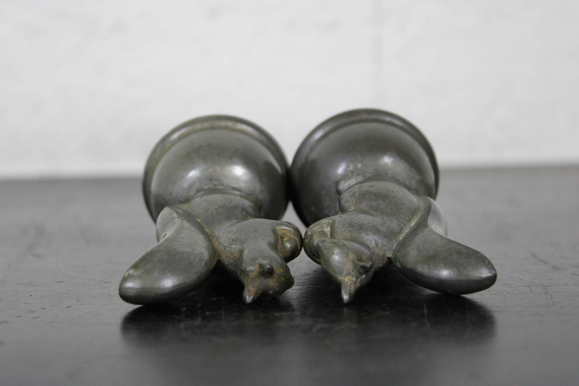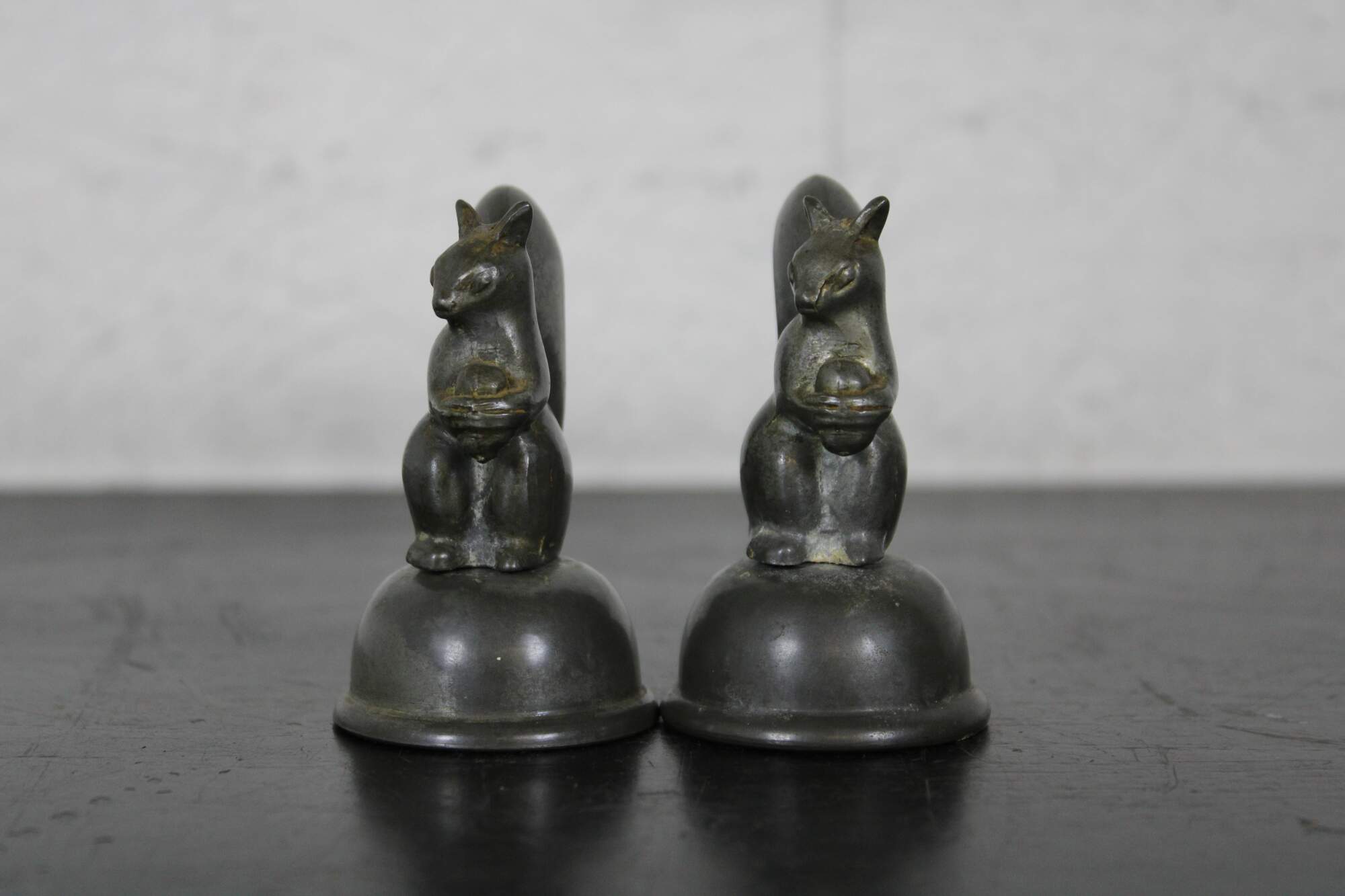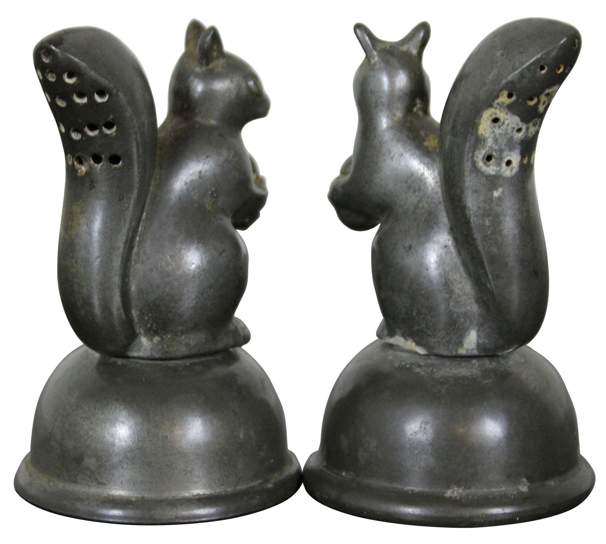 Vintage mid century modern pewter salt and pepper shakers in the shape of squirrels on round bases, holding a nut, hand made by The Danish Silversmith.