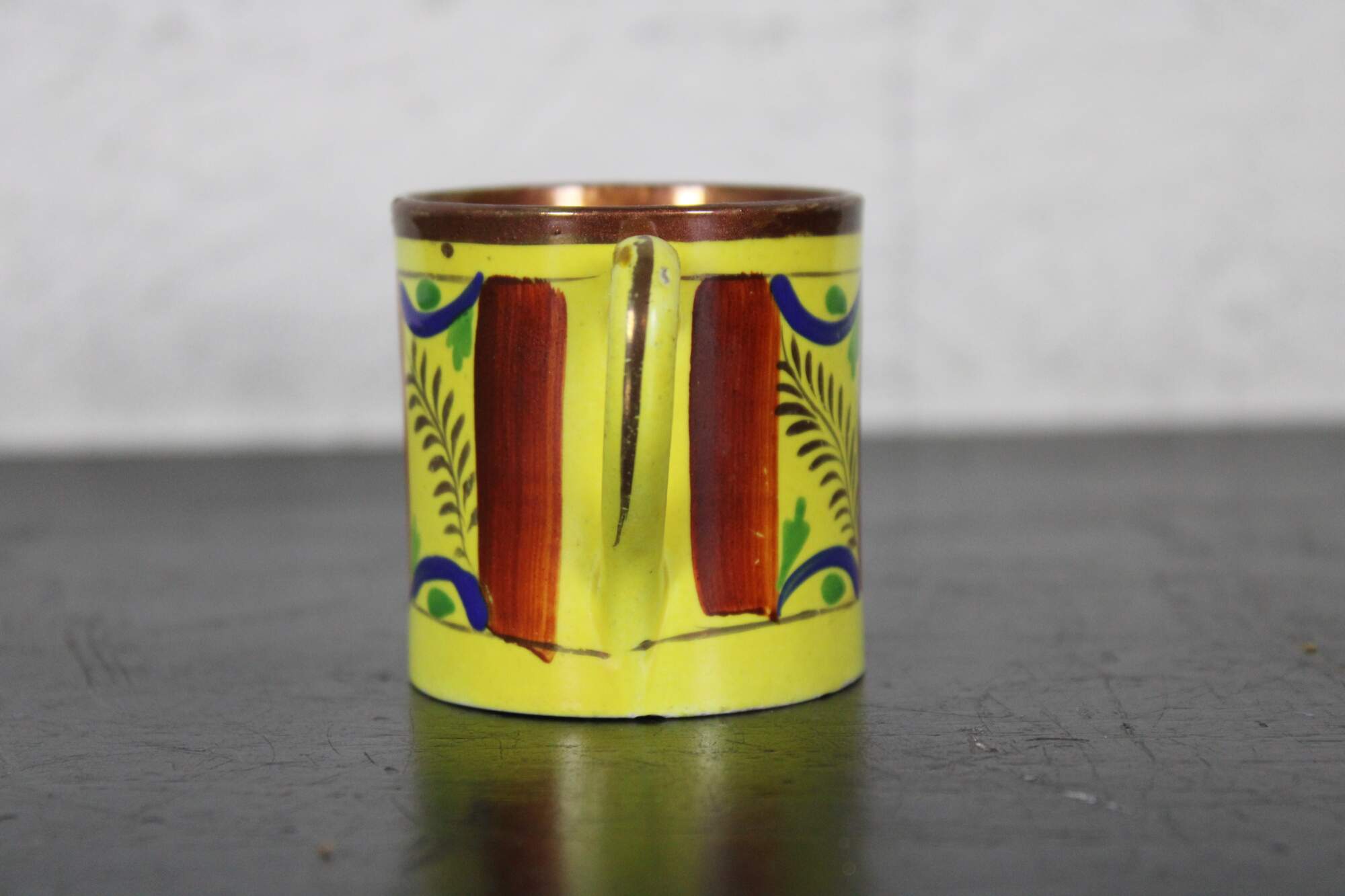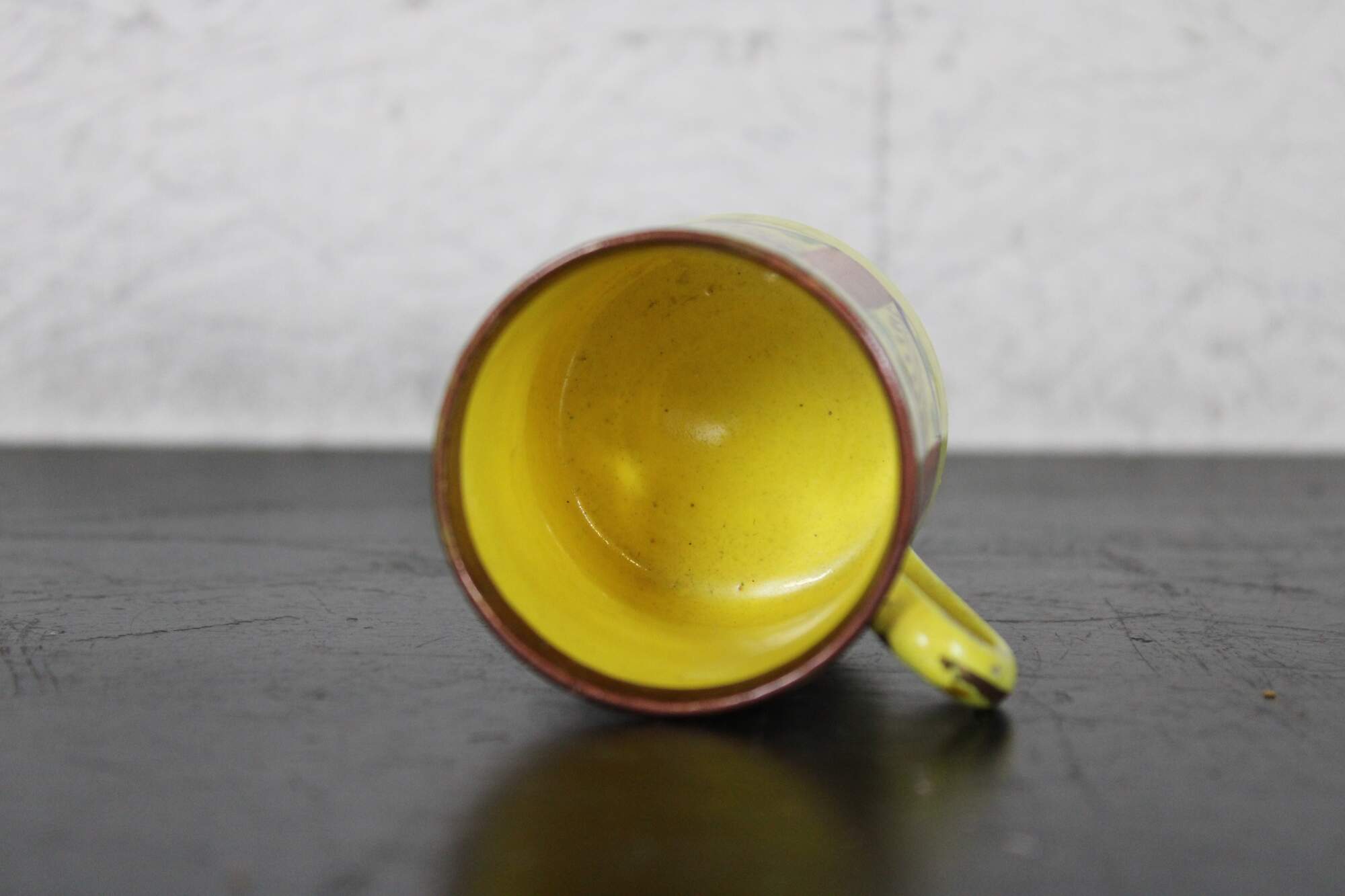 Vintage hand painted miniature porcelain mug in yellow with a segmented leaf motif and brown border.