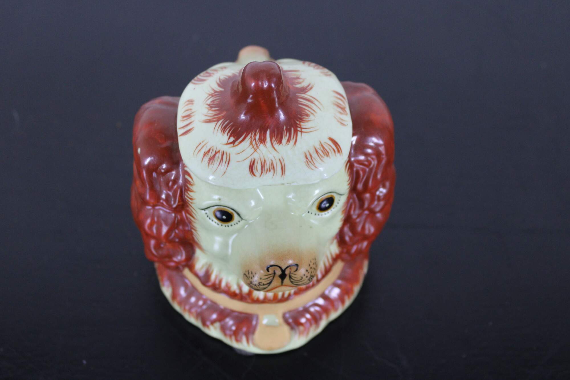 British 19th Century crackle Staffordshire with iron red & black enamels, Two Faced Spaniel Head Candy Jar with collar and tag.
