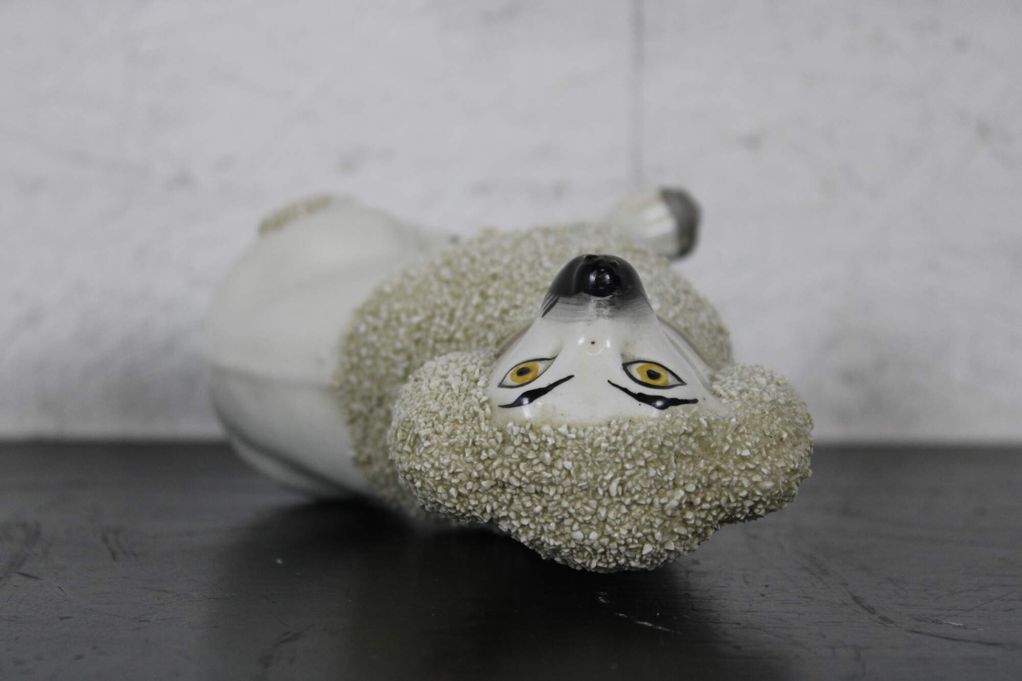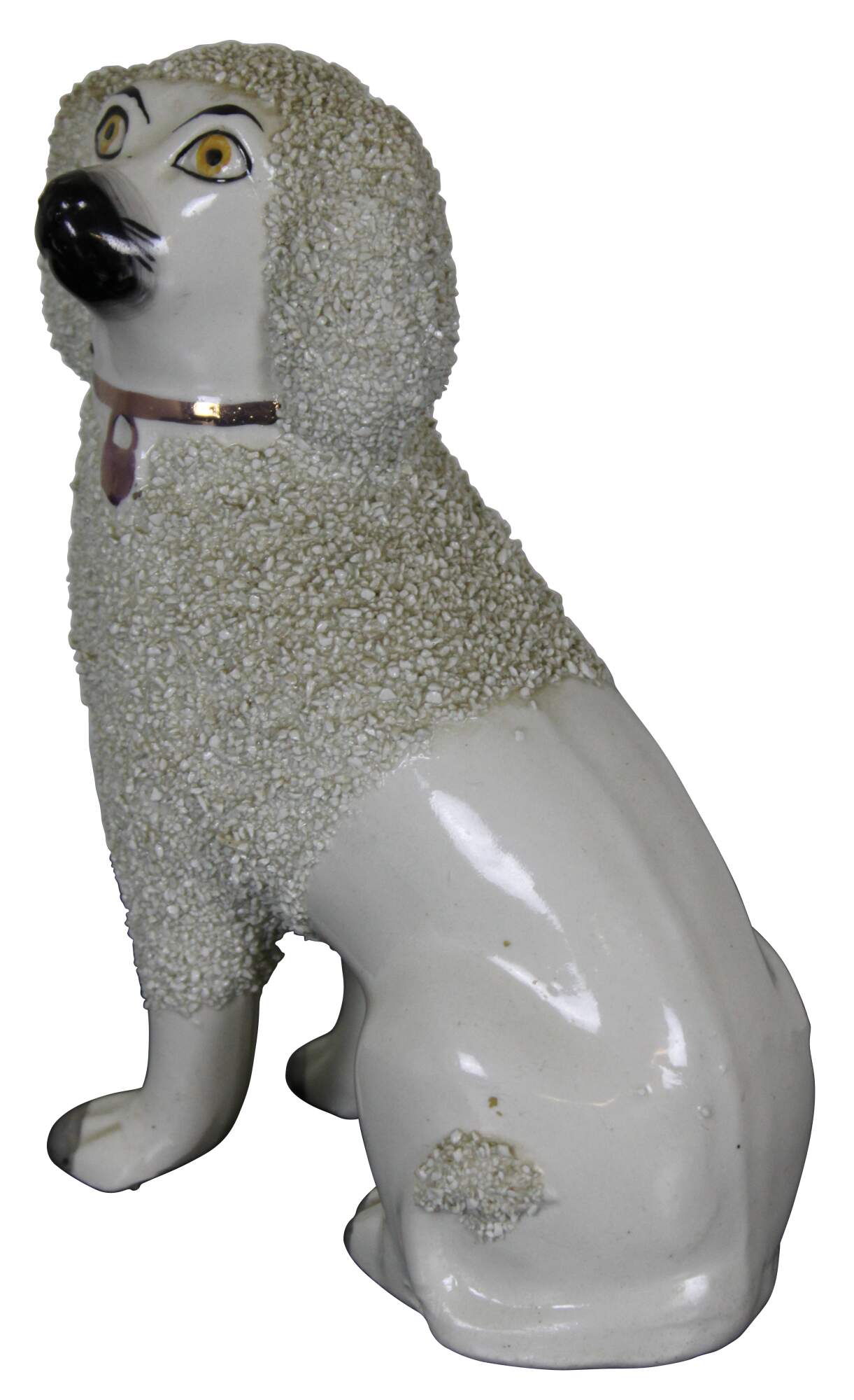 Antique 19th century Staffordshire porcelain figurine in the shape of a white poodle with “confetti” fur and metallic collar.